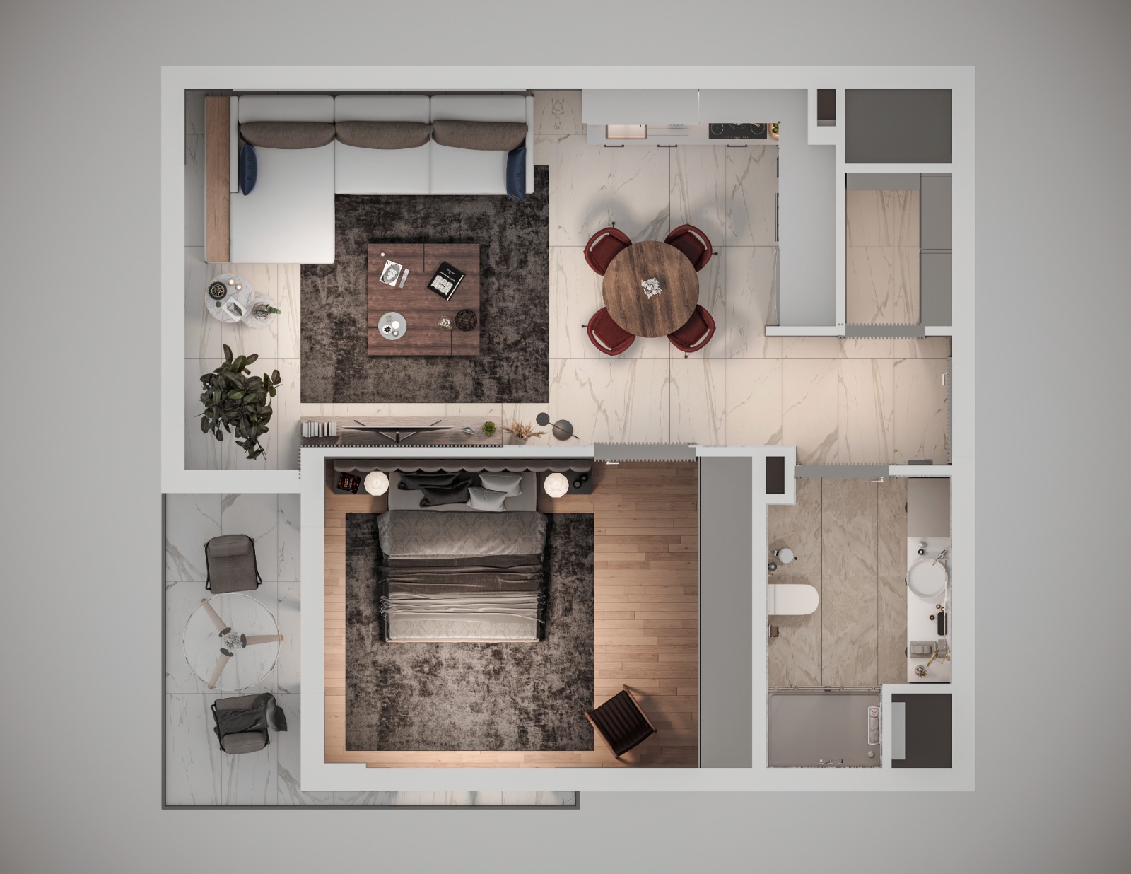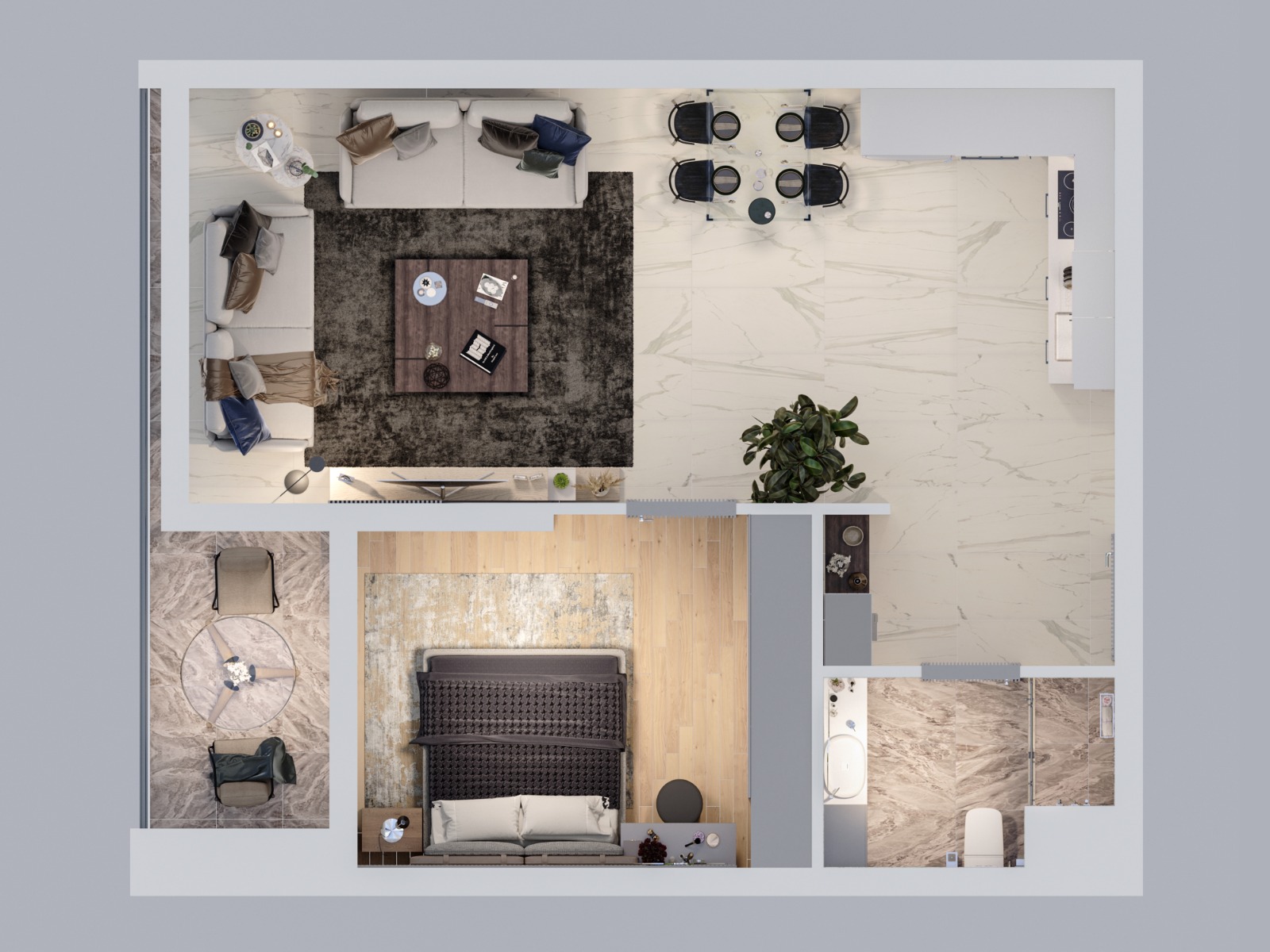 - 1-bedroom apartments are 60 m² and include a living room, an open-plan kitchen, a bathroom, and a balcony.