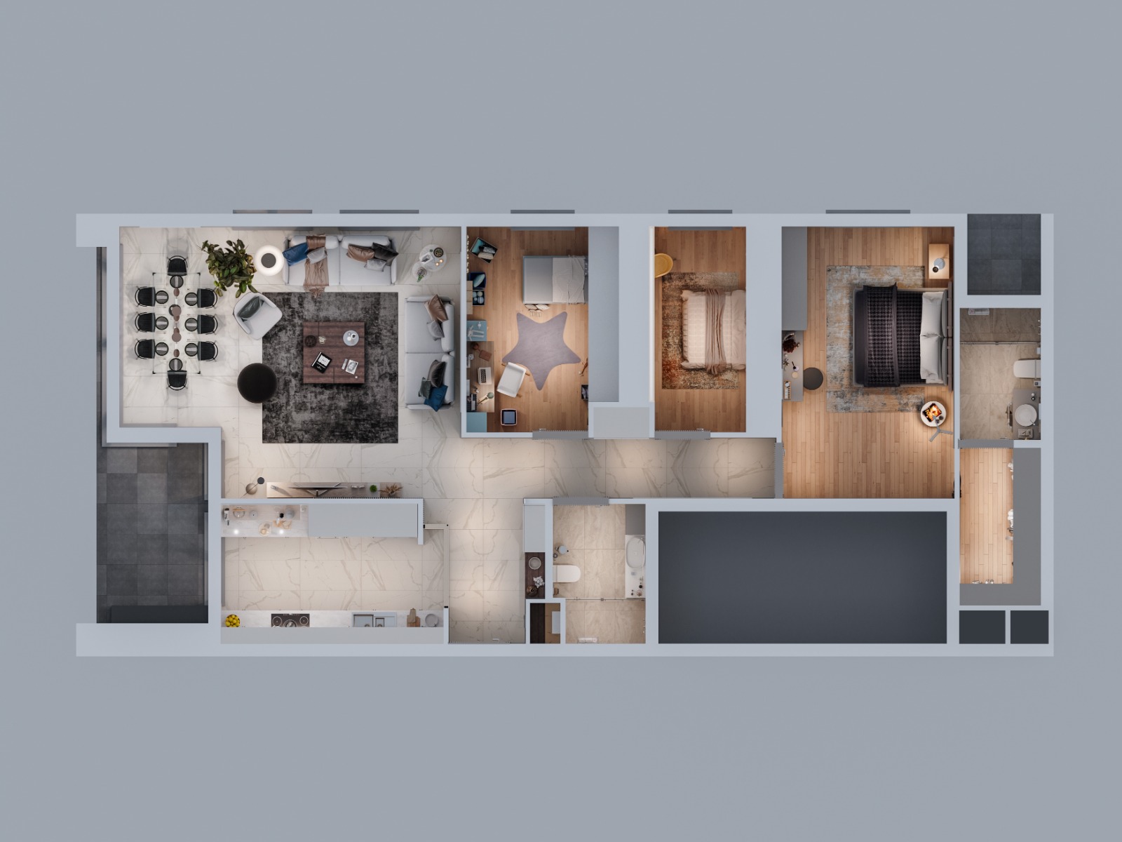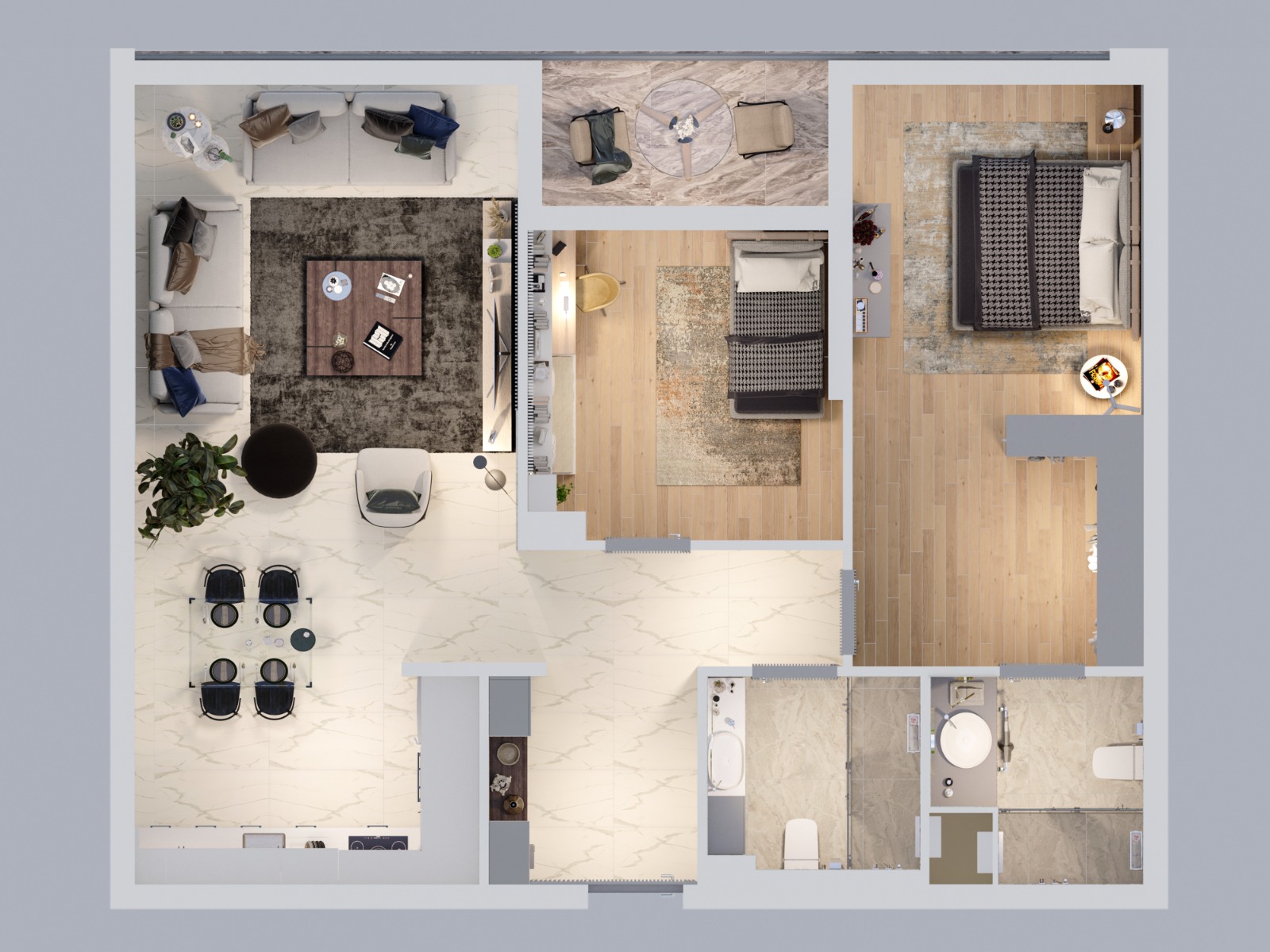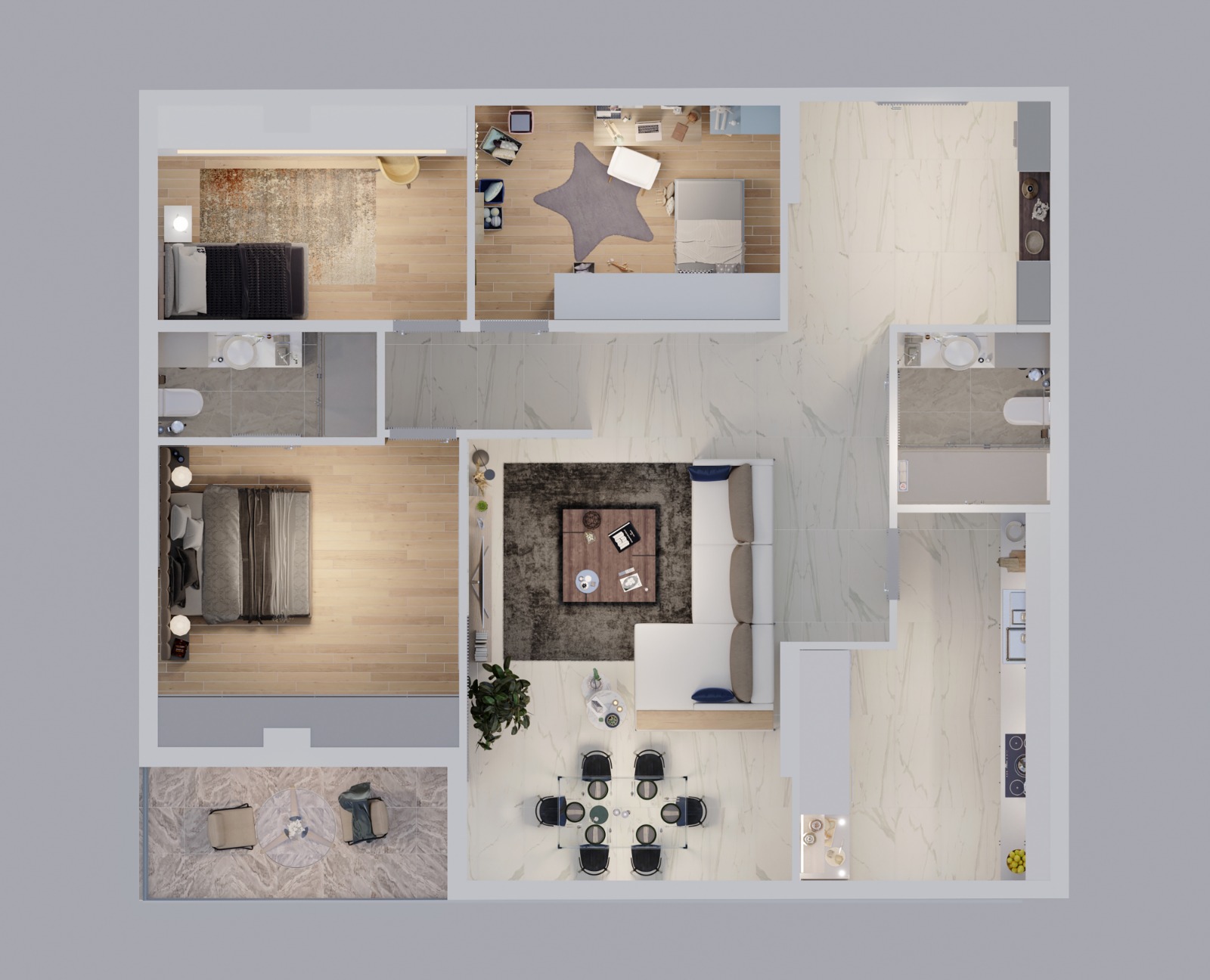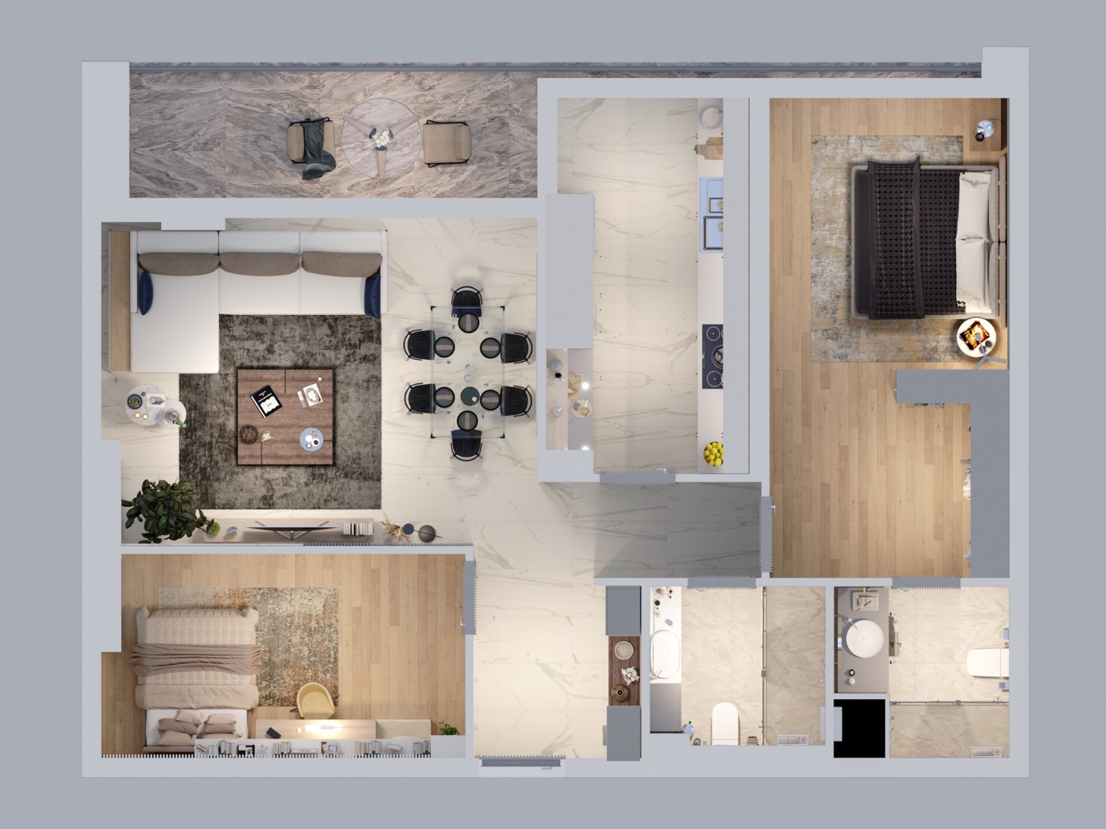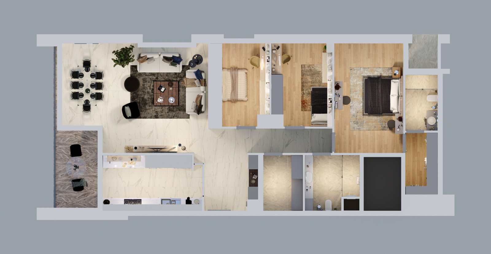 - 2-bedroom apartments are 87 m² – 103 m² and include a living room, an open-plan kitchen, an en-suite bathroom, a bathroom, and a balcony.
