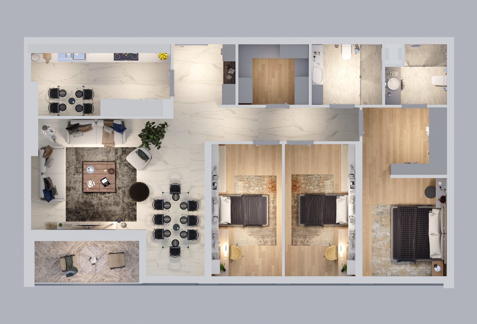 - 3-bedroom apartments are 125 m² – 142 m² and include a living room, a separate kitchen, an en-suite bathroom, a bathroom, a dressing room, and a balcony.