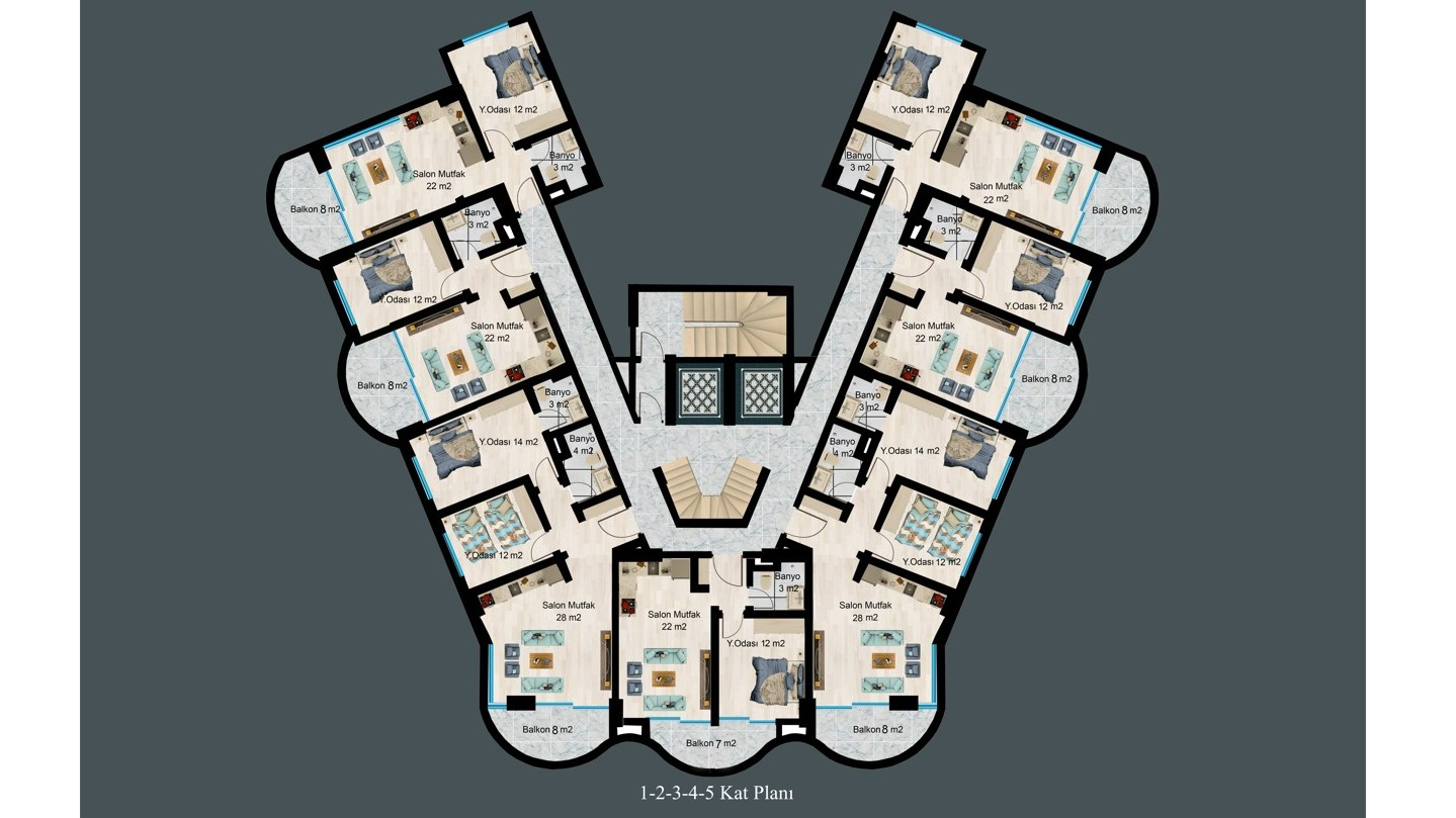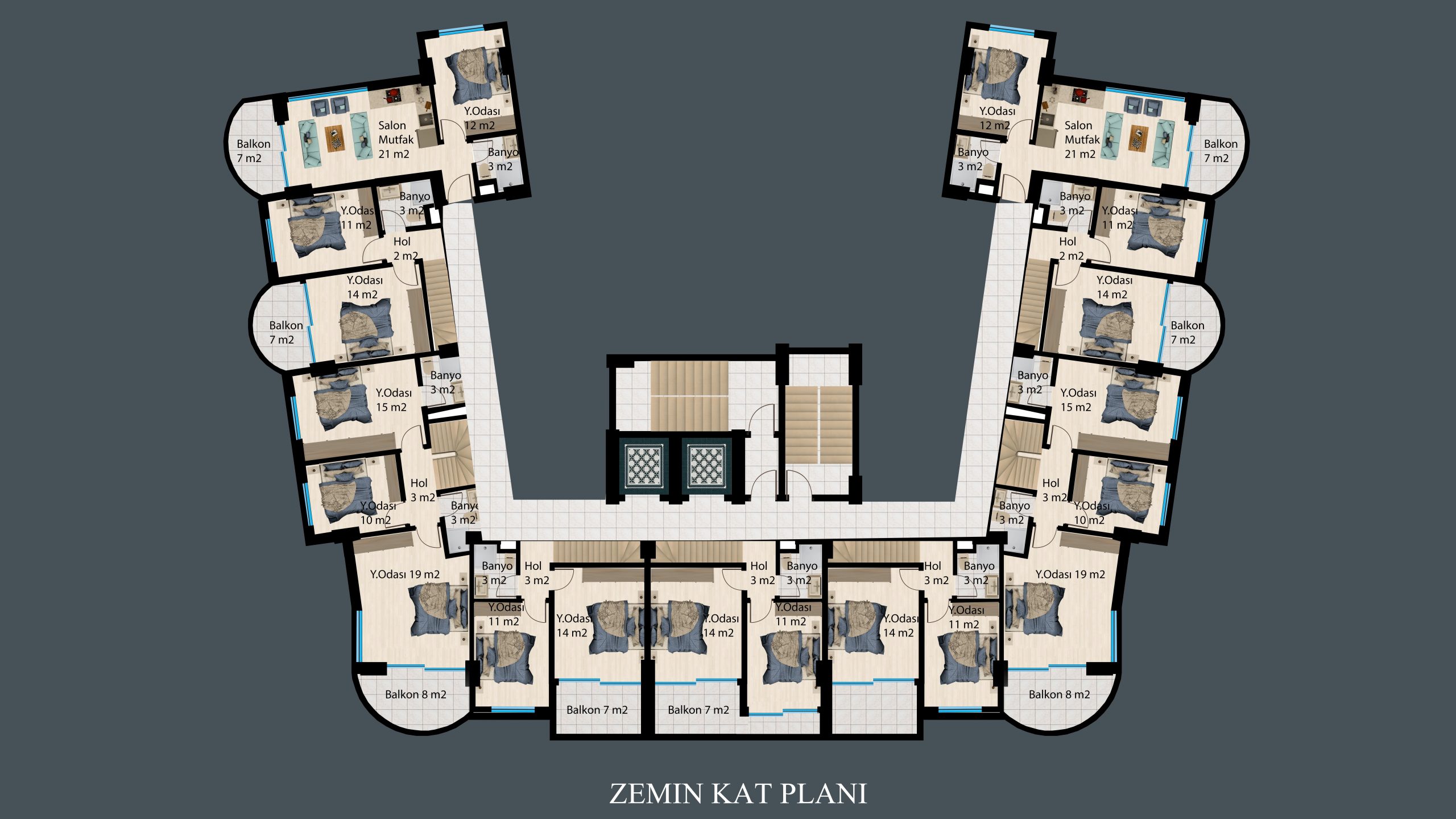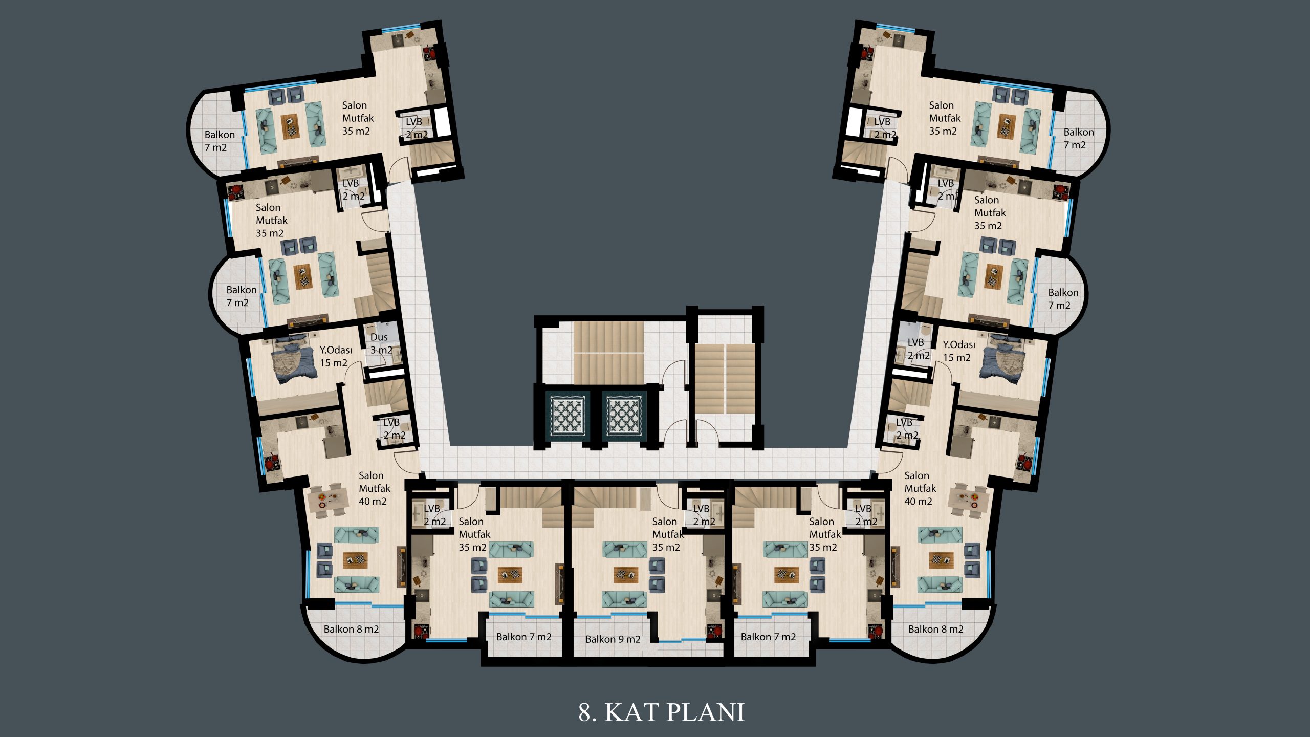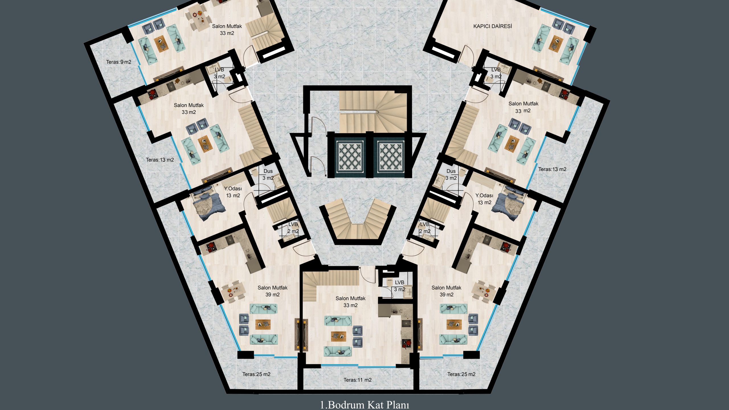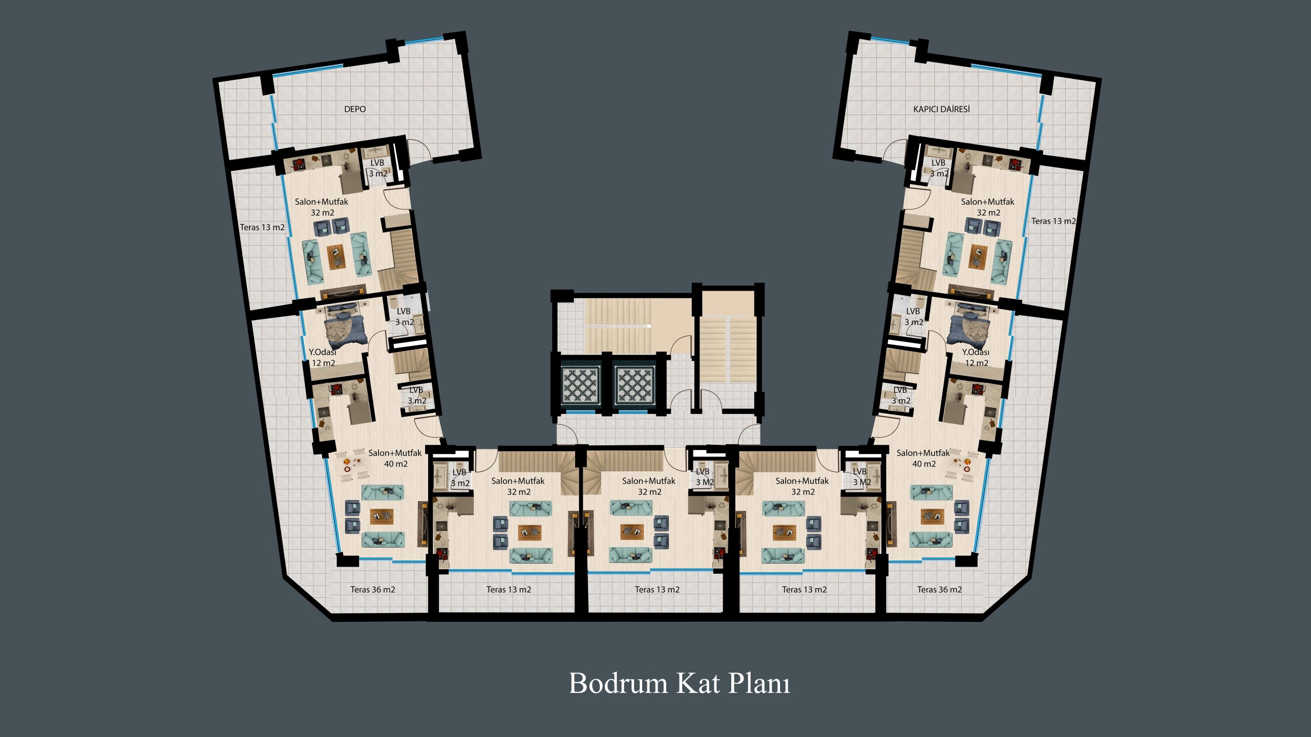 The prestigious apartments in Gazipaşa, Antalya, are equipped to satisfy the needs of a modern household with interior features such as a video intercom system, steel entrance doors, heat & water-resistant walls, ceramic flooring, spotlighting, Double Glazed PVC windows, central TV satellite system.
