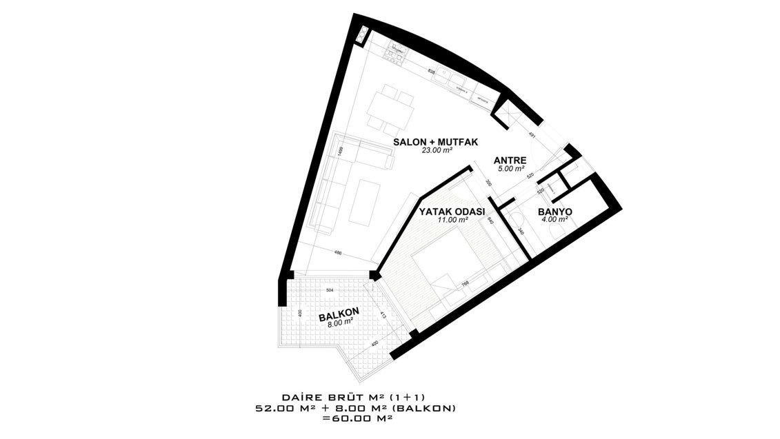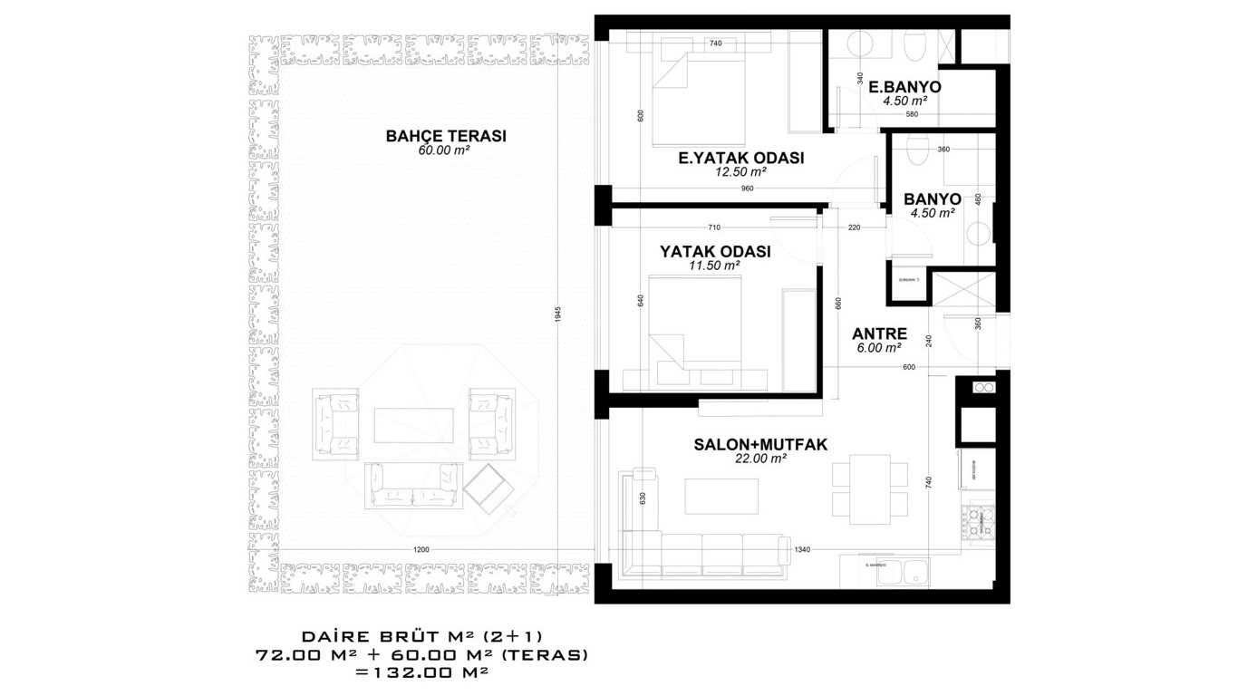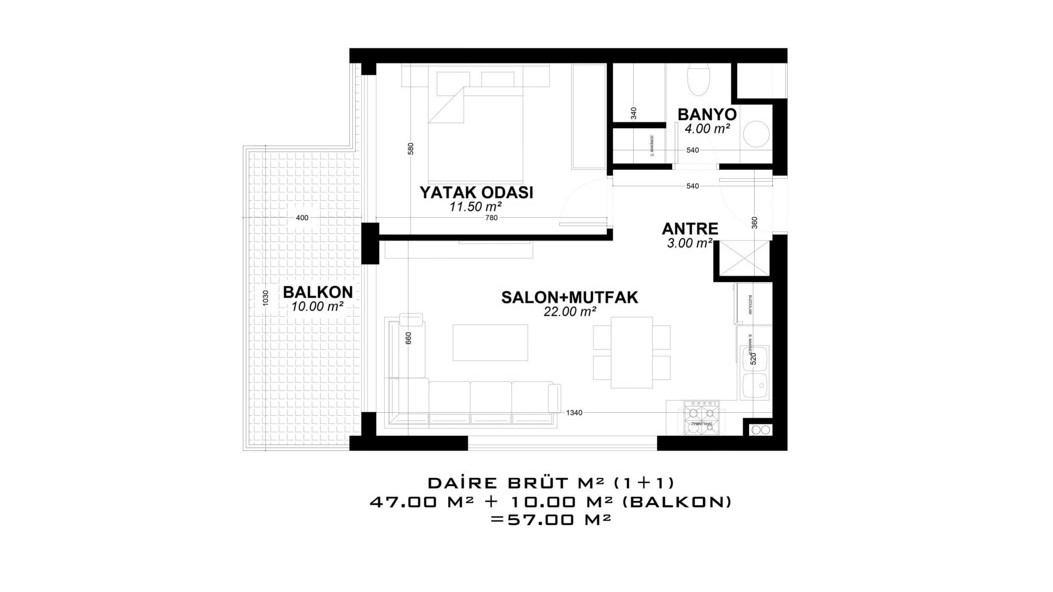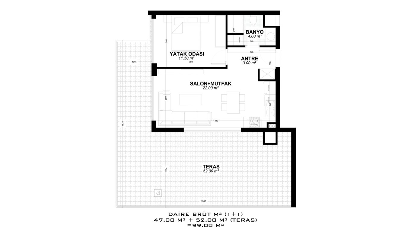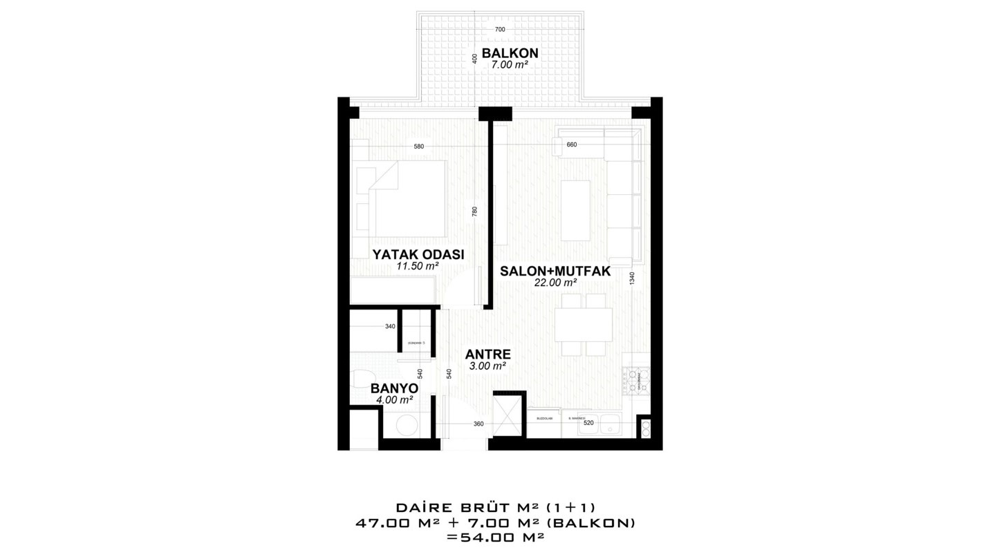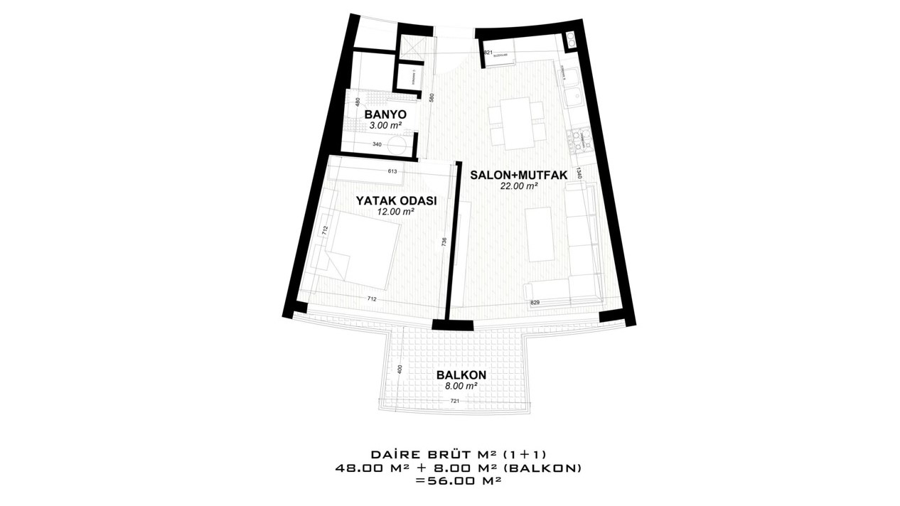 - 1 bedroom properties are 56 – 132 m² and include a living room, an open-plan kitchen, a bathroom, and a balcony. (some have a 52 m² terrace.)