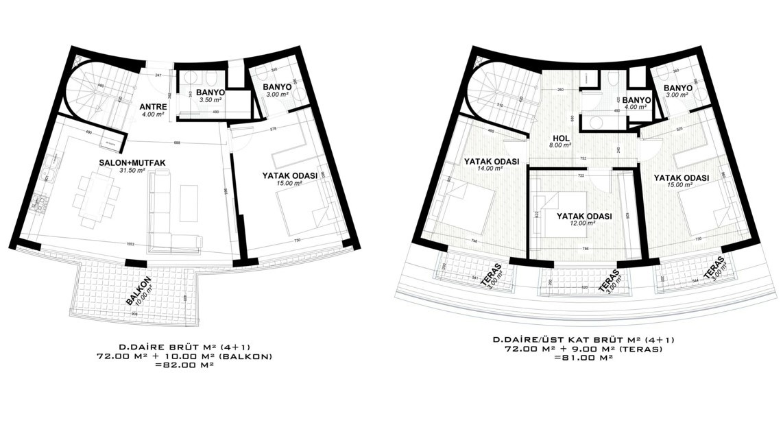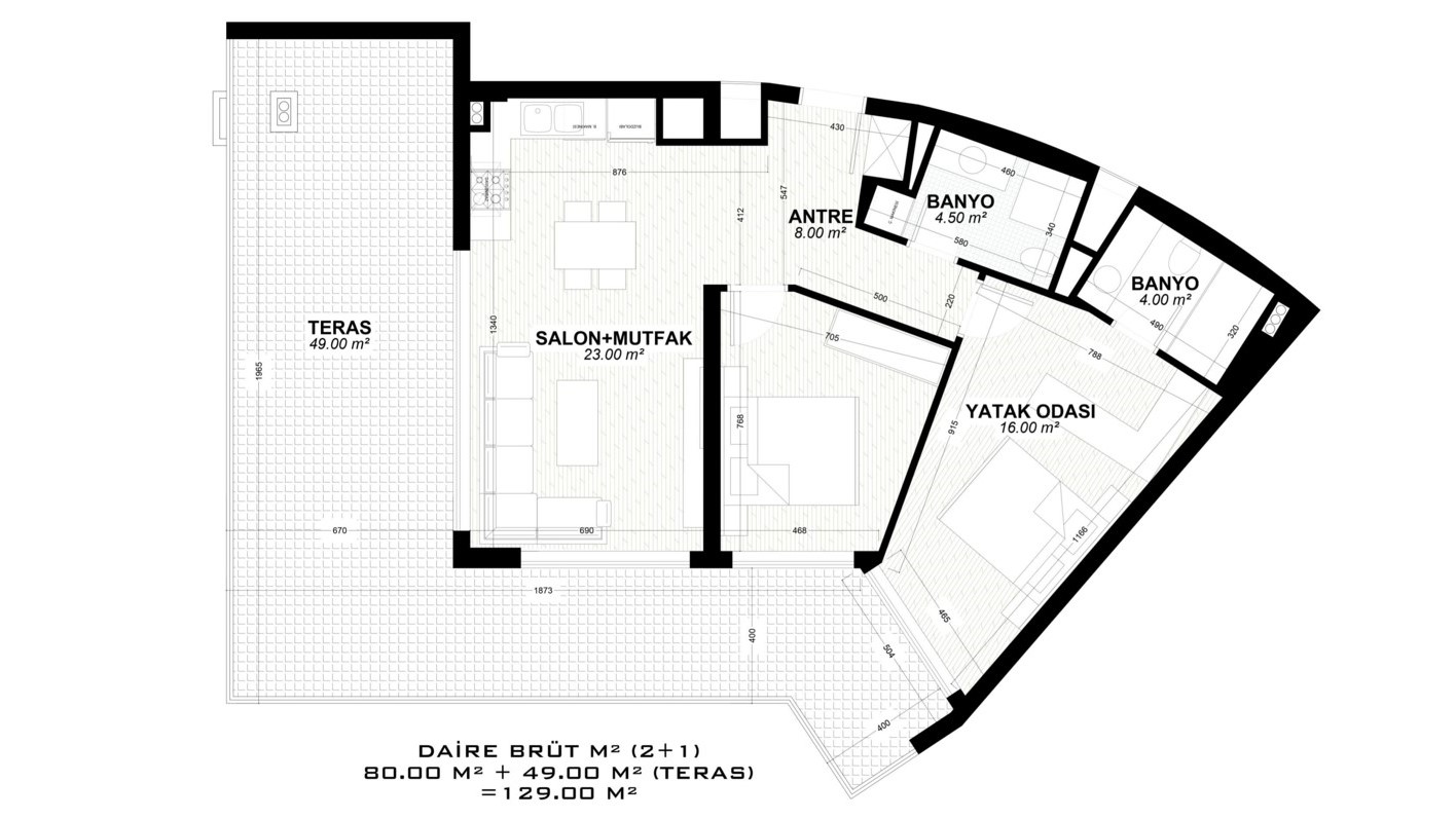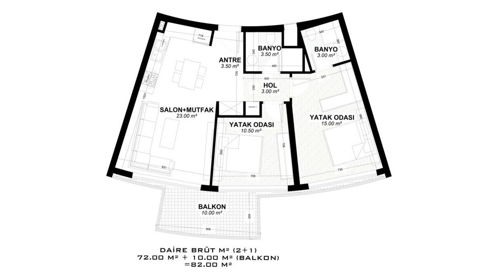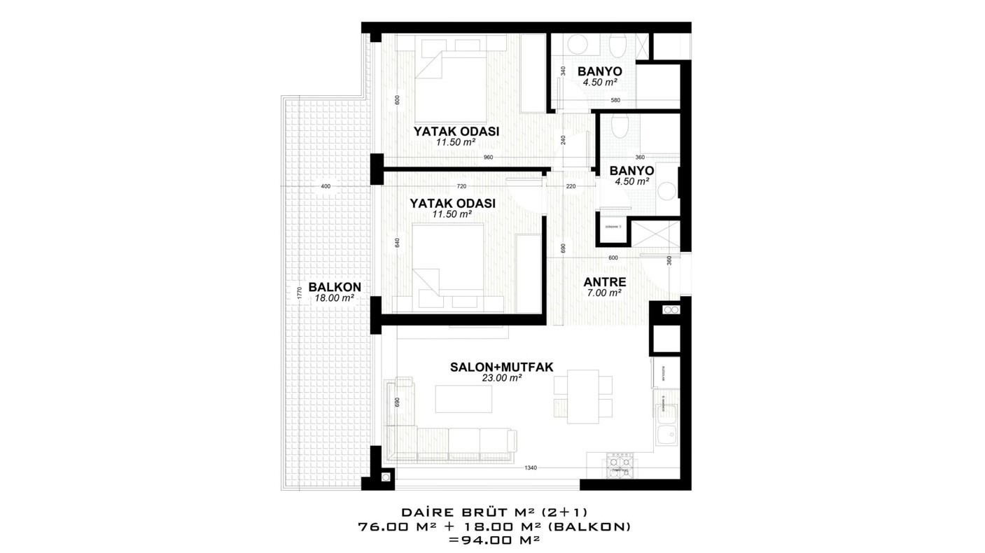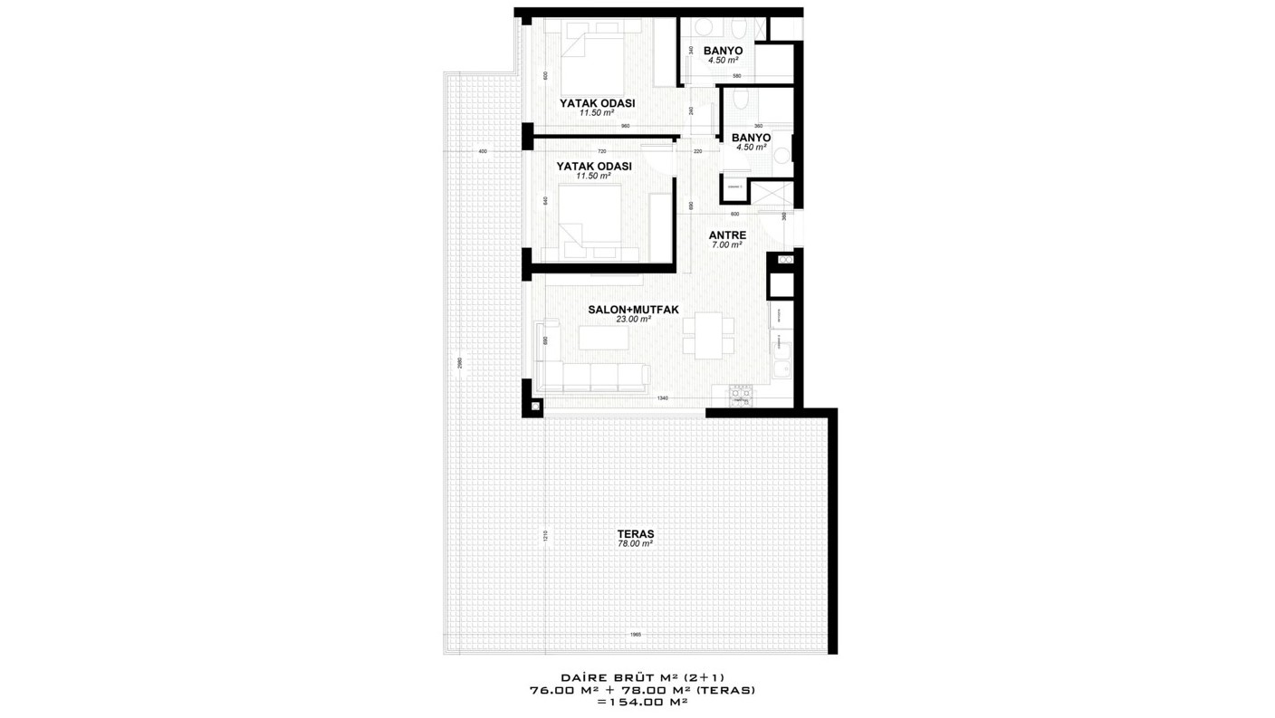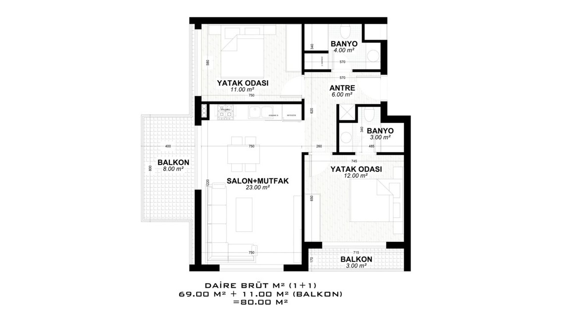 - 2 bedroom properties are 82 – 188 m² and include a living room, an open-plan kitchen, an en-suite bathroom, a general bathroom, and 1 or 2 balconies. (some have a 58 – 84 m² terrace.)