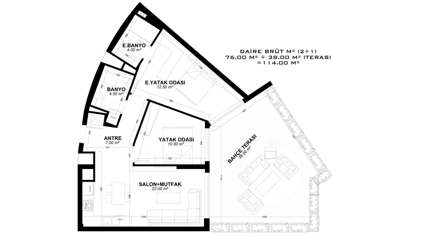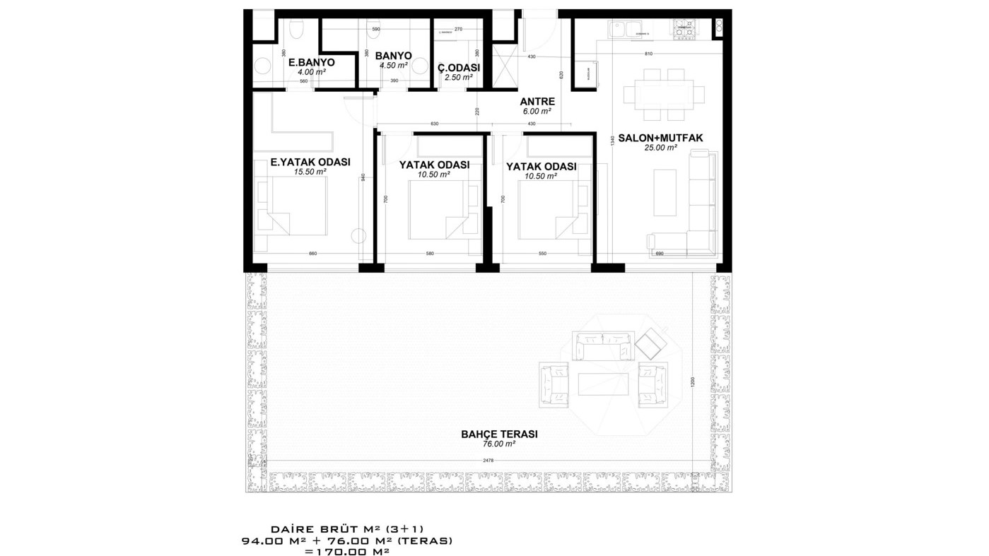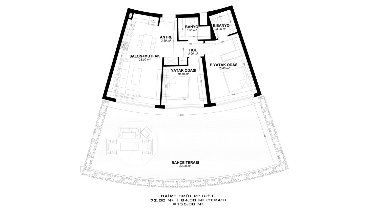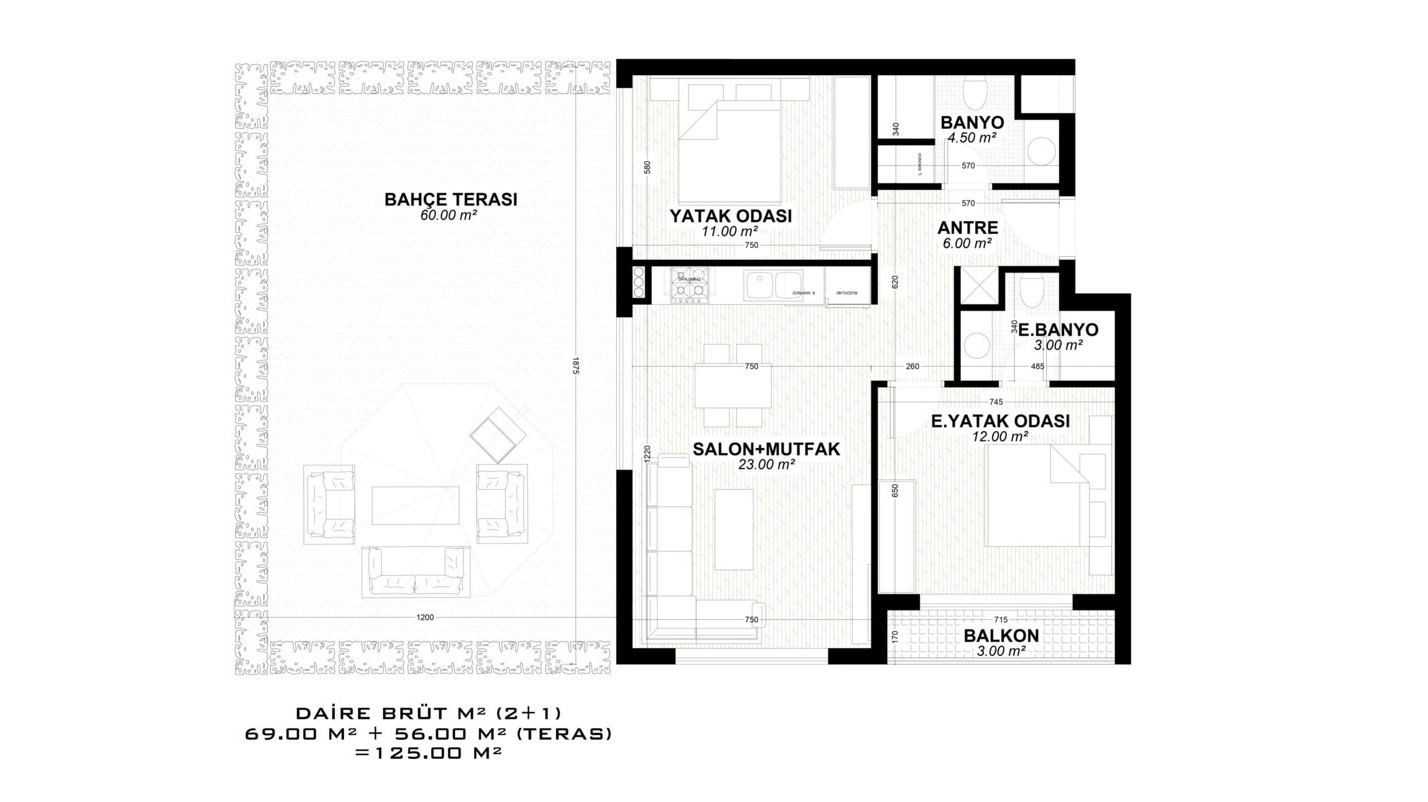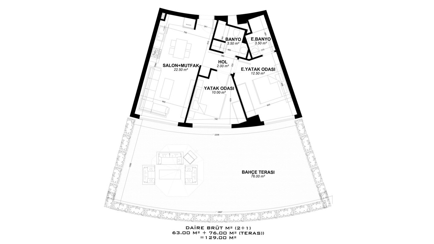 Built on a land area of 10,155 m², the unique project attracts attention and gains value in the region with its external appearance, landscaping, and architectural structure. With a total number of 265 properties, the project offers a large selection of various layouts, some of which include a choice of a terrace with access to the garden or a terrace with a private pool.