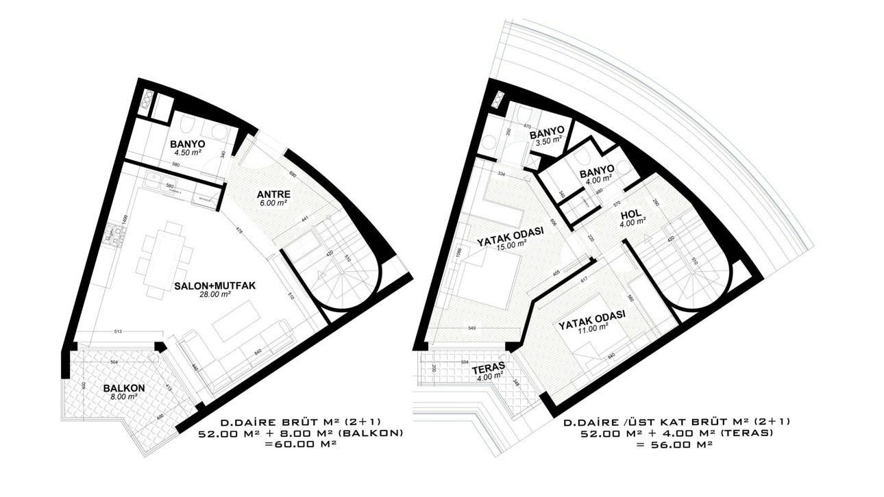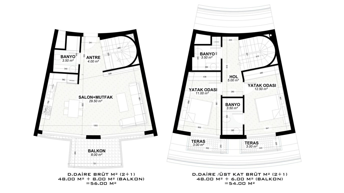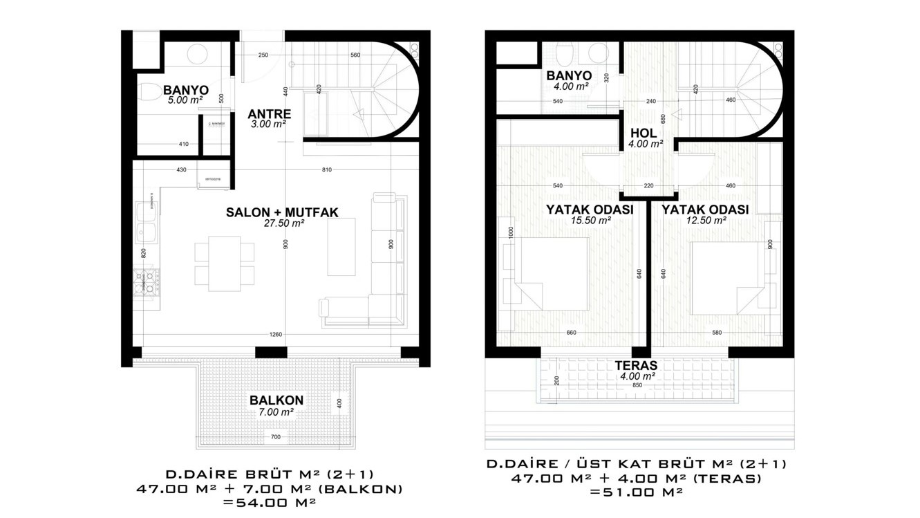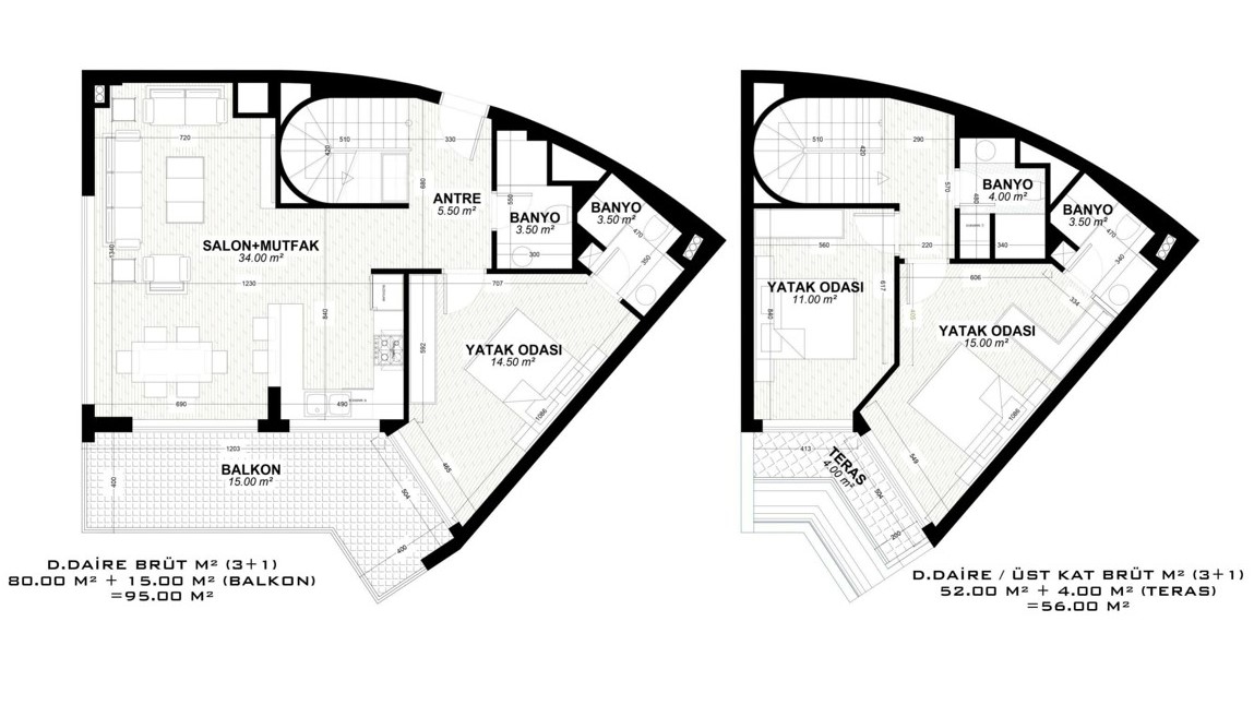 - 2 bedroom duplex properties are 105 – 151 m² and include a living room, an open-plan kitchen, an en-suite bathroom, 1 or 2 general bathrooms, and 2 or 3 balconies.