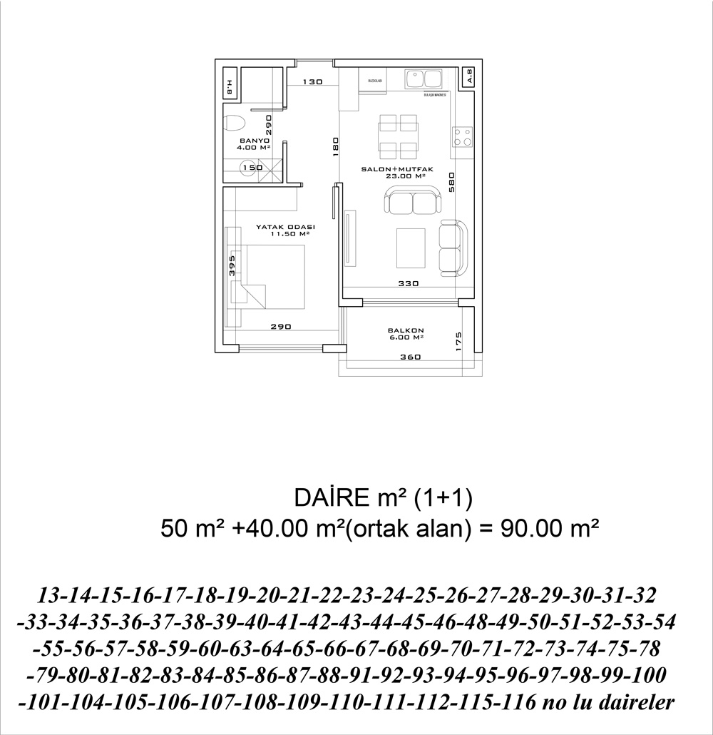 - 1 bedroom apartments are 50 m² with a living room, an open plan kitchen, a bathroom, and a balcony