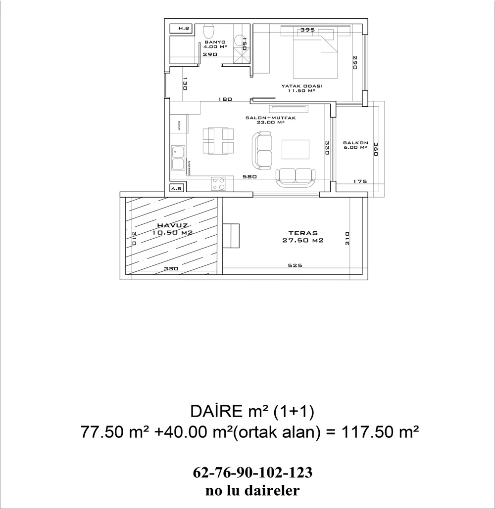 - 1 bedroom apartments are 77.5 m² – 127 m² with a living room, an open plan kitchen, a bathroom, a balcony, and a terrace with a pool