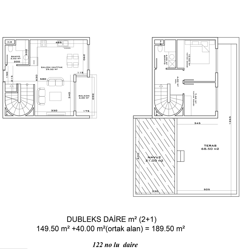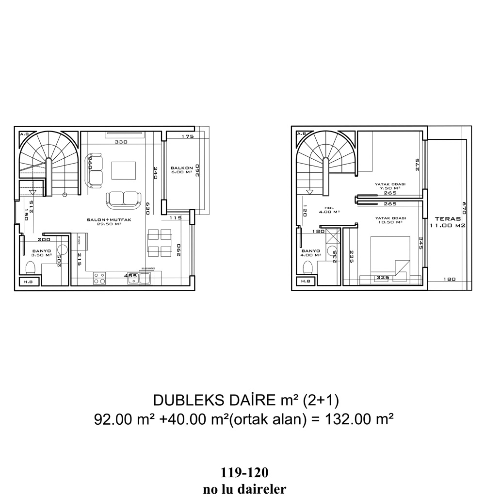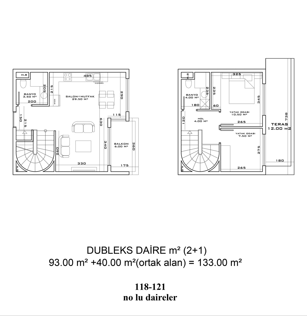 - 2 bedroom duplexes are 93 m² – 149.5 m² with a living room, an open plan kitchen, a bathroom, an en-suite bathroom, a balcony, and a terrace