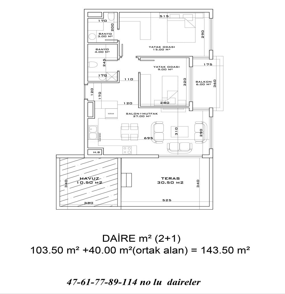 Unique residential complex is built on an 11.000 m² land area and consists of 23 shops and 123 apartments. This complex offers many facilities that will add privilege to your life such as a well-designed garden, walking paths, indoor and outdoor parking areas, lobby, reception, indoor and outdoor swimming pools, children’s pools, Aquapark, poolside bar, Turkish bath, sauna, fitness center, steam room, salt room, massage rooms, VIP SPA rooms, meeting rooms, library, bowling, billiard, dart, langırt, PlayStation, cinema room, BBQ area, mini club, children’s playground area, solar panels, free beach entrance with a VIP card, generator, caretaker, 24/7 security camera system, security, shuttle service to the private beach, shopping malls and airport as well as concierge services (hospitality, housekeeping, dry cleaning, carpet cleaning, technical service, VIP transfer, rent a car, courier service, veterinarian and doctor)