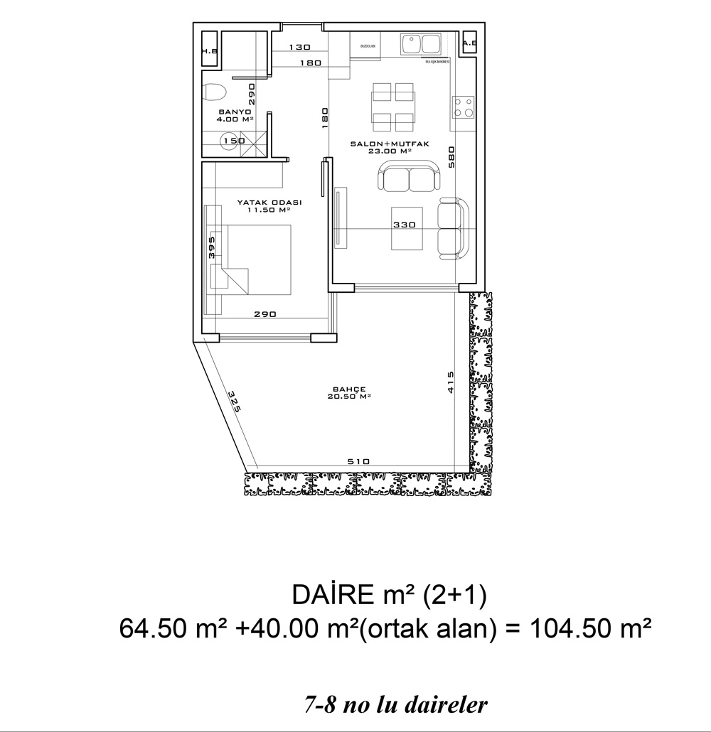 - 1 bedroom ground apartments are 64.5 m² with a living room, an open plan kitchen, a bathroom and a garden