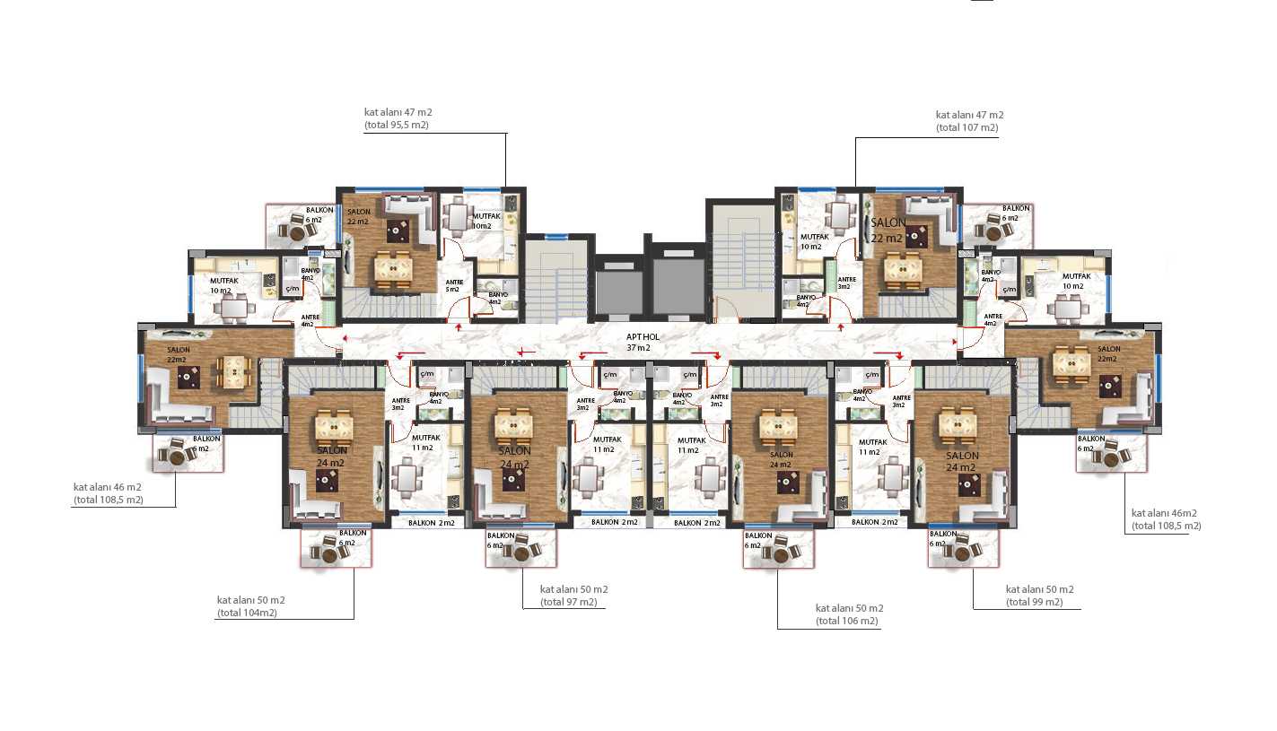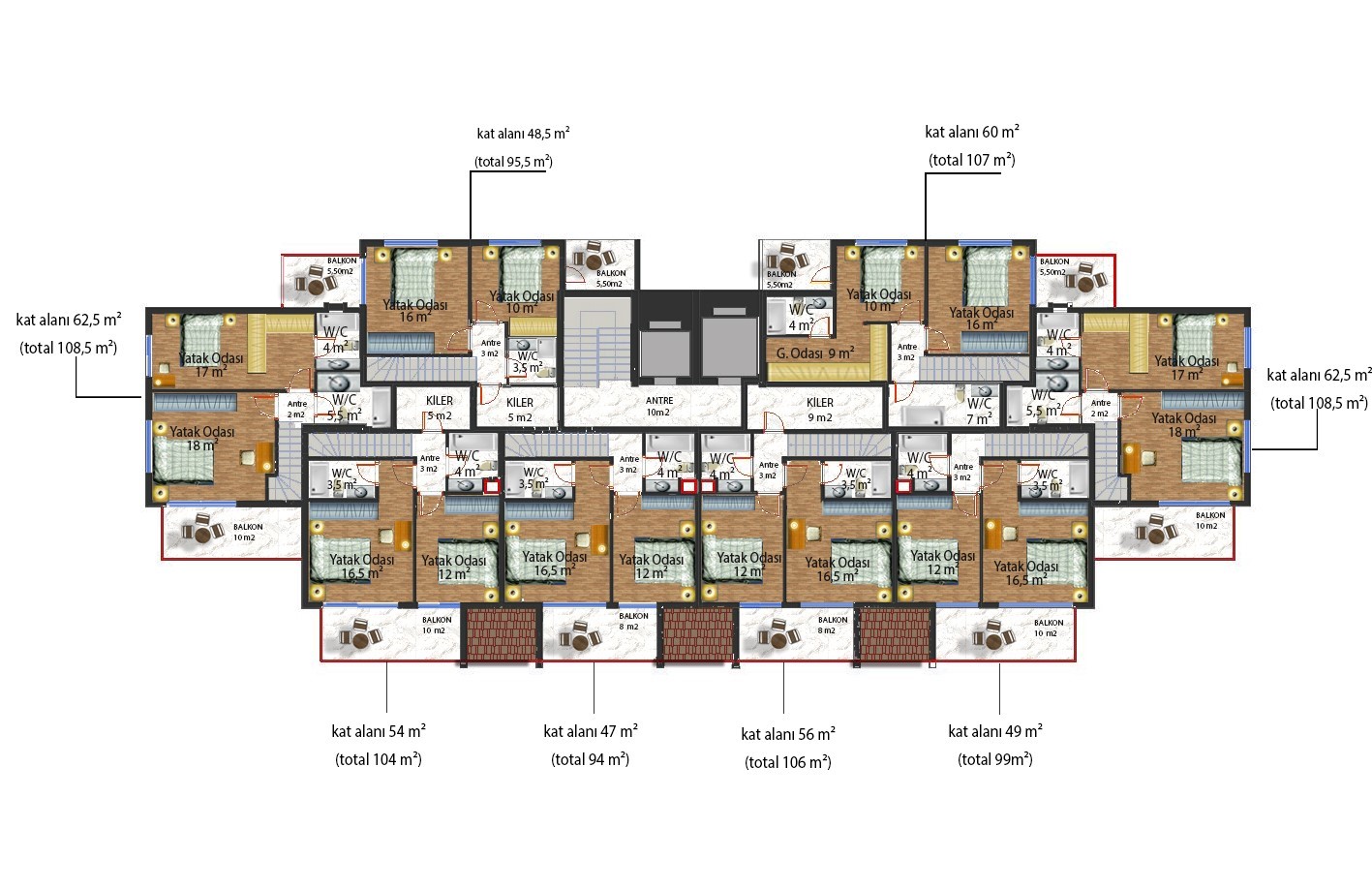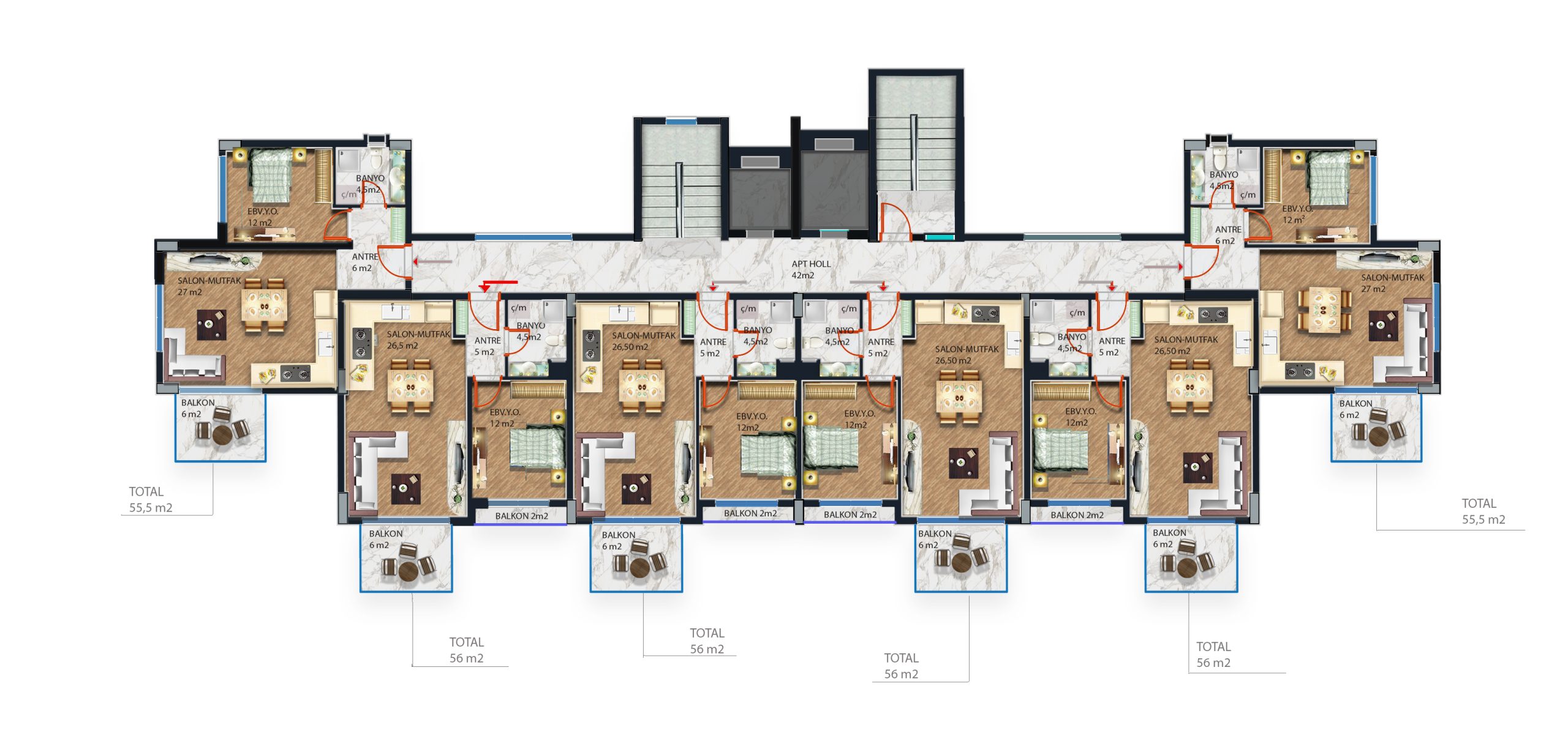 Built on a land area of 5335 m2, the residential complex consists of 2 blocks and a total of 96 flats designed as 1+1 and 2+1. Here, you can have a joyful time with the various facilities offered by the complex, such as a well-designed garden, camellias, walking paths, fitness center, Turkish bath, SPA, sauna, swimming pool, children’s pool, indoor playground areas, basketball field, caretaker, car parking area, generator, 24/7 security camera system, and security.