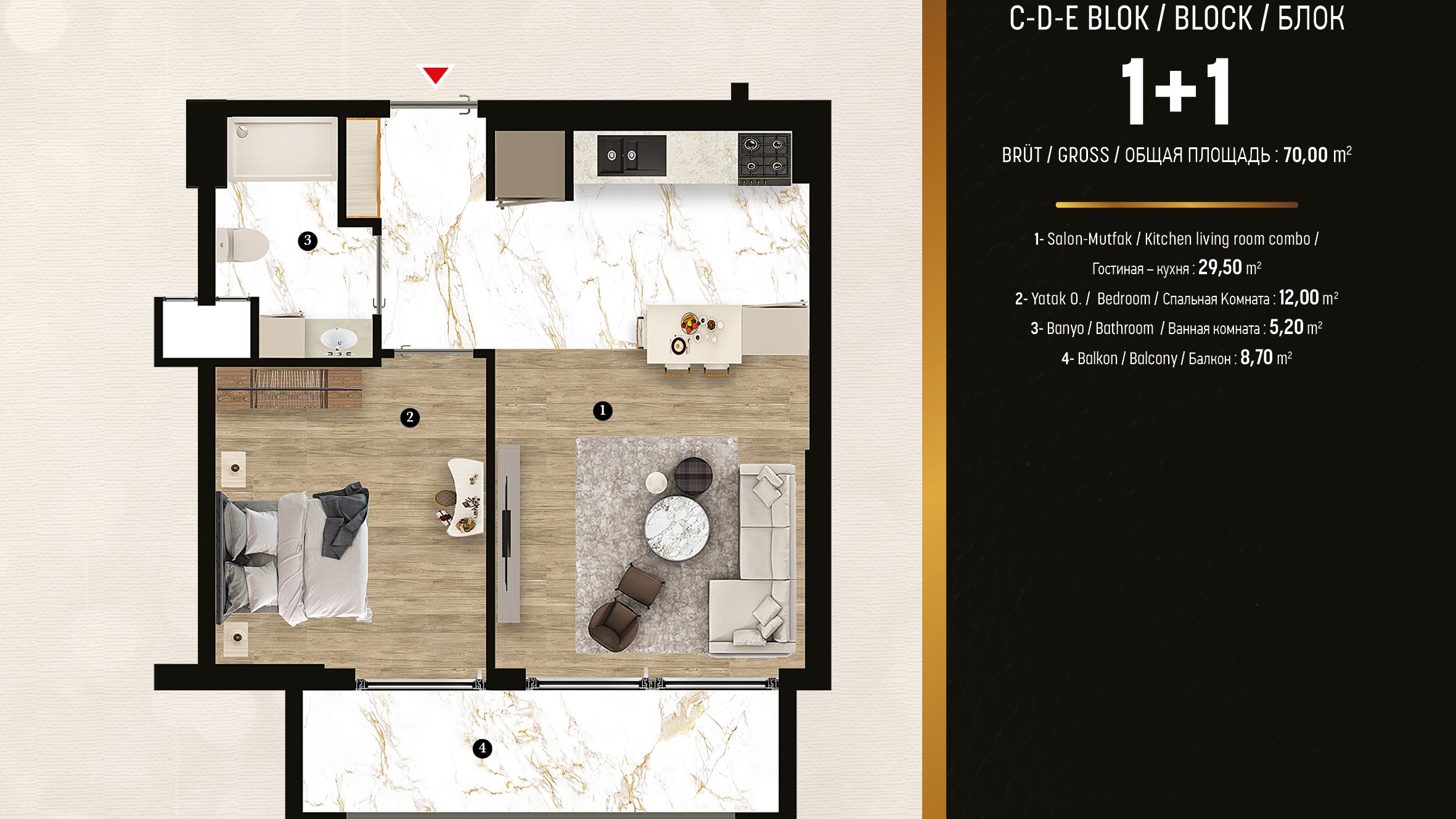 - 1+1 apartments are 70 m² and include a living room, an open-plan kitchen, a bedroom, a bathroom, and a balcony.
