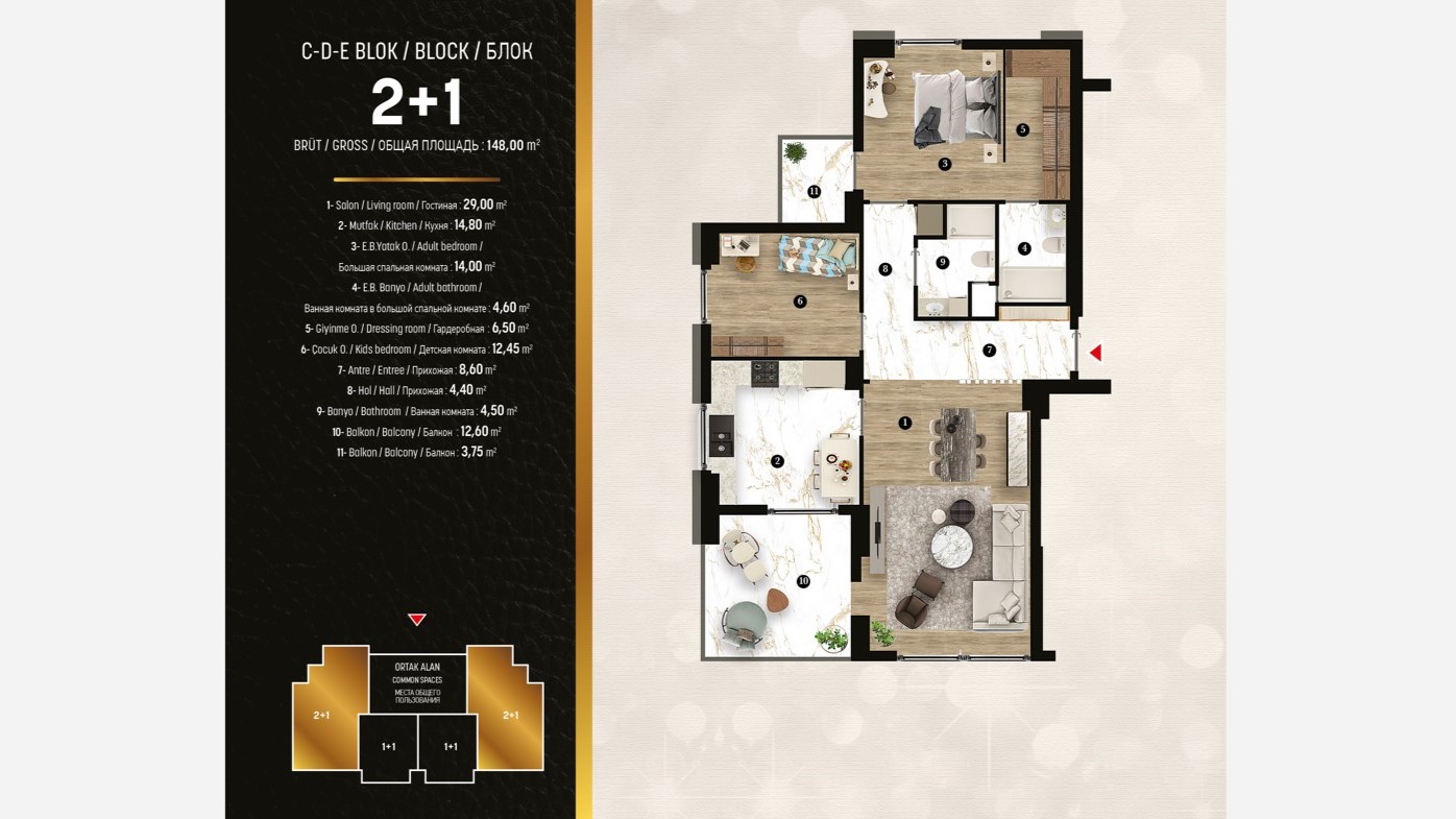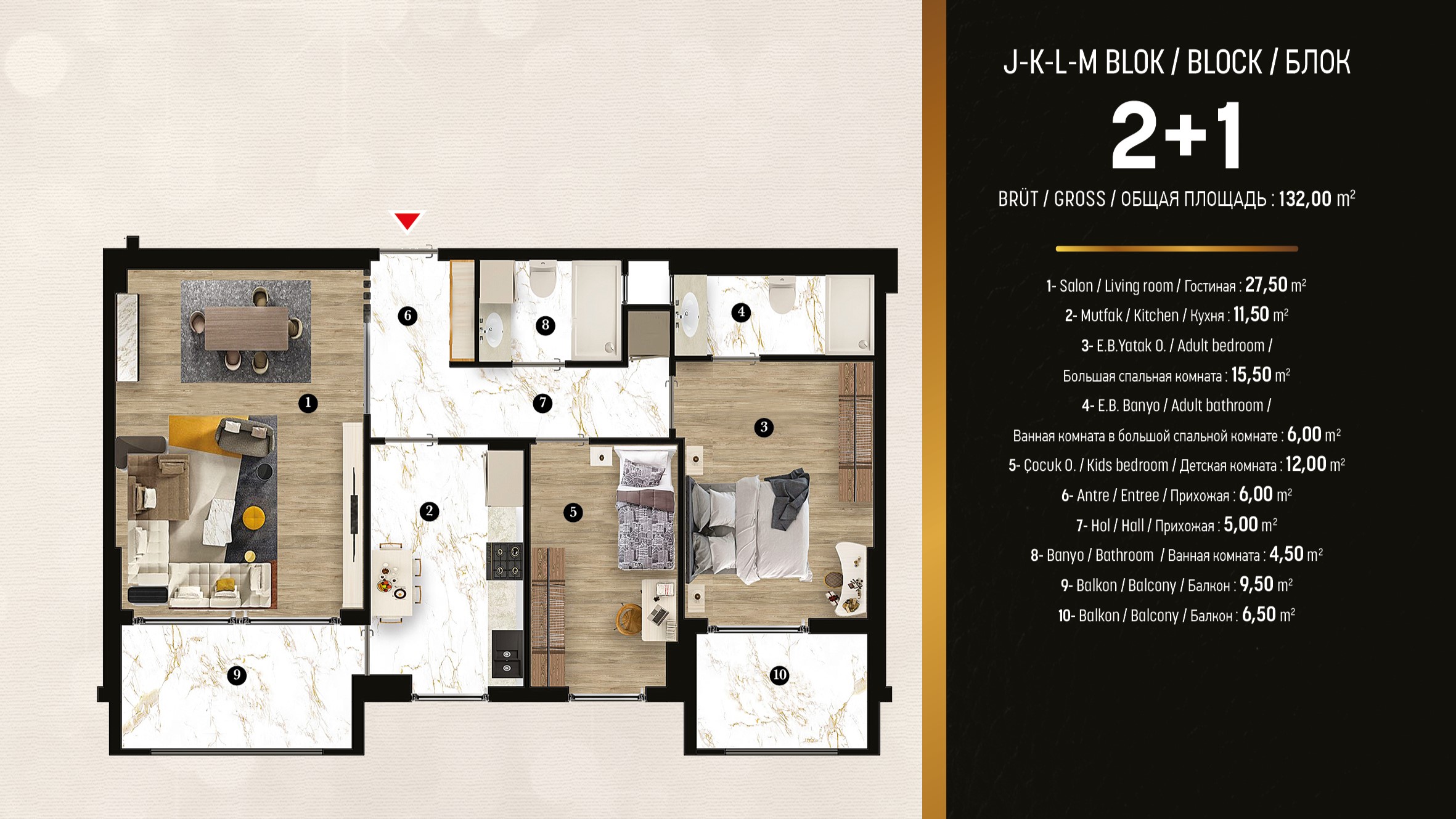 - 2+1 apartments are 132 m² – 148 m² and include a living room, a separate kitchen, 2 bedrooms, a bathroom, an en-suite bathroom, and 2 balconies.