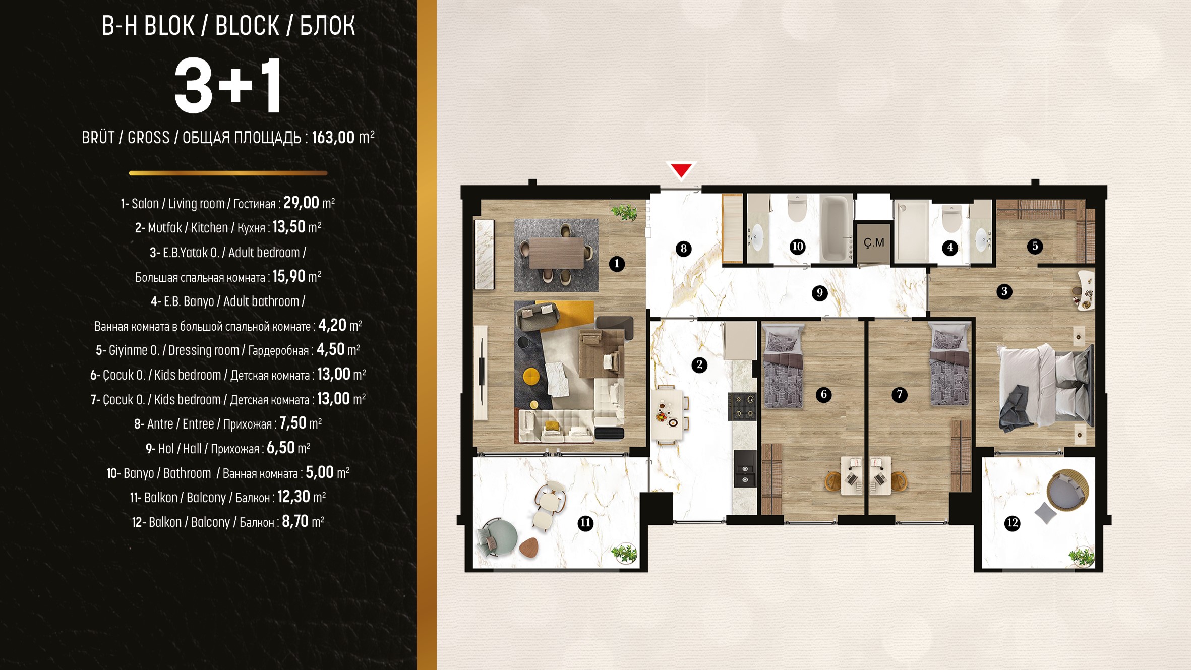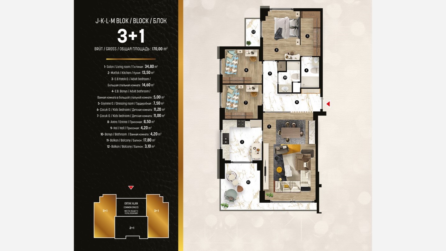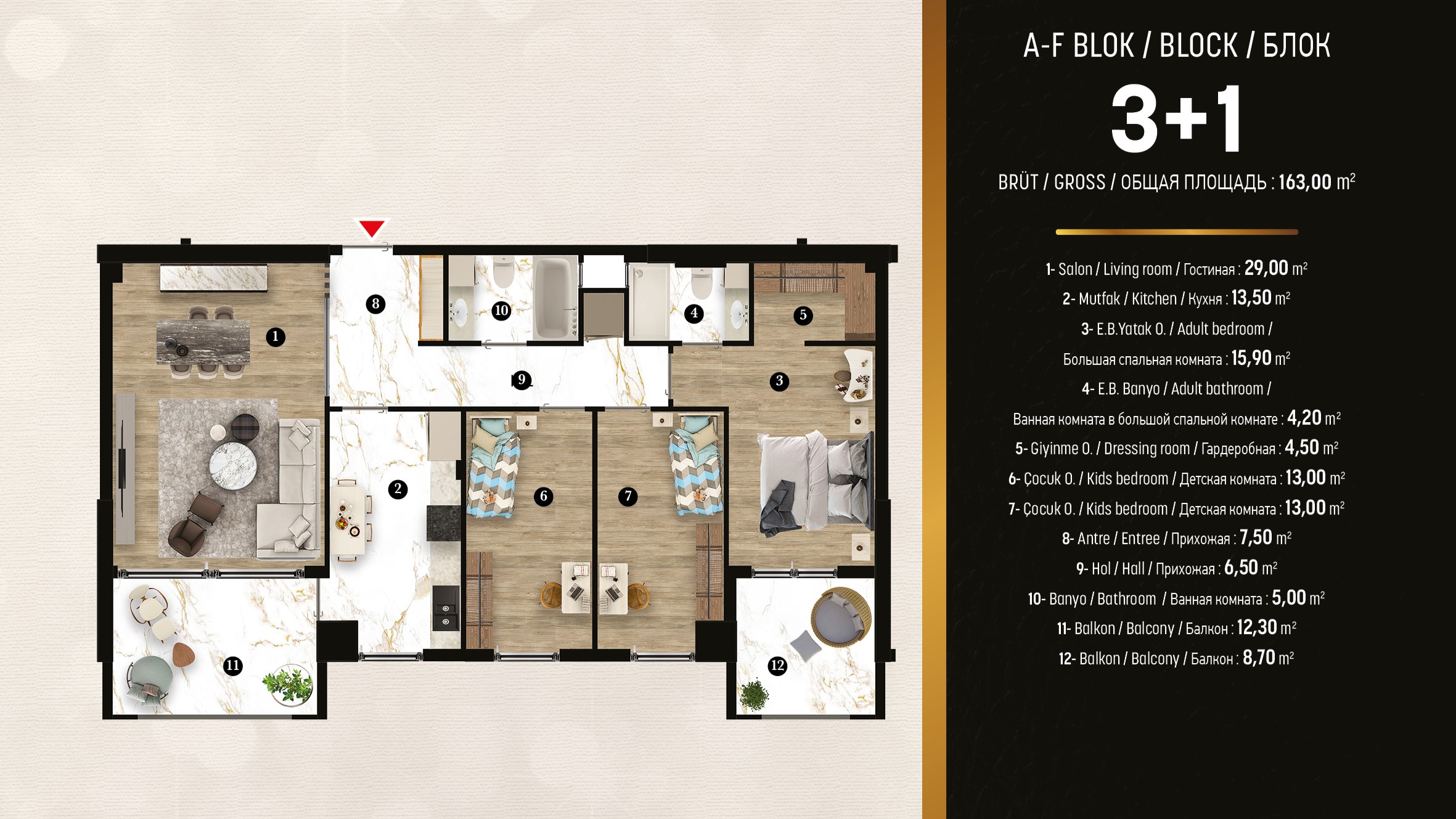 - 3+1 apartments are 163 m² – 170 m² and include a living room, a separate kitchen, 3 bedrooms, a dressing room, a bathroom, an en-suite bathroom, and 2 balconies.