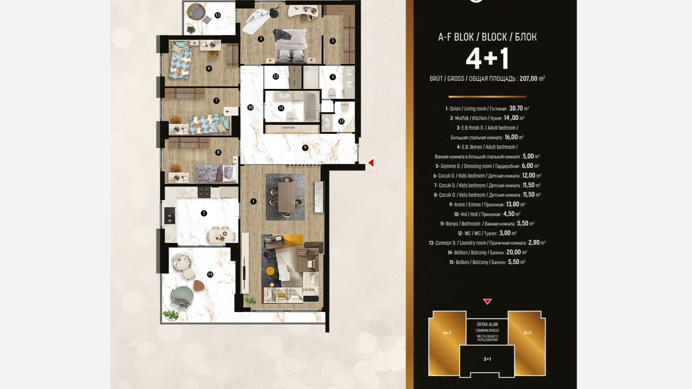 - 4+1 apartments are 207 m² and include a living room, a separate kitchen, 4 bedrooms, a dressing room, a laundry room, a bathroom, an en-suite bathroom, a WC, and 2 balconies.