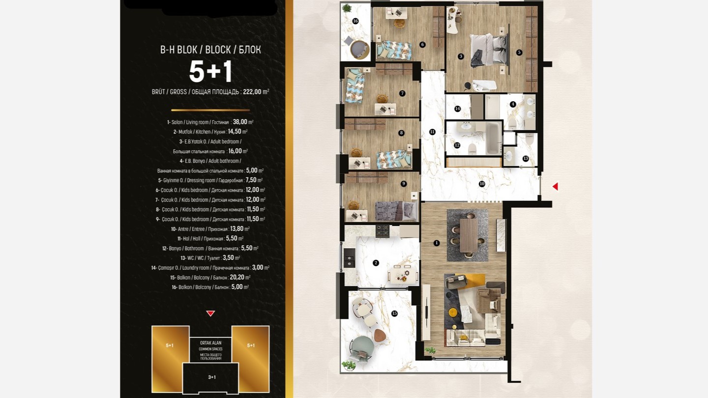 - 5+1 apartments are 222 m² and include a living room, a separate kitchen, 5 bedrooms, a dressing room, a laundry room, a bathroom, an en-suite bathroom, a WC, and 2 balconies.