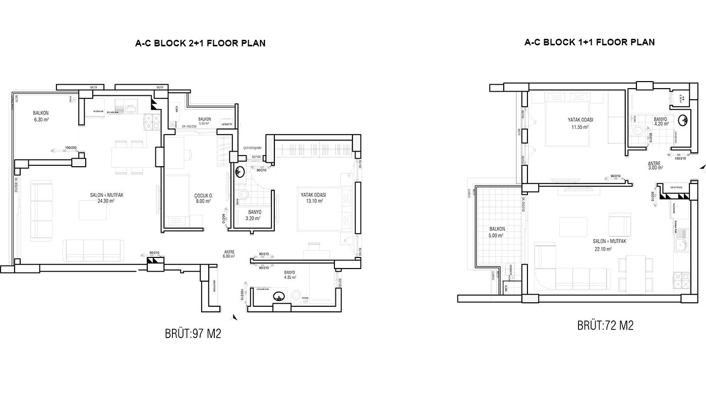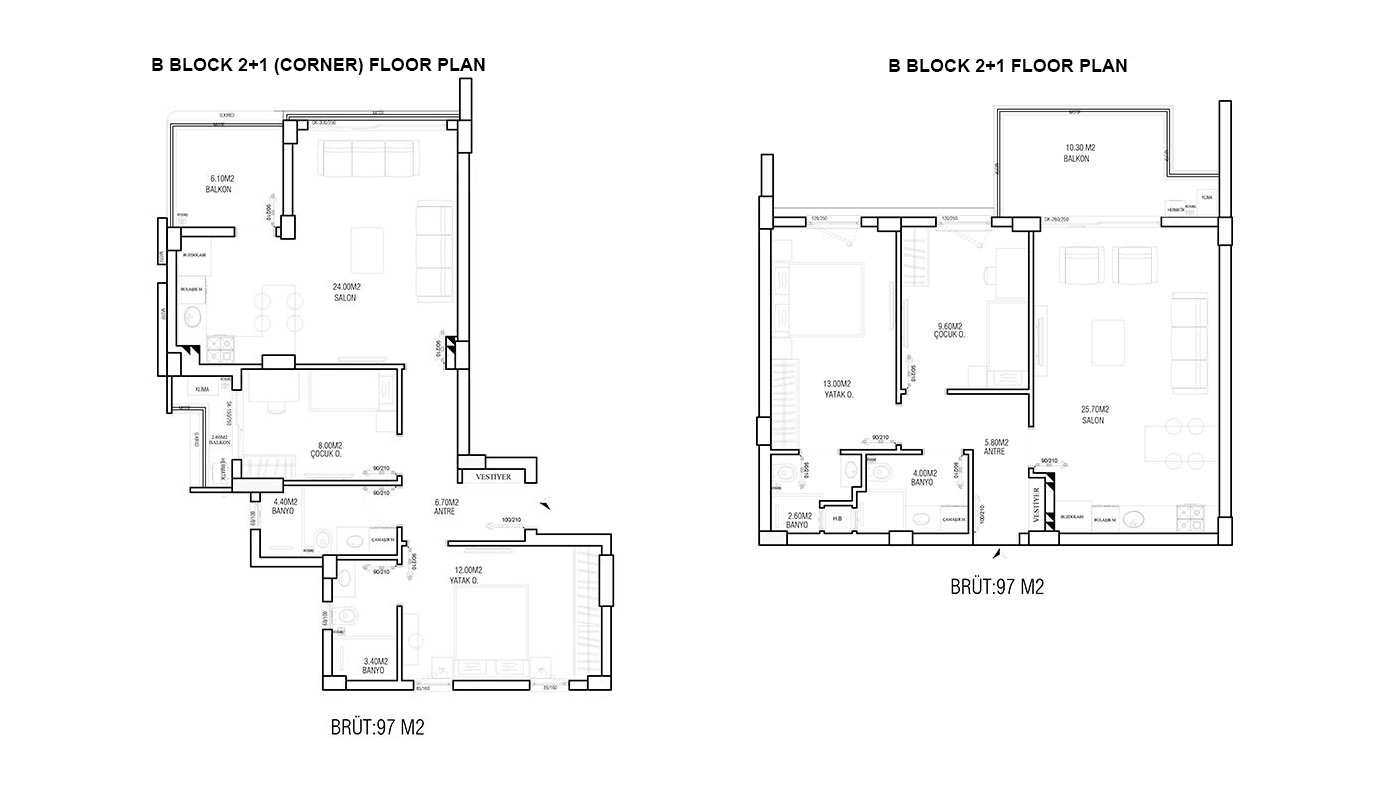 - 2 bedroom apartments are 97 m² with a living room, an open-plan kitchen, an en-suite bathroom, a bathroom, and 2 balconies