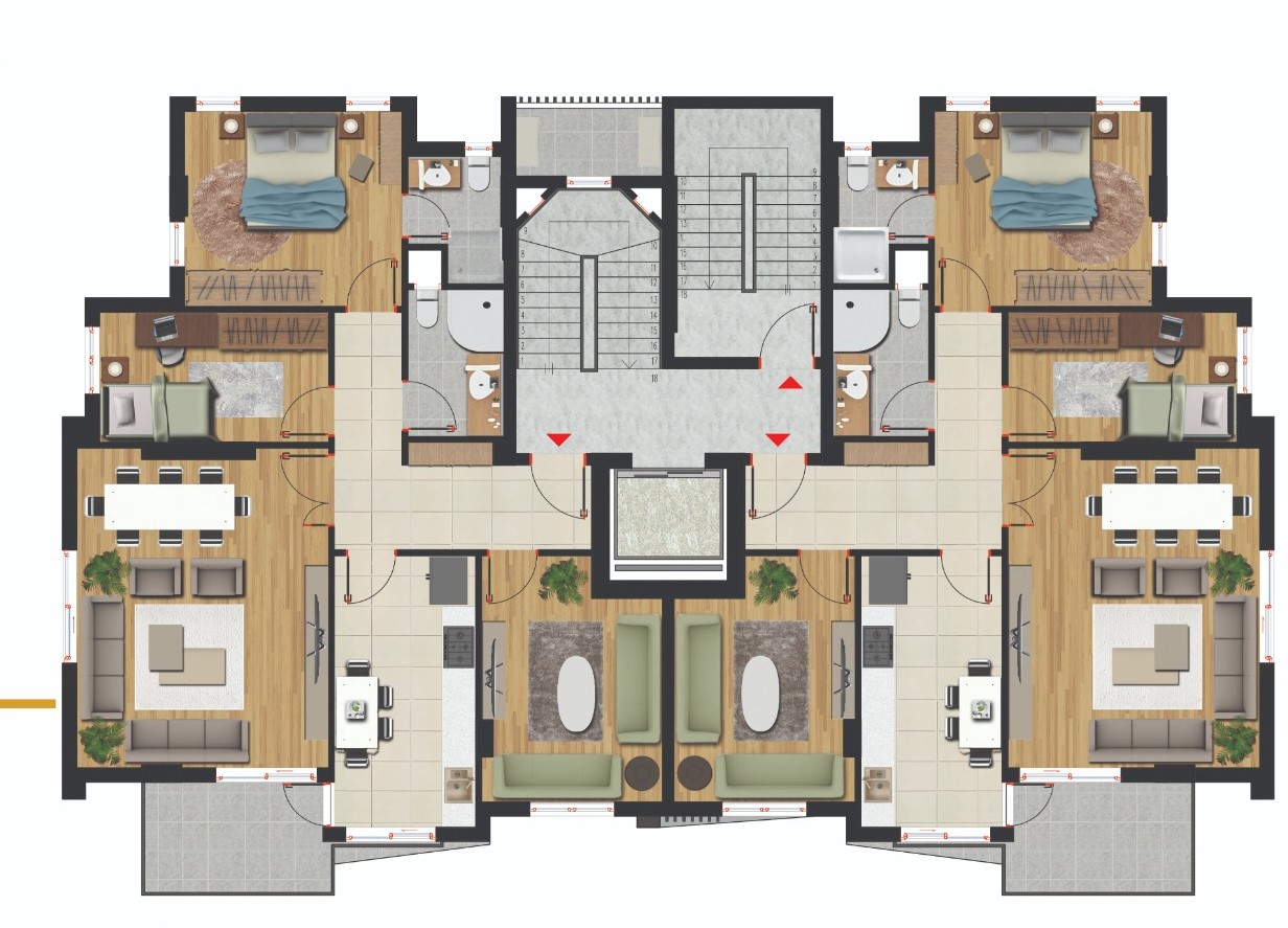 Flats are produced with high-quality materials and workmanship that consist of compliance with earthquake regulations, heat insulation, natural gas infrastructure, air conditioning, built-in kitchen appliances, internet infrastructure, satellite TV installation, and more.