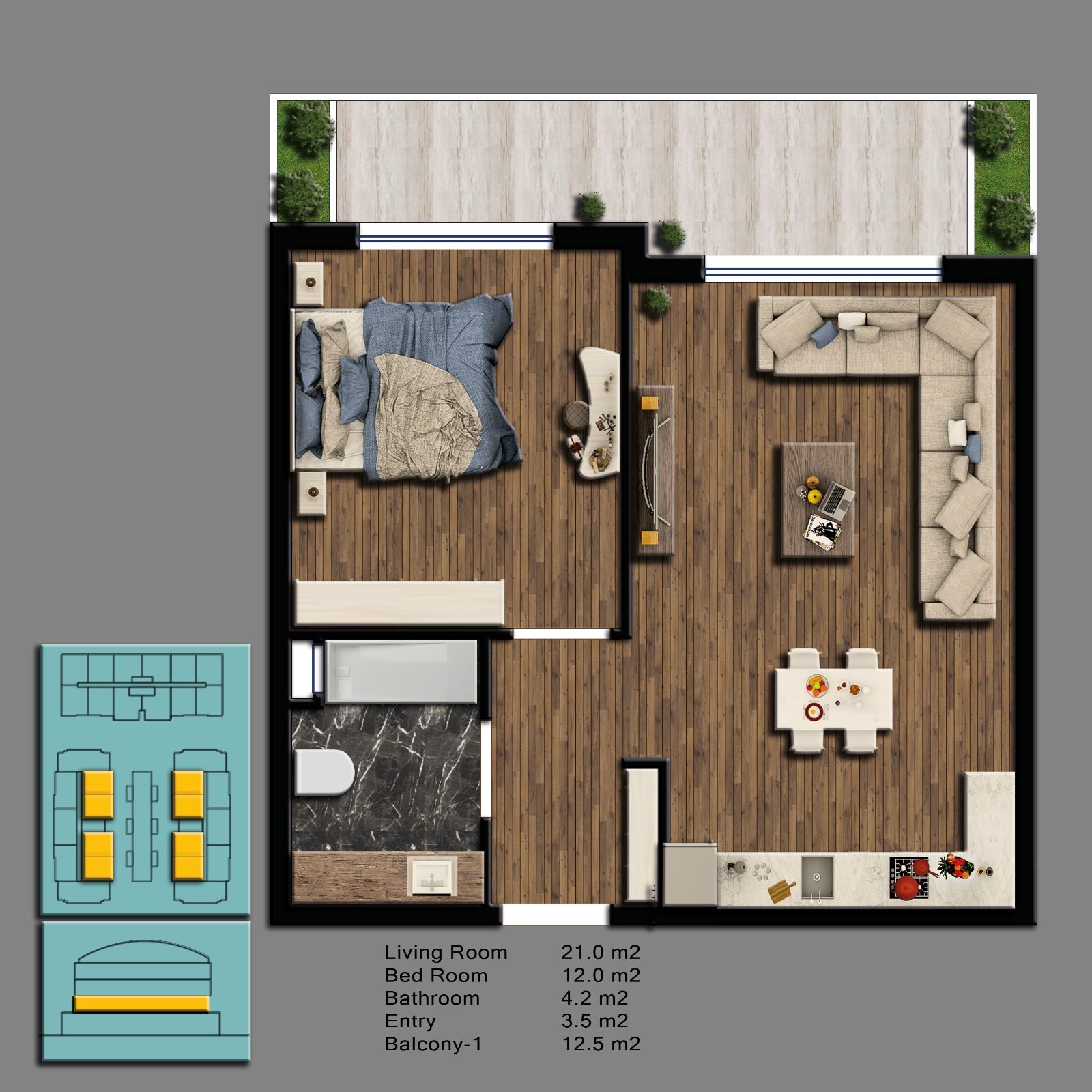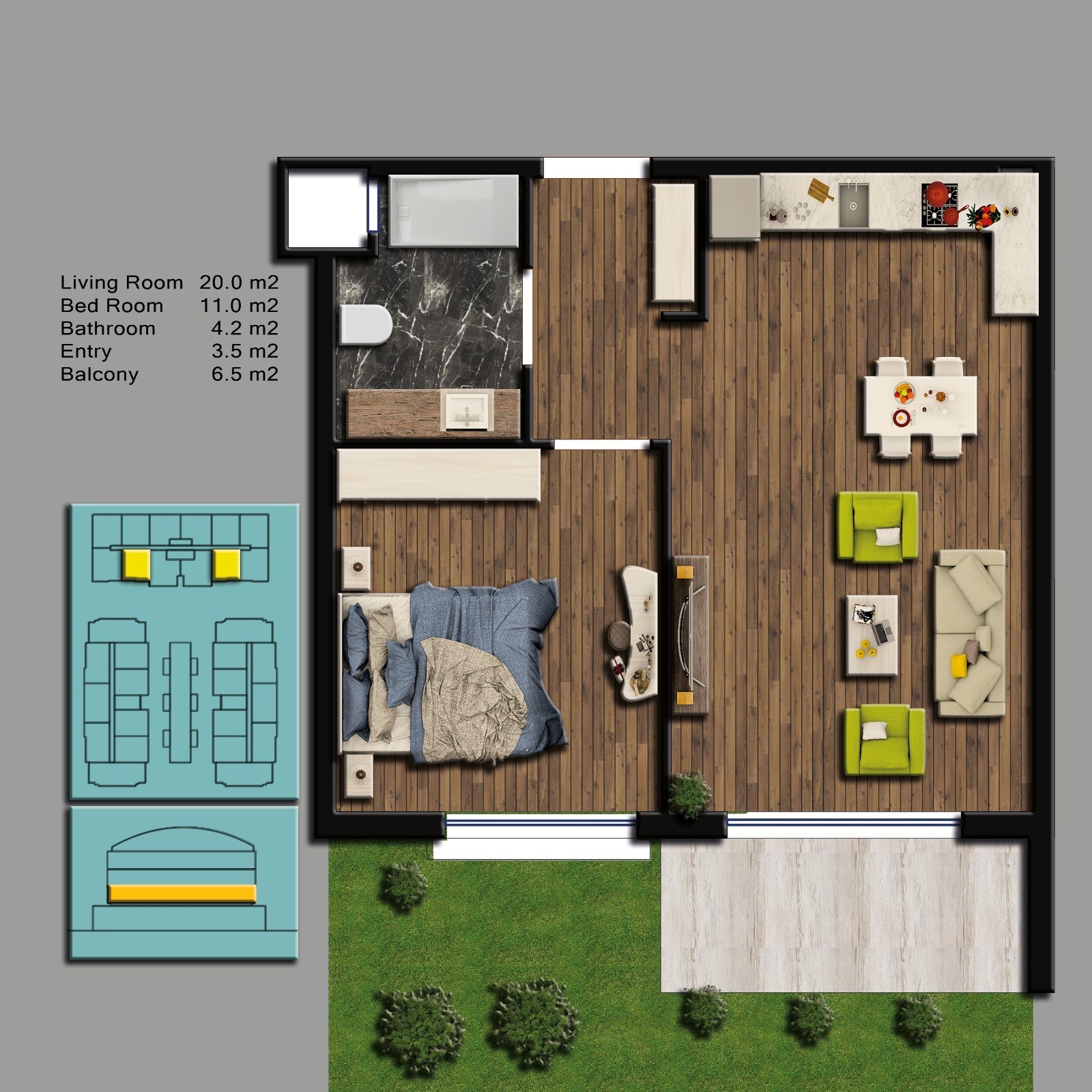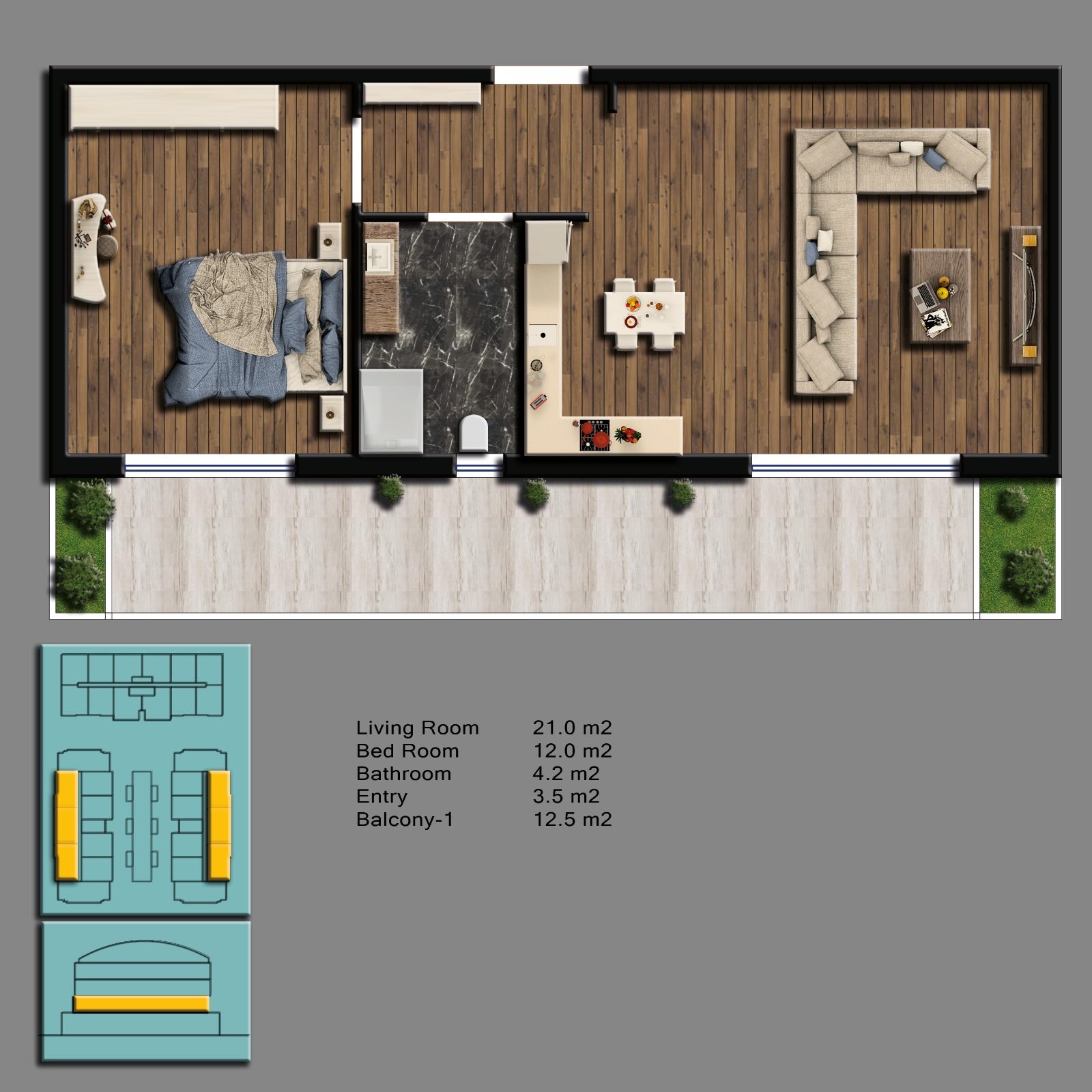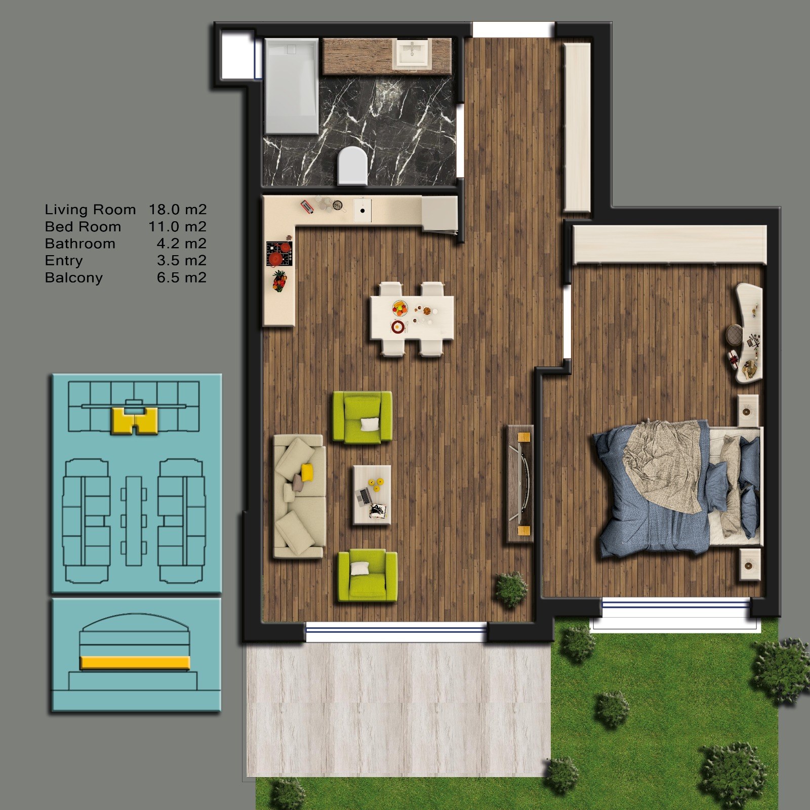 • 1 bedroom apartments are 51 – 65 m² and include a living room, an open-plan kitchen, a bathroom, and a balcony.