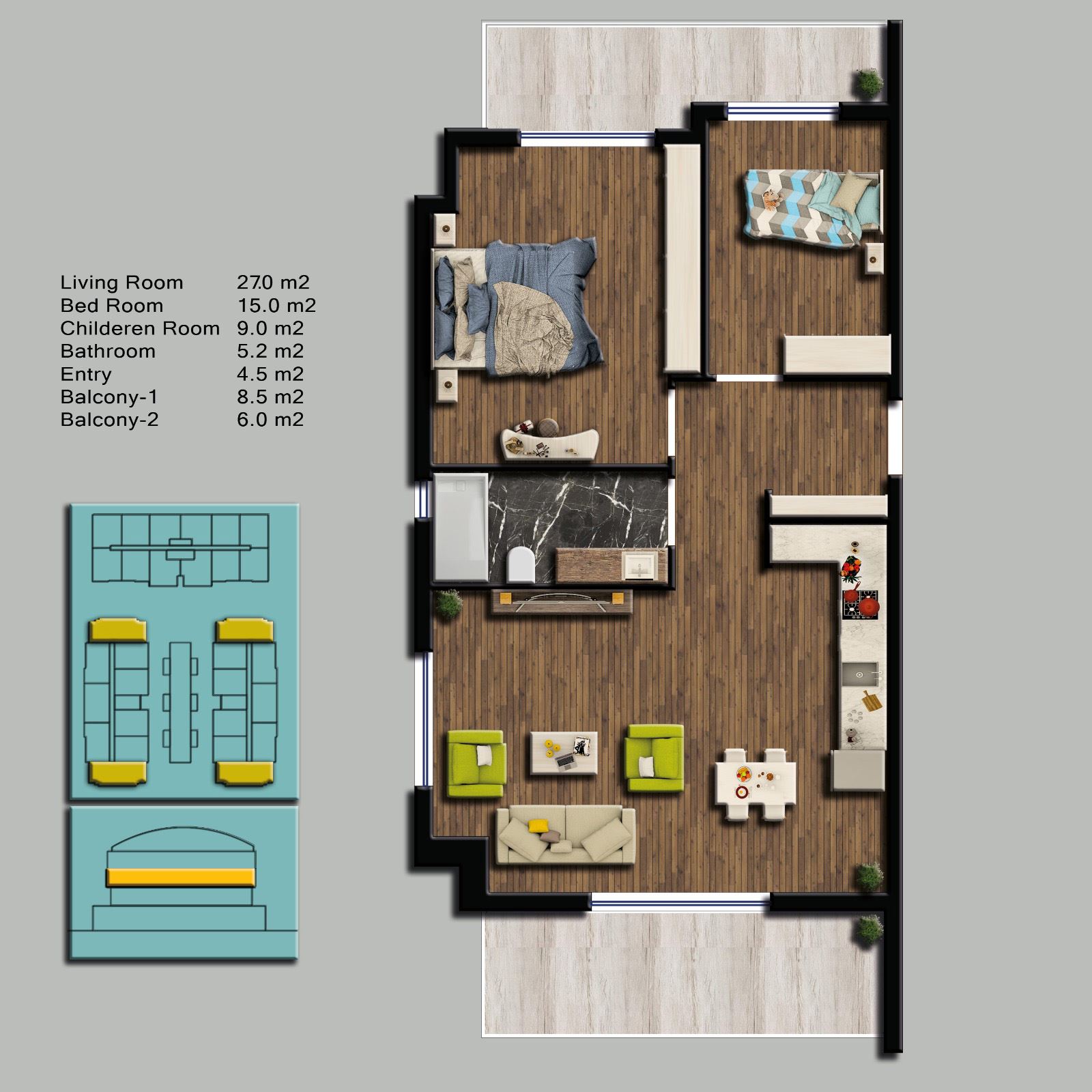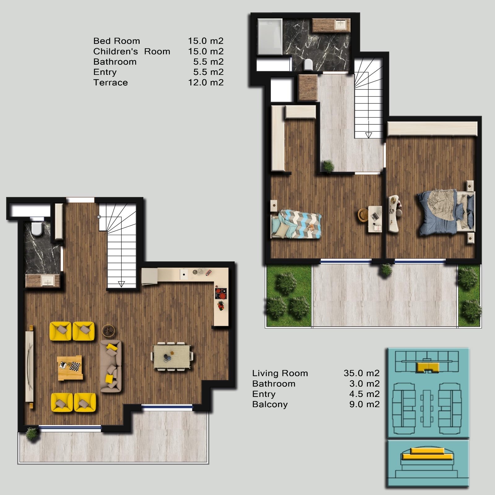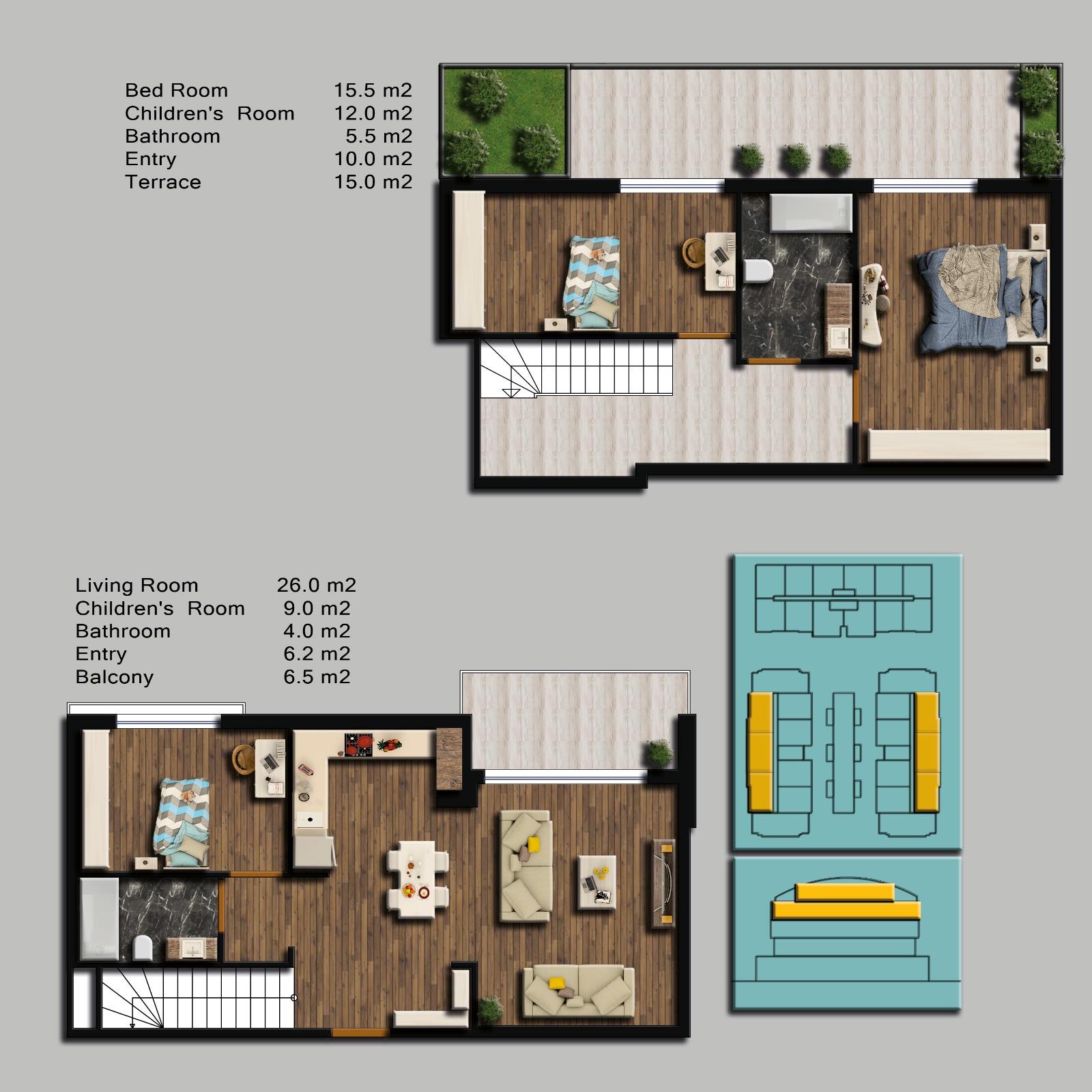 • 2 bedroom duplex apartments on the ground floor are 88 m² – 139 m² and include a living room, an open-plan kitchen, 2 bathrooms, a balcony, and a terrace.