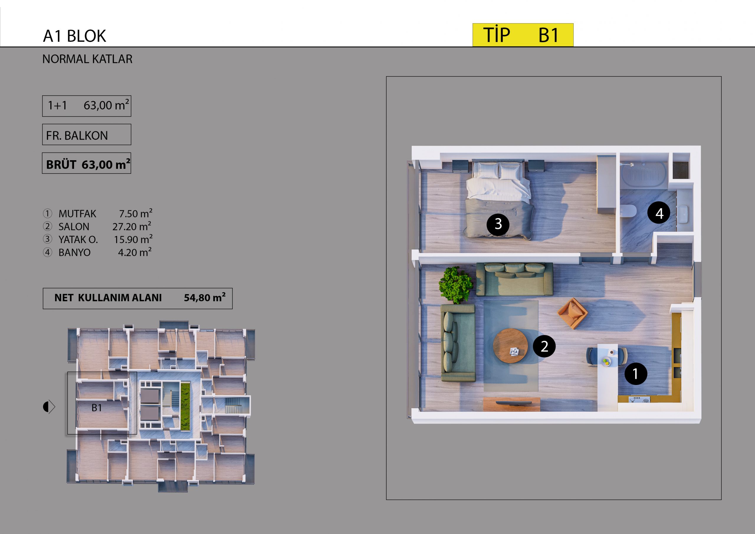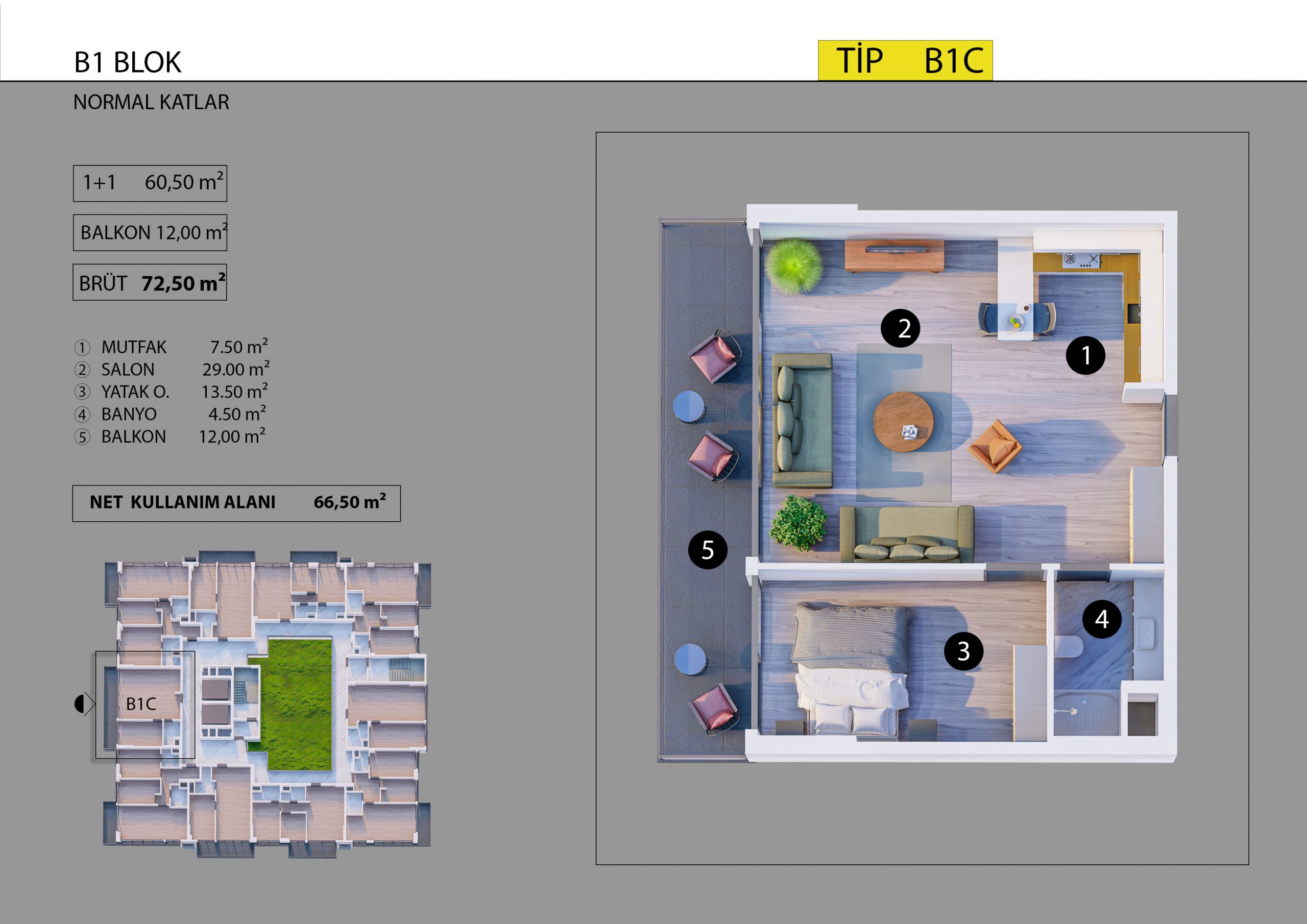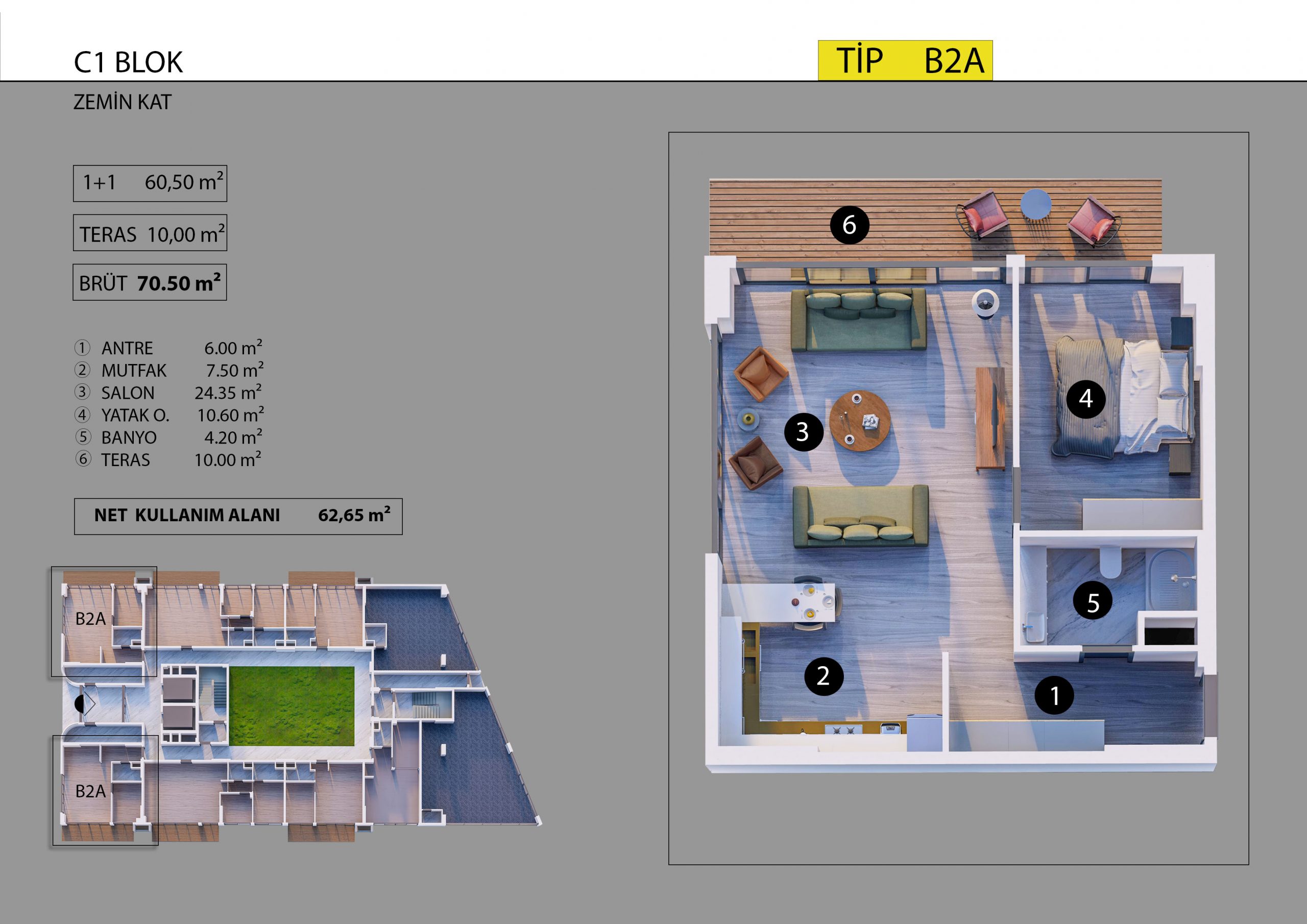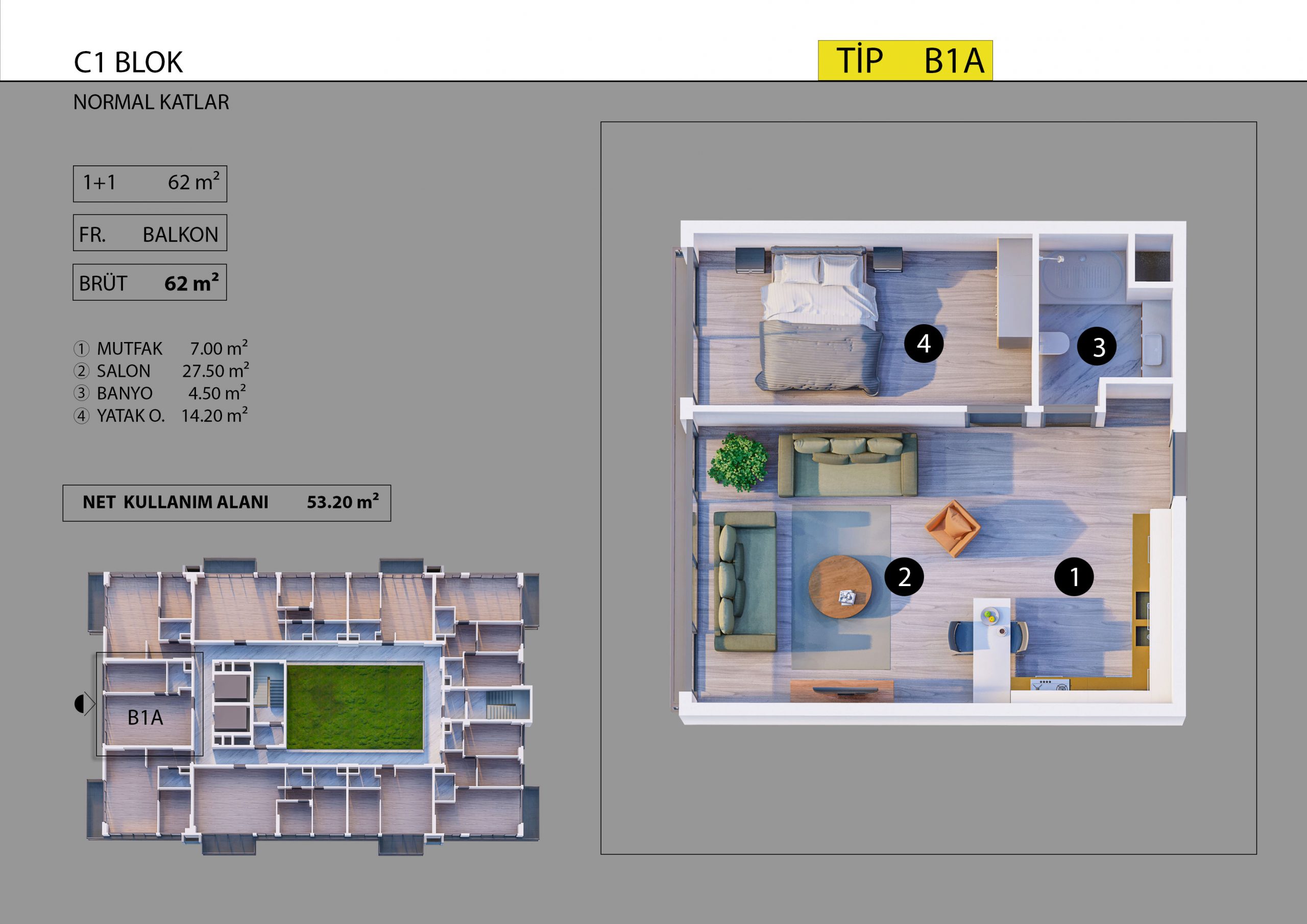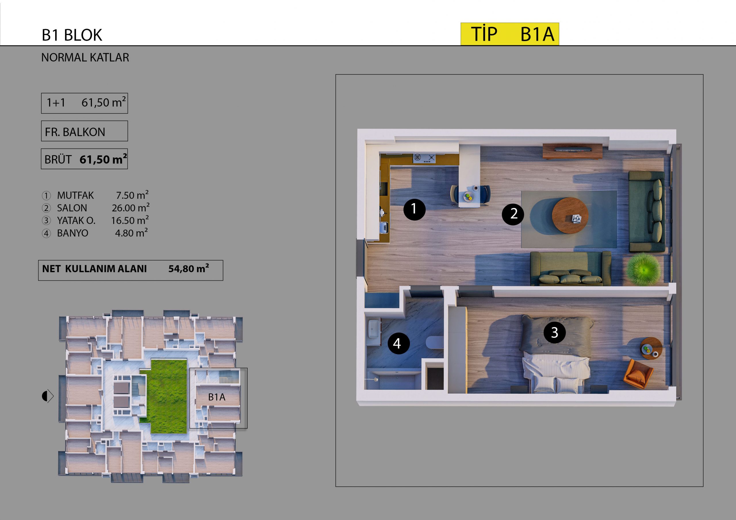 - 1 bedroom flats are 56.5 – 75 m² in size and consist of a living room, an open-plan kitchen, a bathroom, and a balcony / french balcony / or ground terrace.