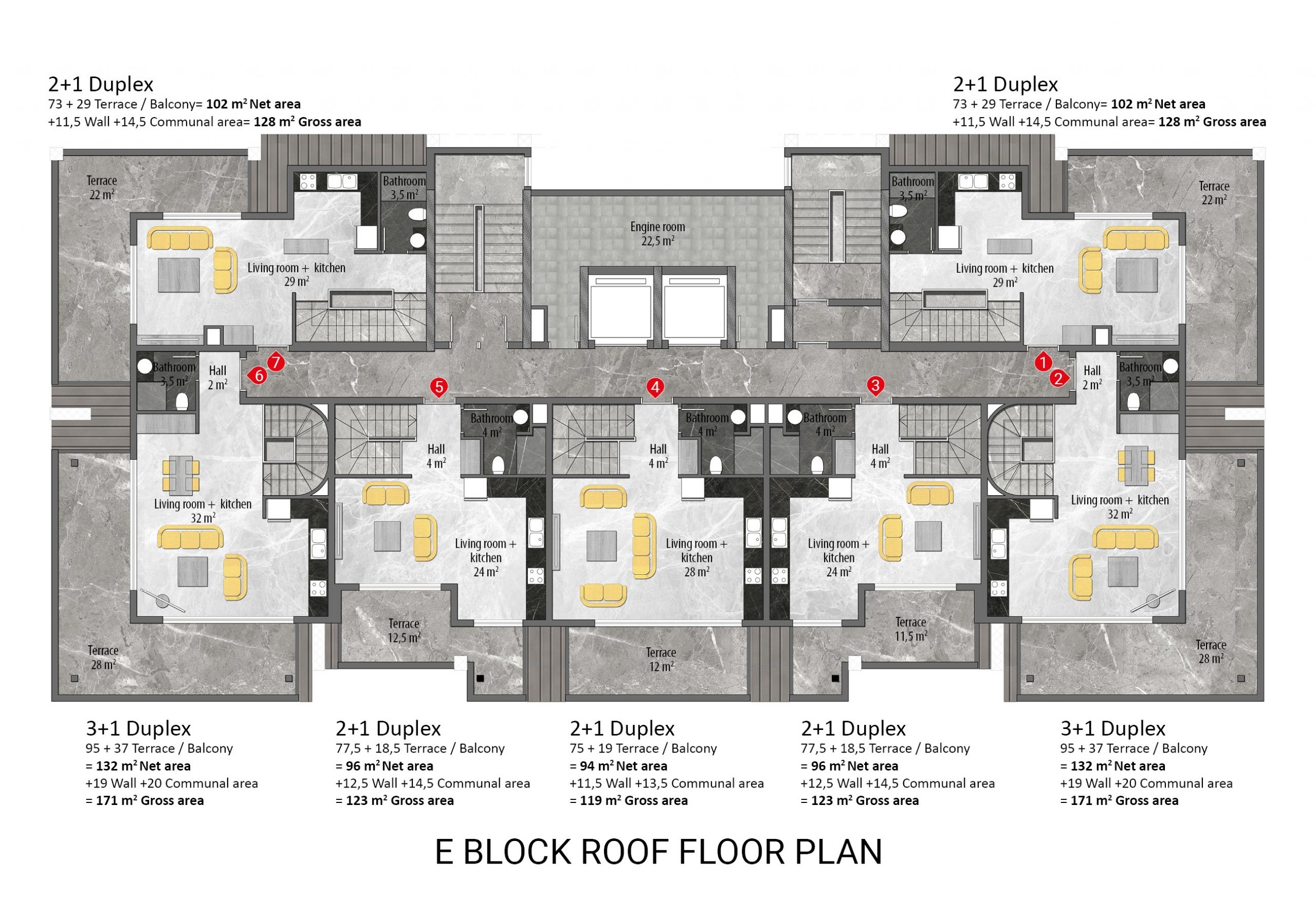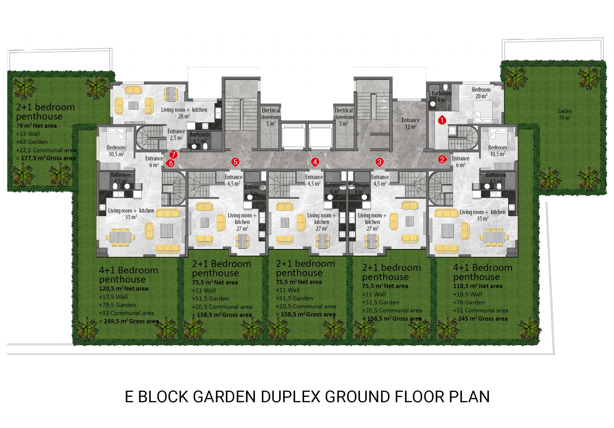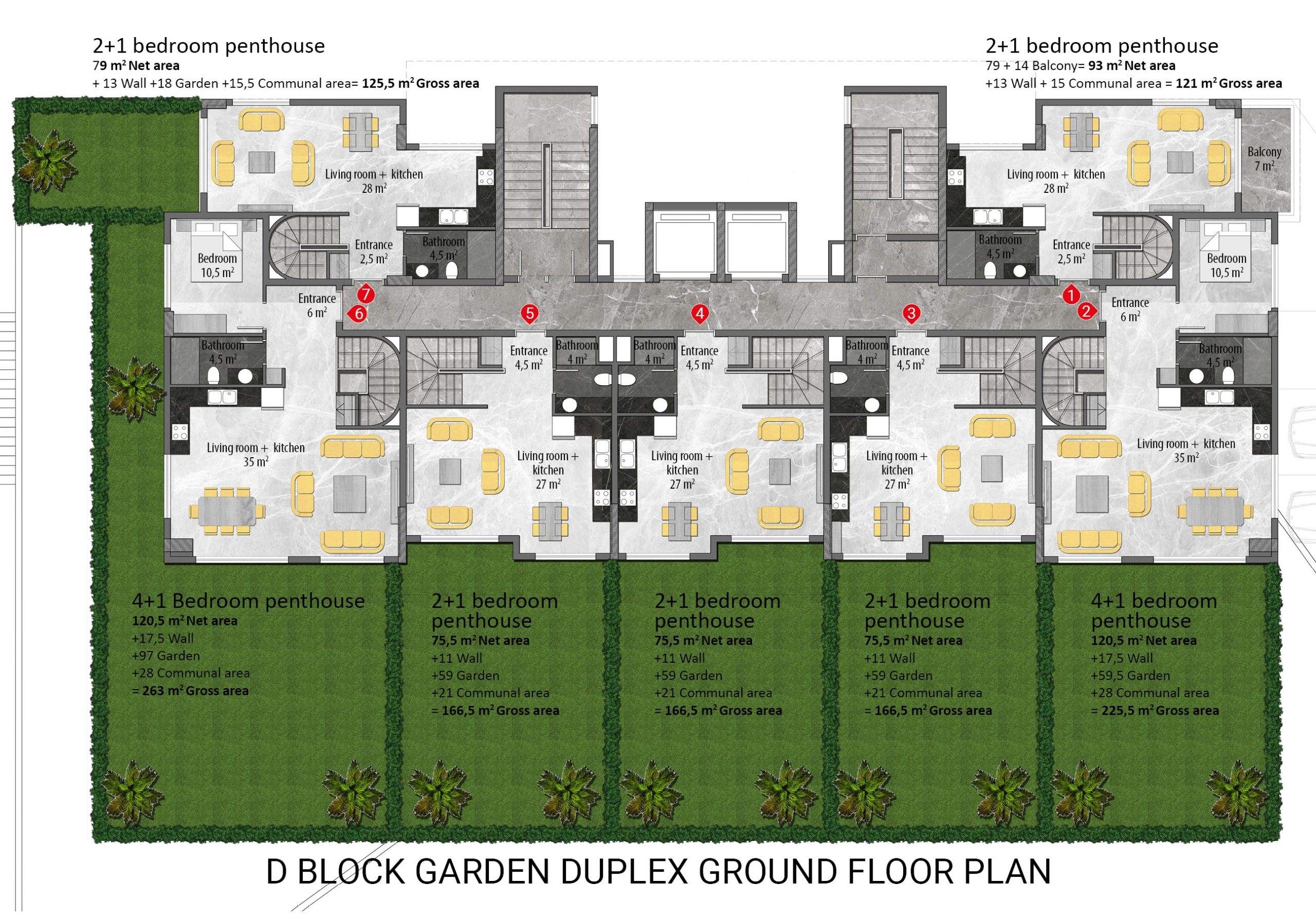 Every detail in the project has been planned and designed, down to the smallest detail, considering the needs and comfort of the residents. All apartments in the project are equipped with the highest quality materials and the latest technology. Each apartment has air conditioning, instant water heater, audio-visual door phone, central TV satellite, PVC double glazed windows, built-in spotlights in the living room and kitchen, steel entrance door, heat resistant walls, ceramic tile flooring in all rooms, custom-designed modular kitchen furniture, granite worktop, bathroom with bordered ceramic floor and wall tiles and shower cabin.