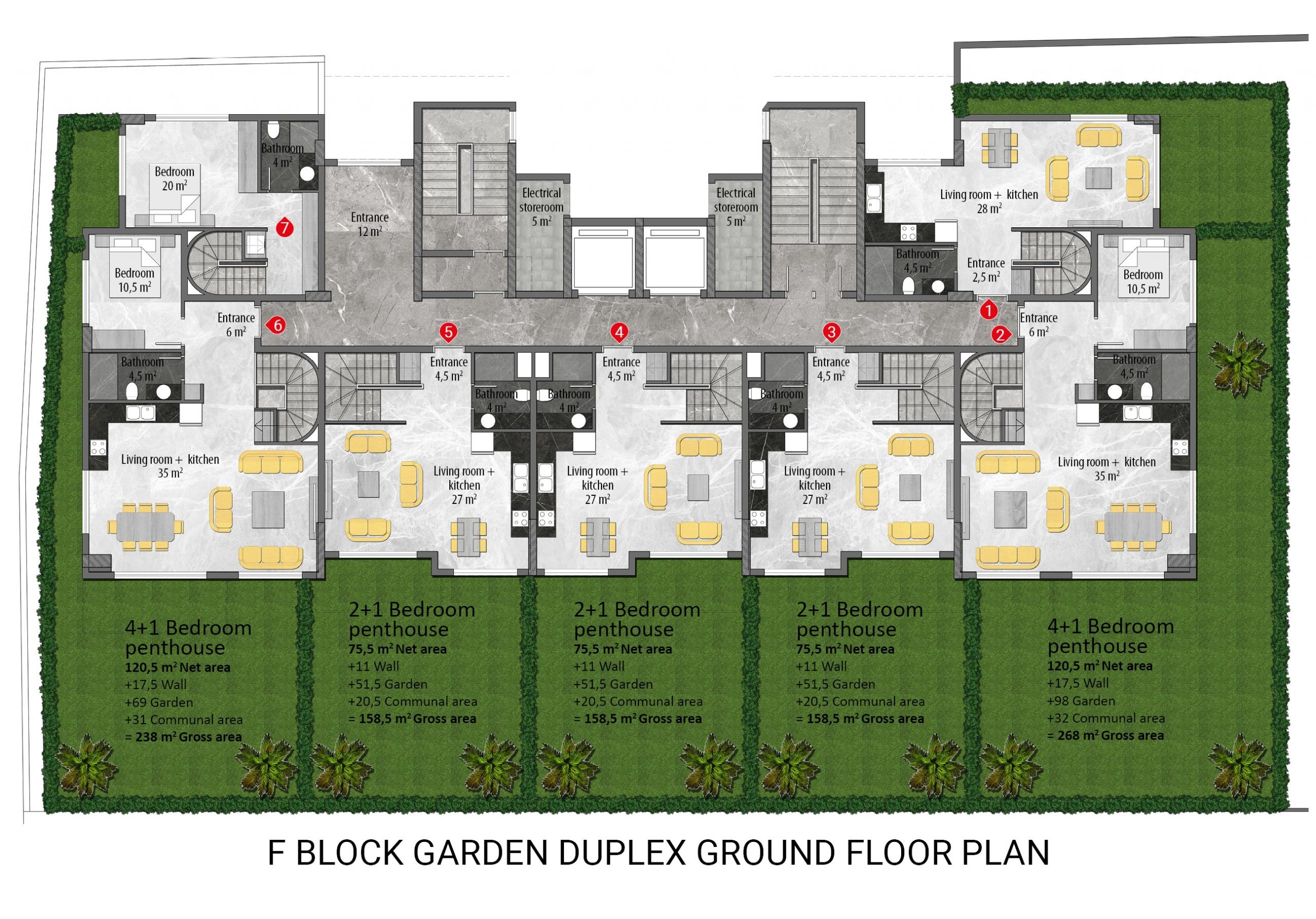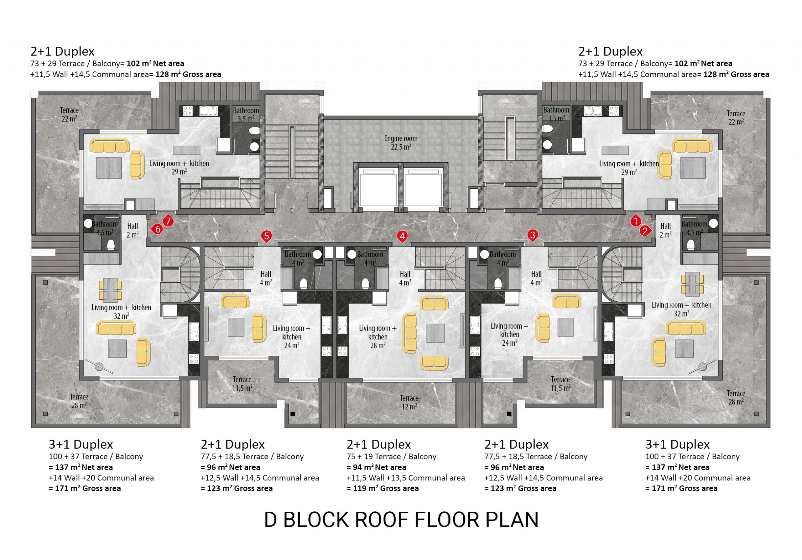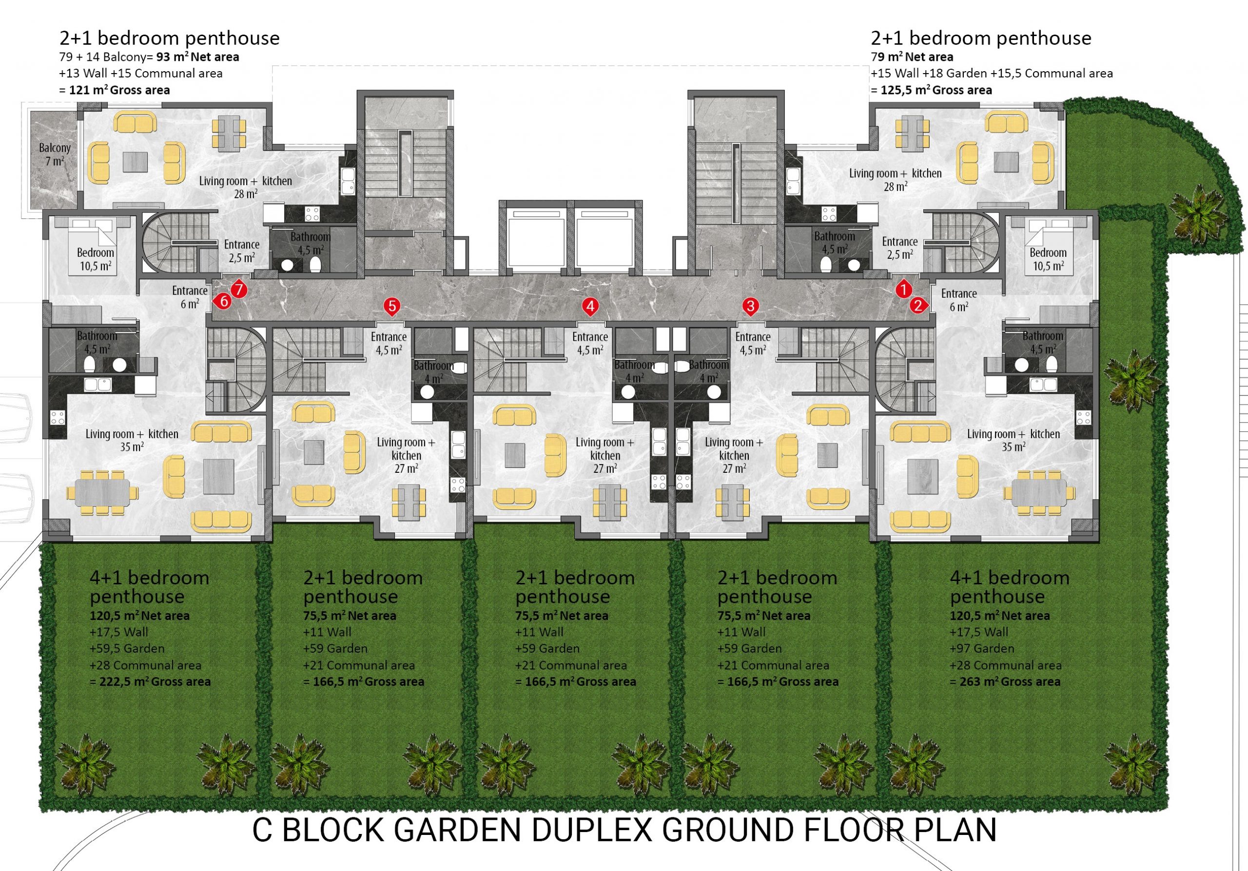 Every detail in the project has been planned and designed, down to the smallest detail, considering the needs and comfort of the residents. All apartments in the project are equipped with the highest quality materials and the latest technology. Each apartment has air conditioning, instant water heater, audio-visual door phone, central TV satellite, PVC double glazed windows, built-in spotlights in the living room and kitchen, steel entrance door, heat resistant walls, ceramic tile flooring in all rooms, custom-designed modular kitchen furniture, granite worktop, bathroom with bordered ceramic floor and wall tiles and shower cabin.