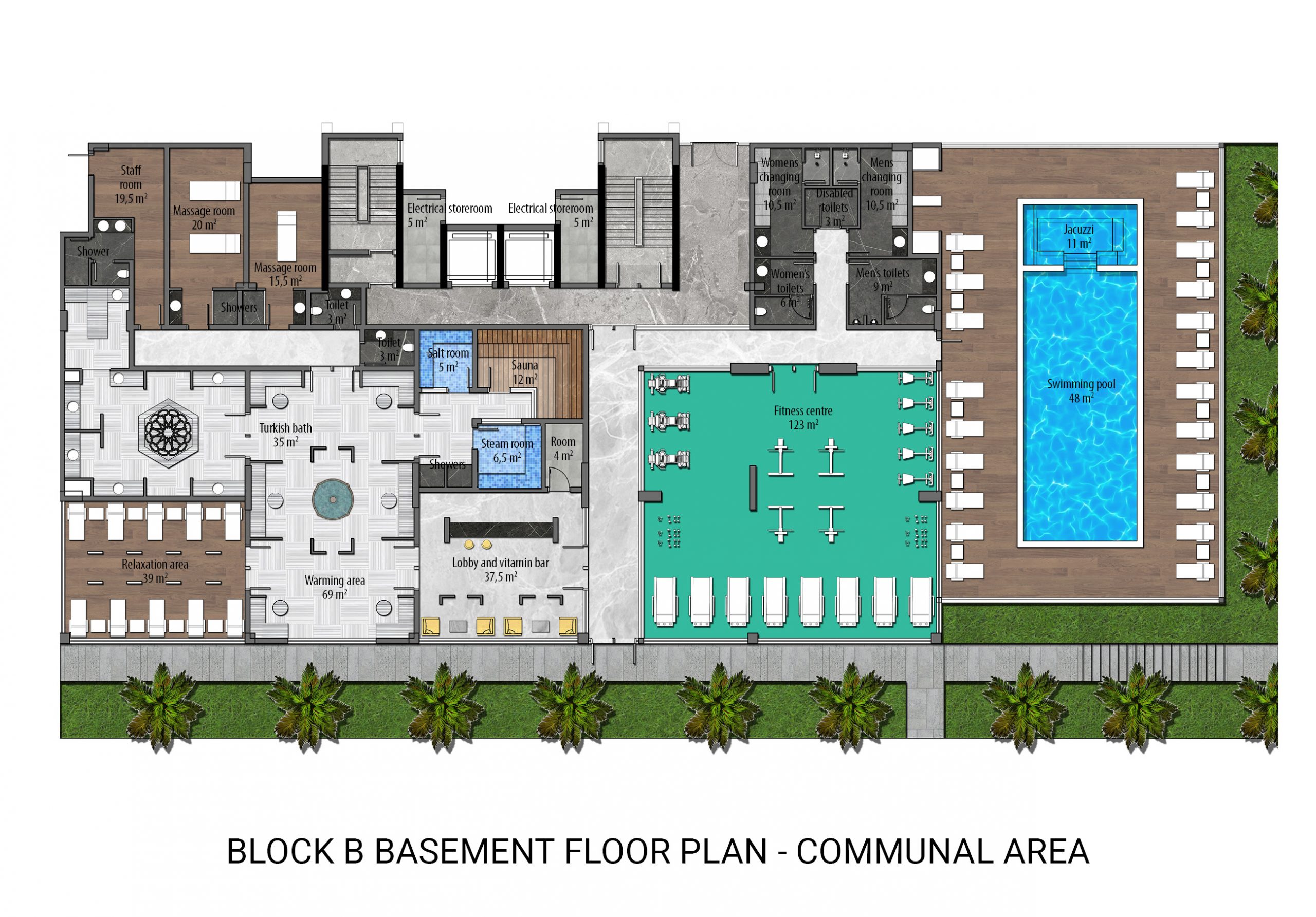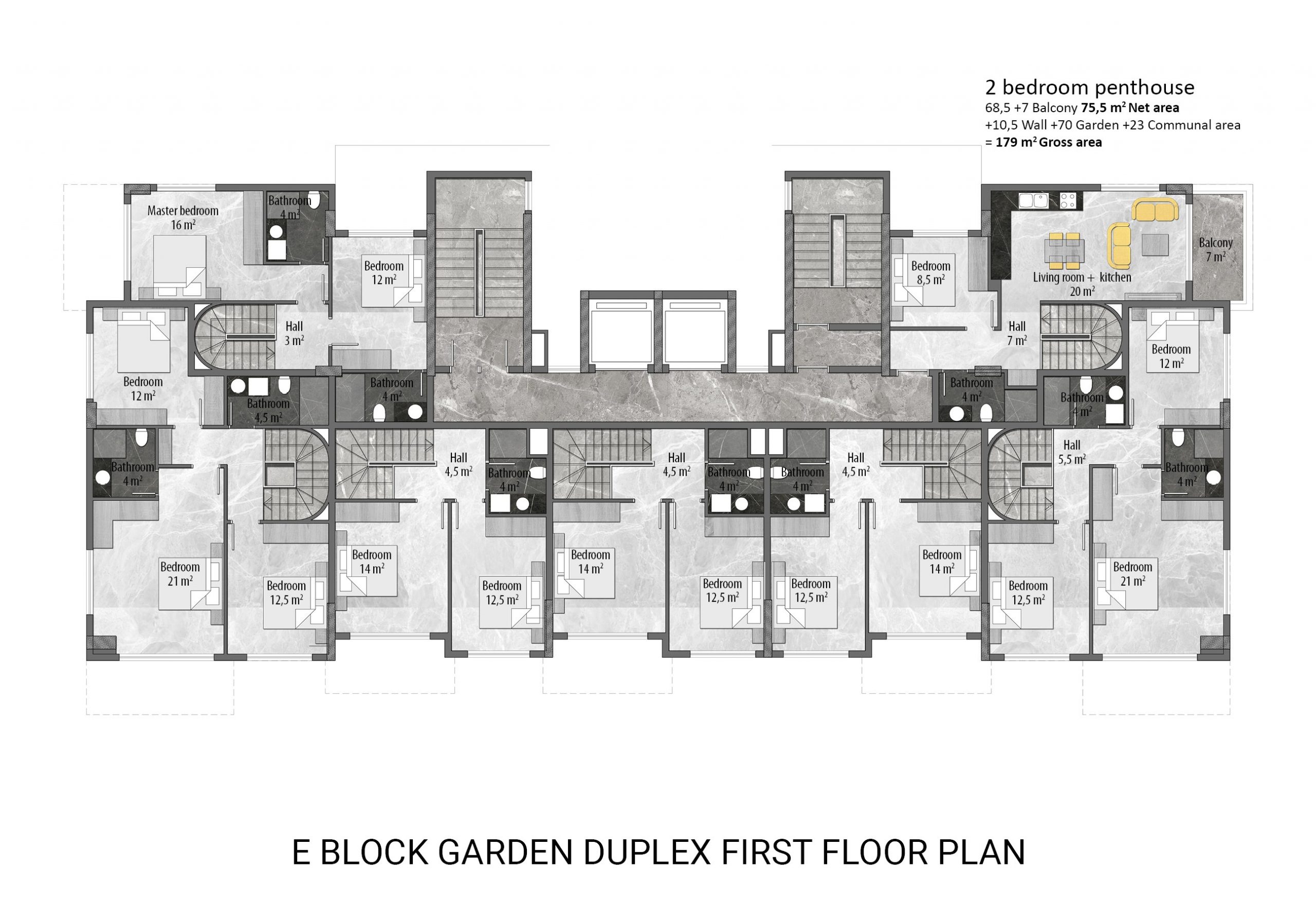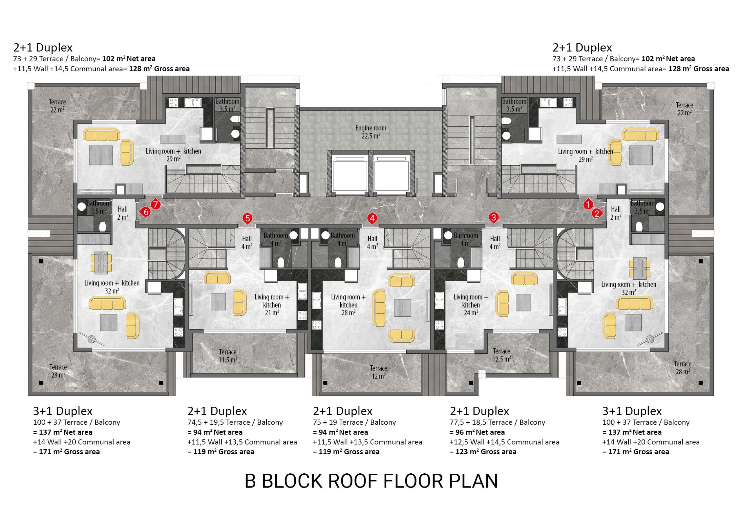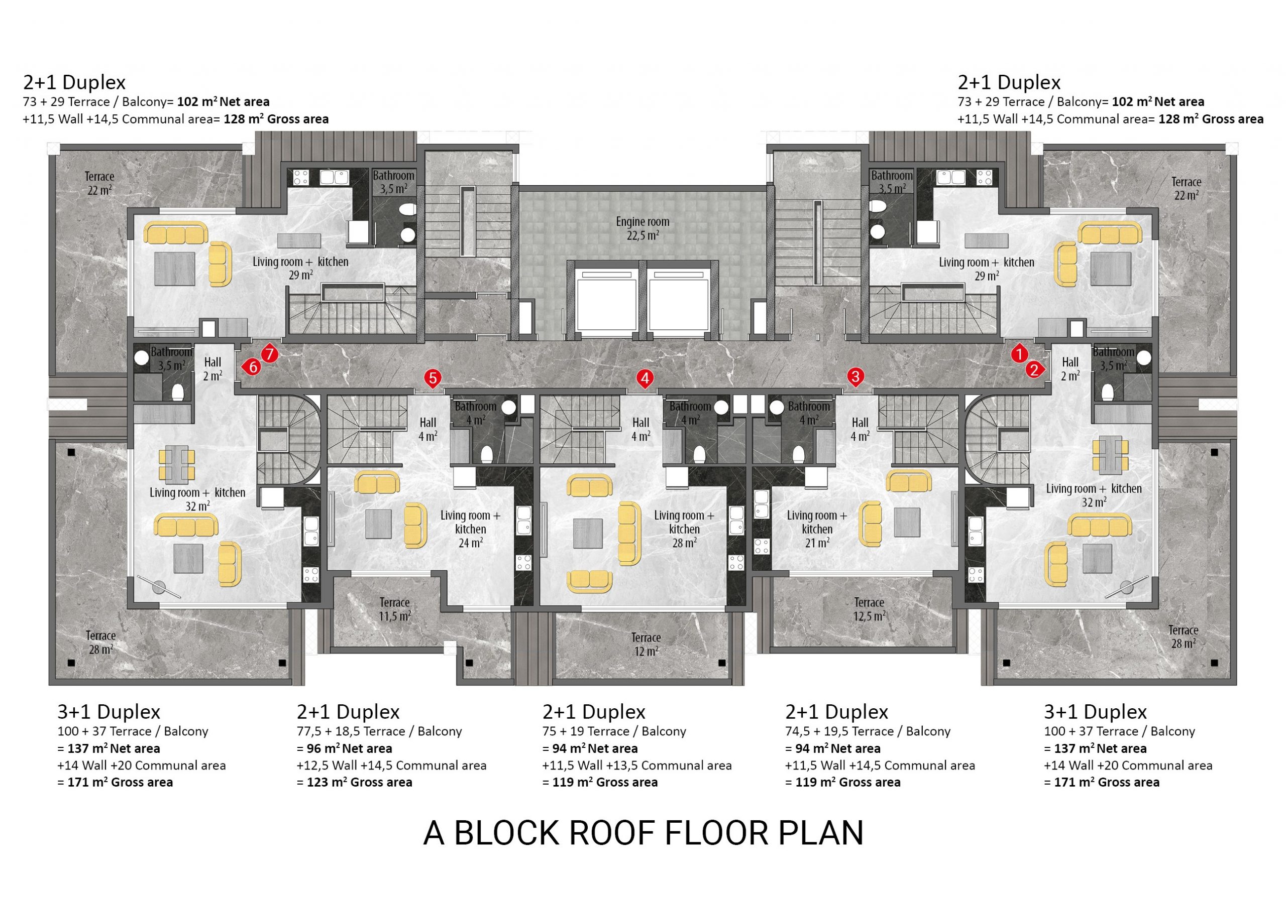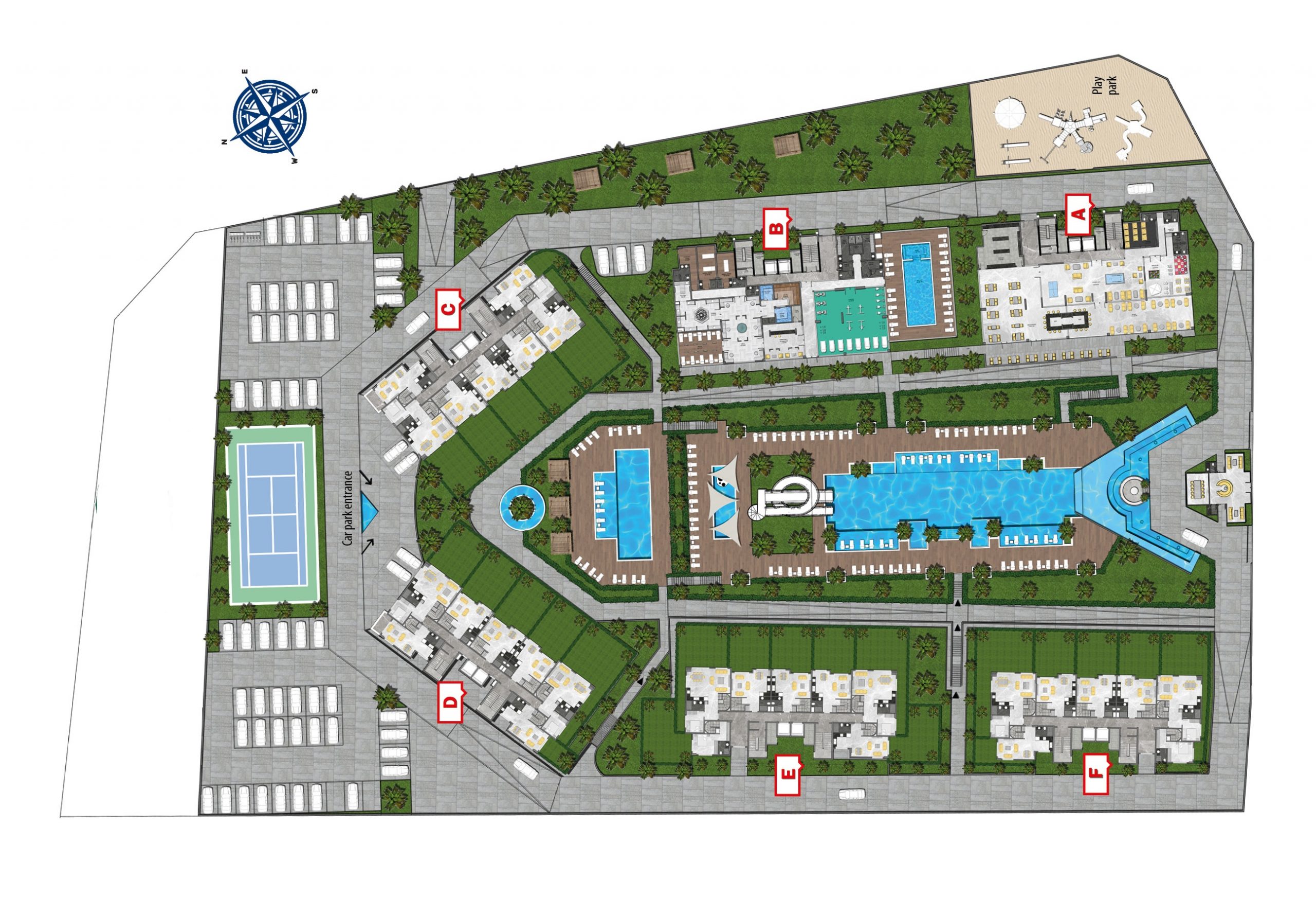 Built on a 19.212 m² land area, 5-star hotel concept project consists of 9 storey 6 blocks and a total of 378 apartments including 1+1 middle floor, 2+1 ground floor,  2+1 middle floor, 2+1 penthouse, 2+1 penthouse, and 4+1 ground floor. The complex has 5-star hotel amenities and you can find everything you are looking for, such as a well-designed garden, outdoor swimming pool with water slides, separate children’s swimming pool, a heated indoor swimming pool, SPA, Turkish bath, sauna, steam room, and massage rooms, fitness center, kids club, billiards and table tennis, cinema room, game room, tennis court, basketball court, sitting areas, BBQ area, indoor and outdoor parking areas, general storage, wireless internet in communal areas, caretaker, gardener, generator, 24/7 security camera system, and security.