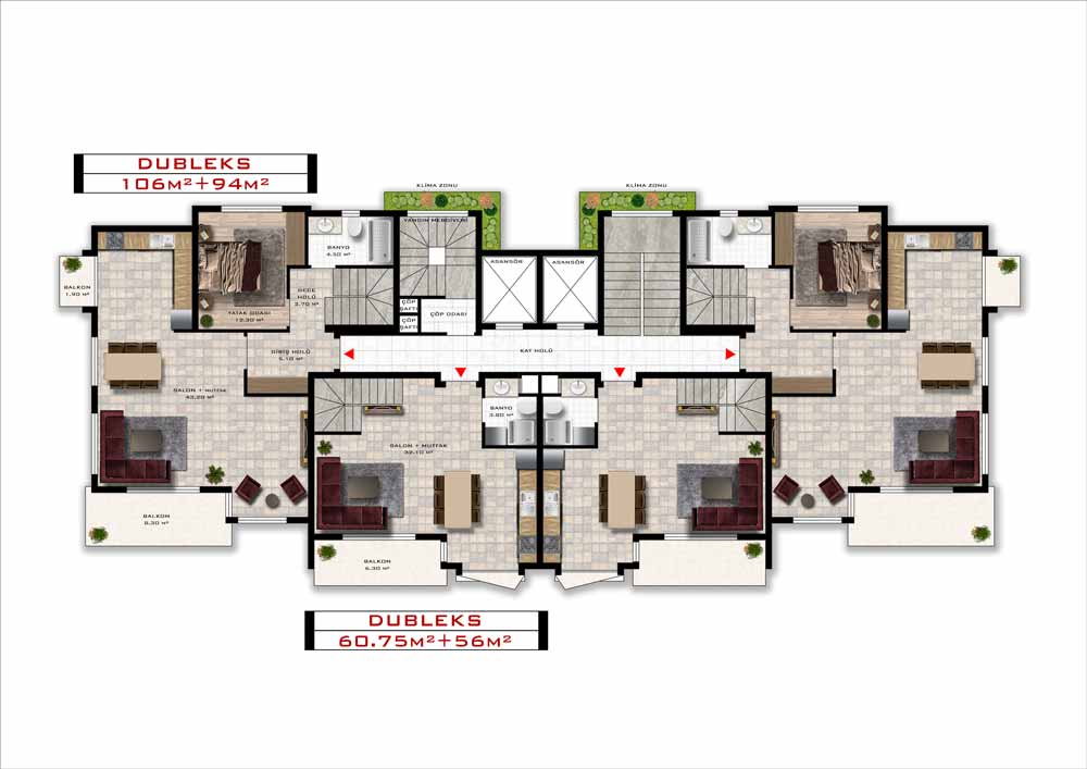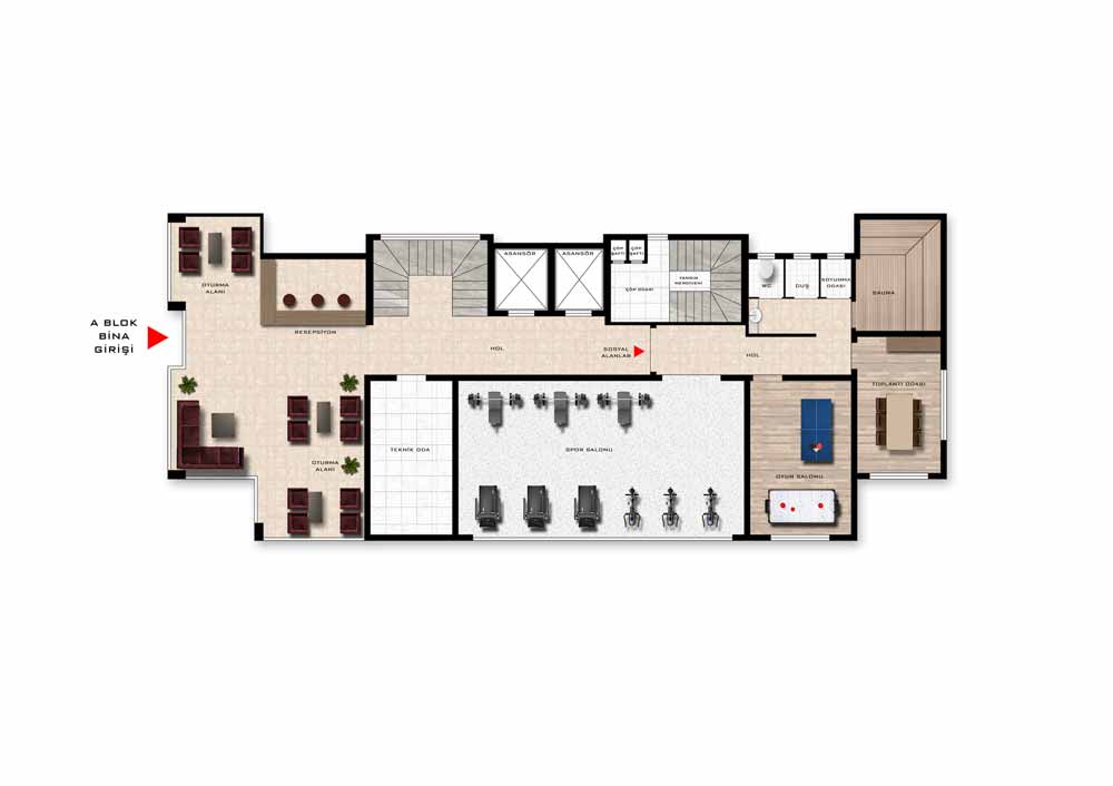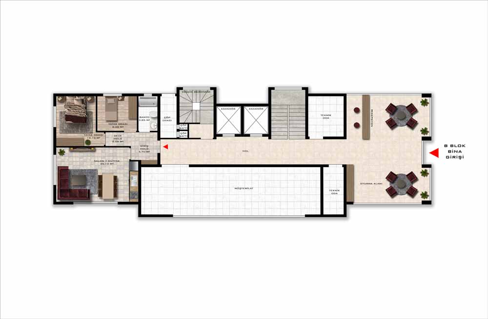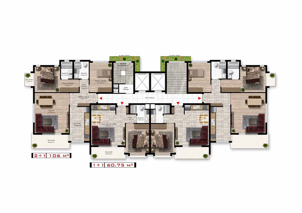 Built on a land area of 4,376 m², the modern project consists of 2 blocks and 63 flats in total. It offers more than a comfortable life with its environment-friendly architecture, landscape, and social facilities. Outdoor facilities include a car parking lot, swimming pool, children’s pool, children’s playground, sunbathing areas, and sitting areas in a well-designed garden. Indoor facilities include a reception, fitness center, sauna, game rooms, rest areas, shower, WC, changing rooms, shelter, and warehouse.