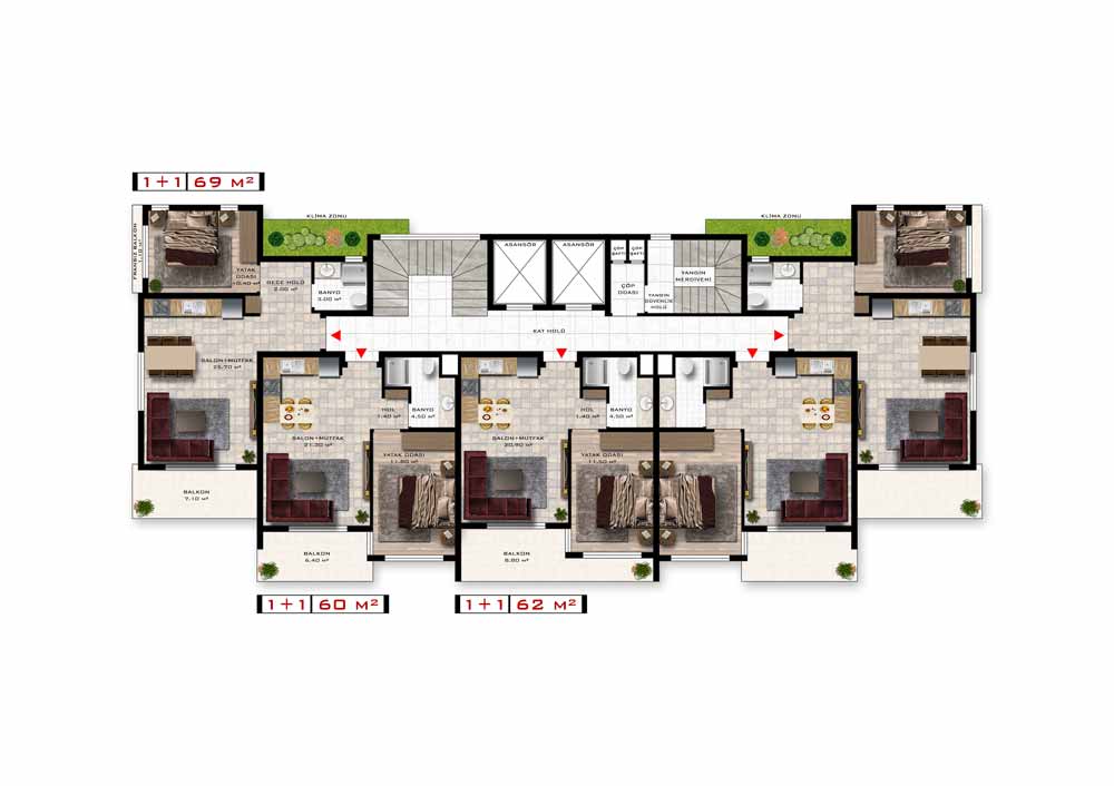 - 1 bedroom apartments are 60 – 69 m² and include a living room, an open-plan kitchen, a bathroom, and a balcony.