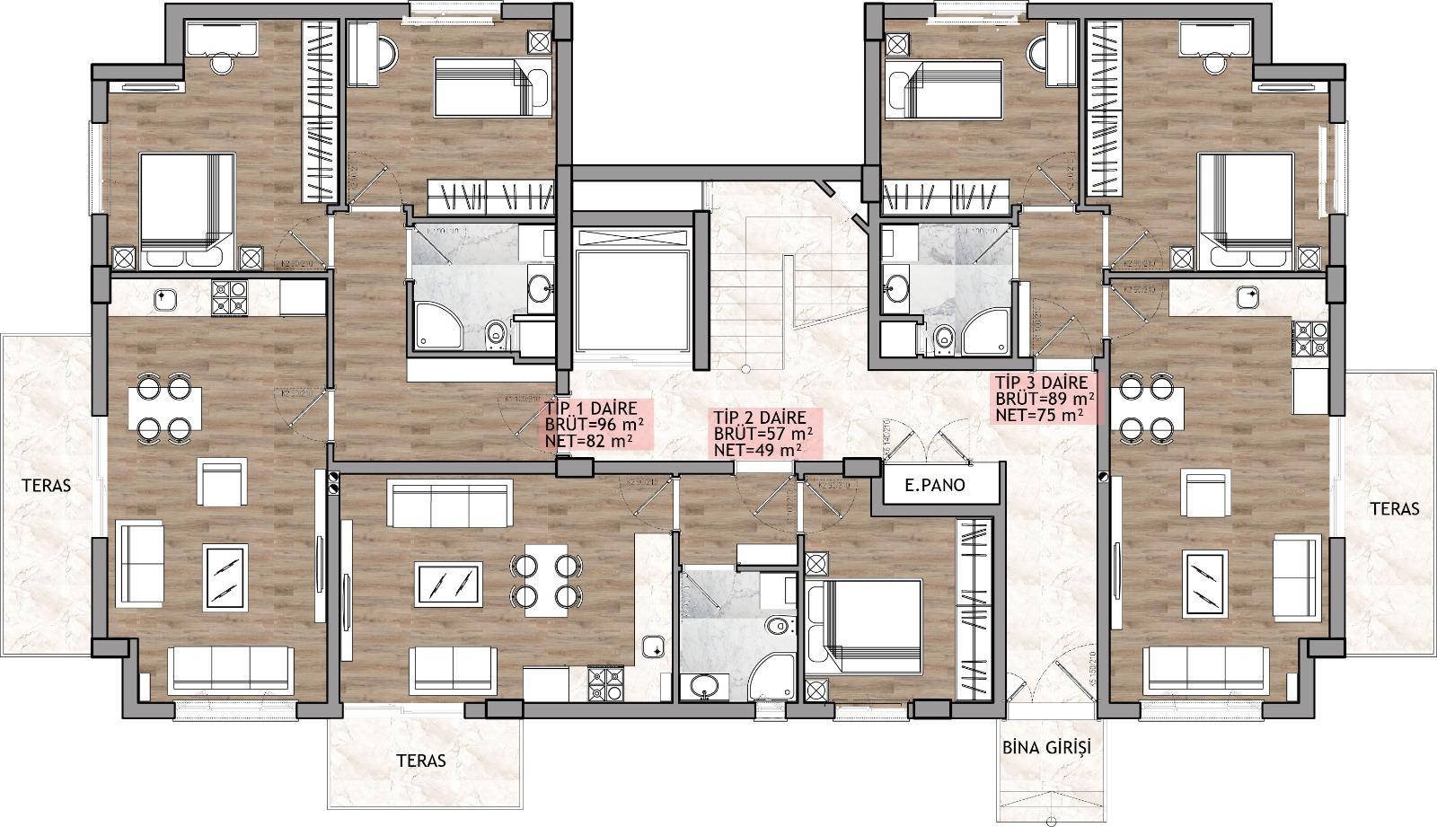 Flats in Kepez, Antalya, are equipped with modern interior features such as a video intercom, steel door, built-in kitchen & bathroom furniture, and many more.