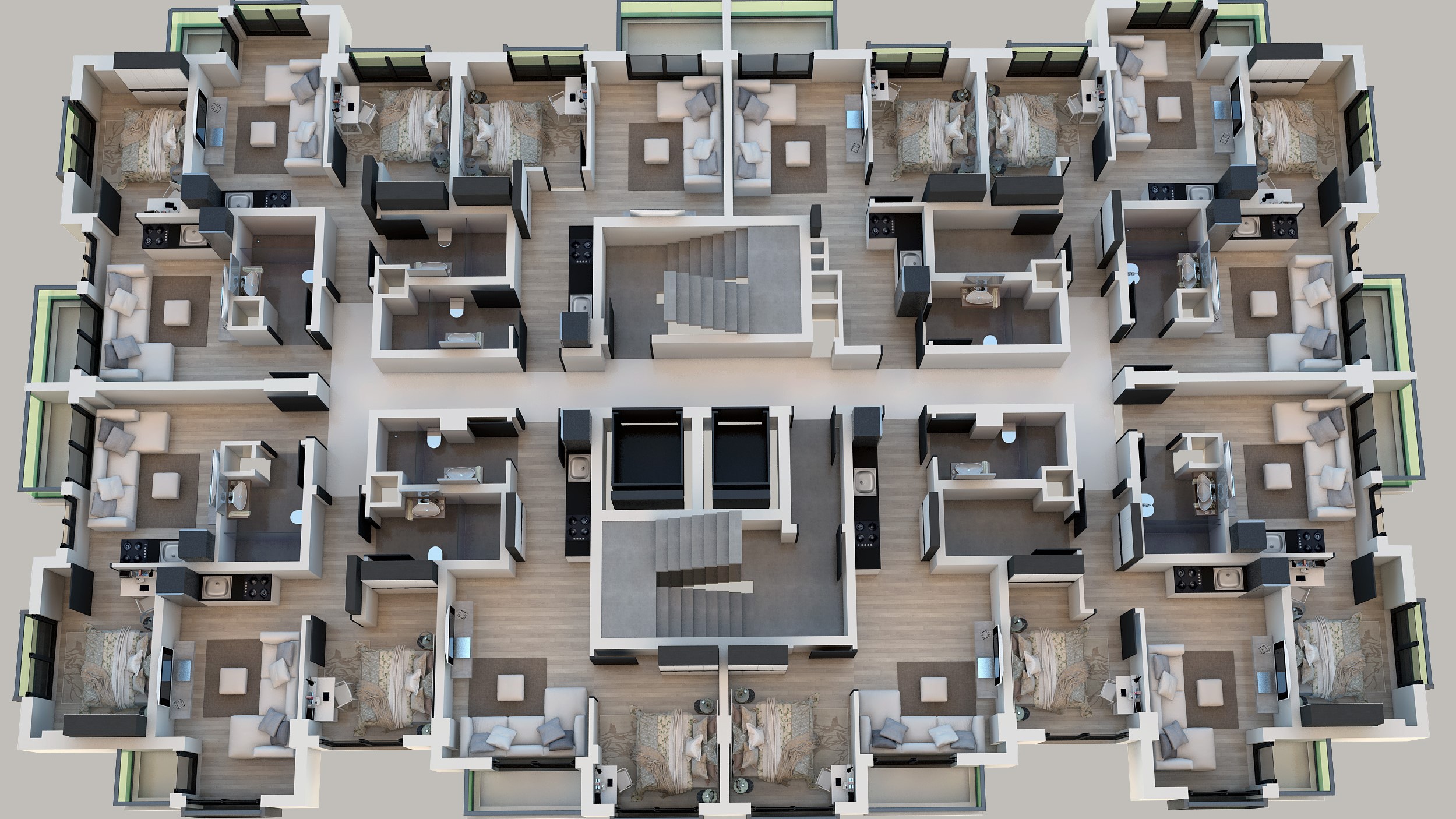 • 3 bedroom duplex apartments 110 m² and include a living room, an open-plan kitchen, 2 bathrooms, and 2 balconies.