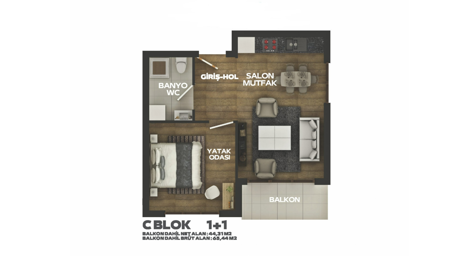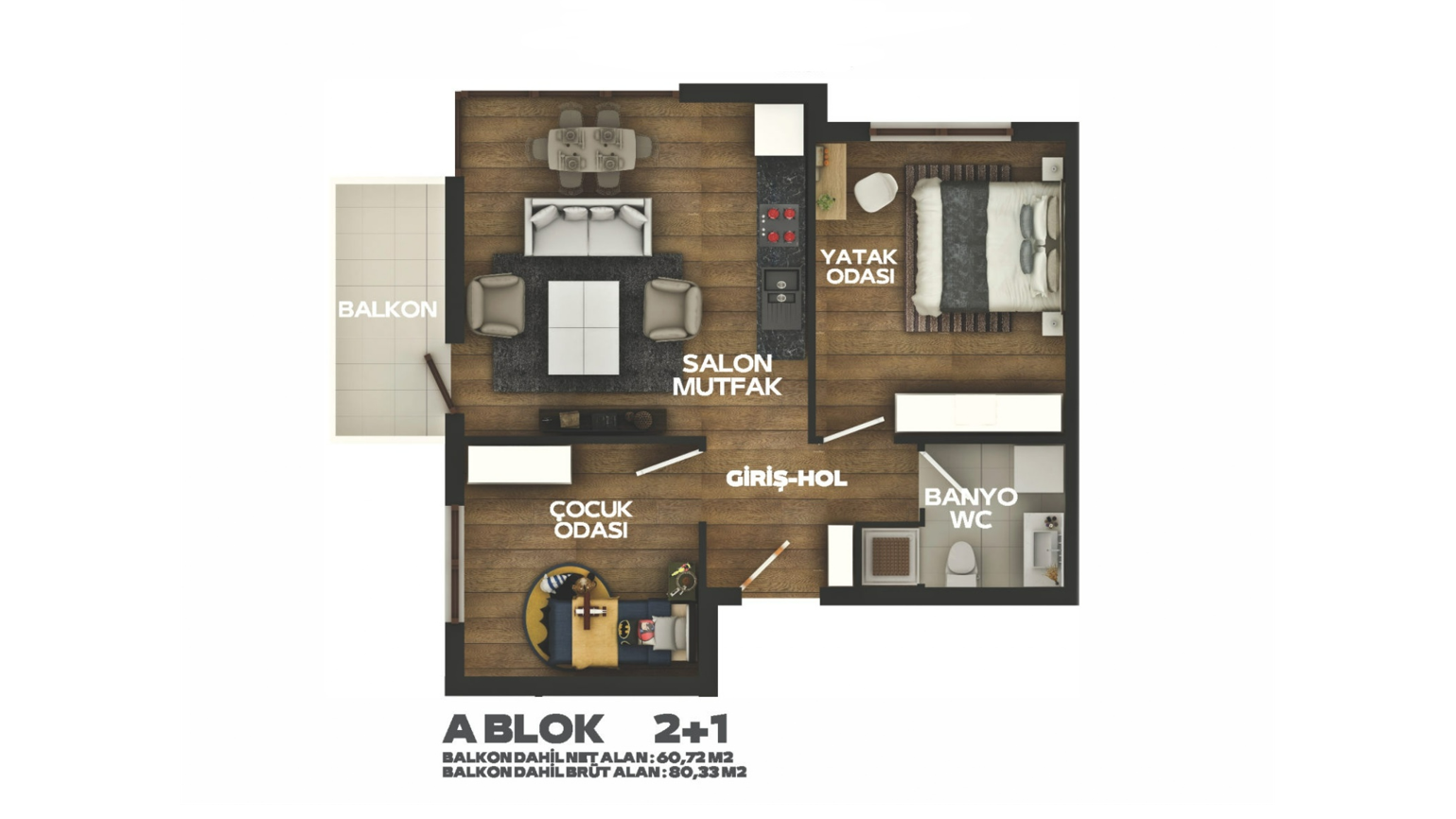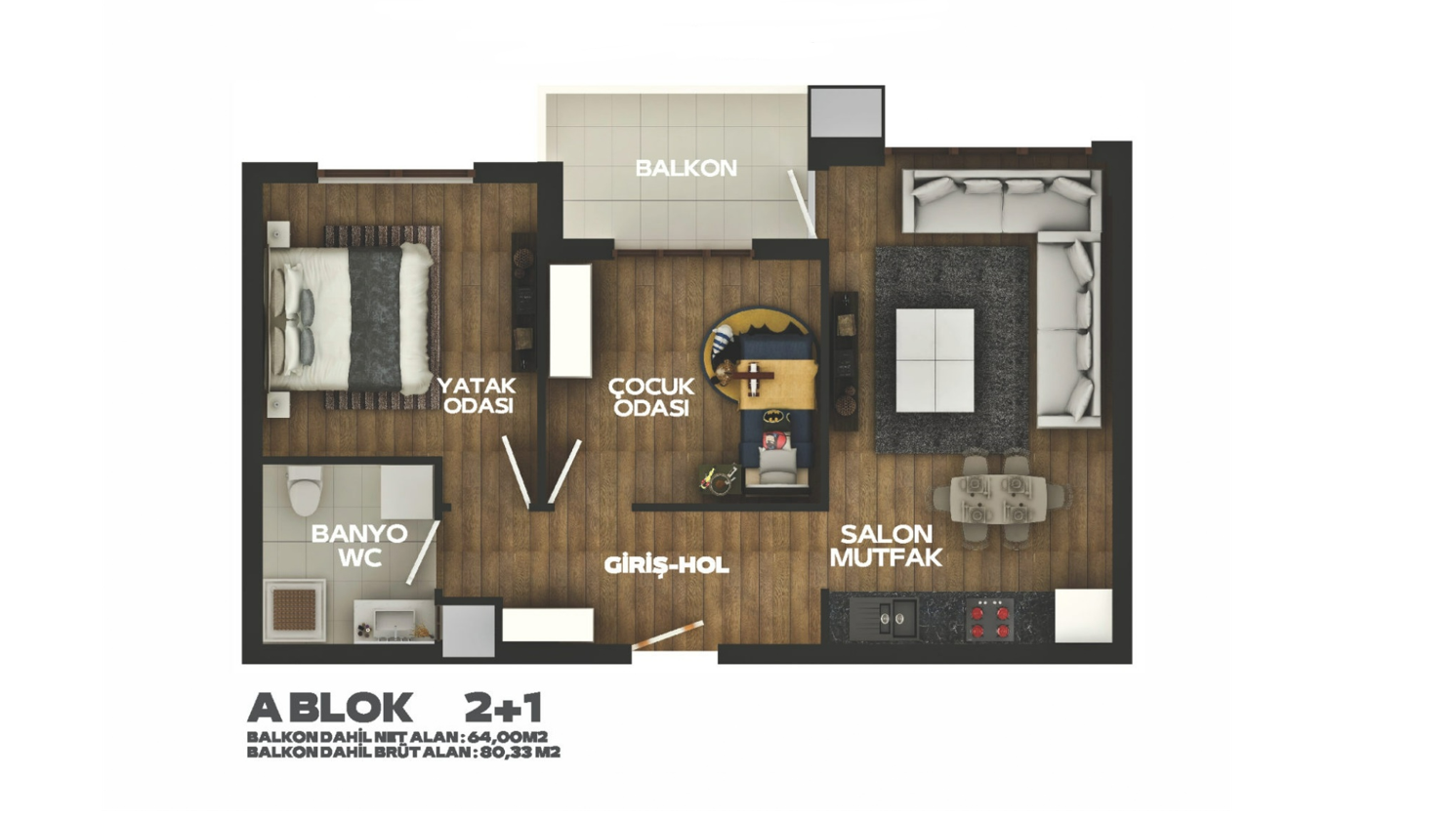 • 2 bedroom apartments are 80 gross m² (60-64 net m²) and include a living room, an open-plan kitchen, a bathroom, and a balcony.