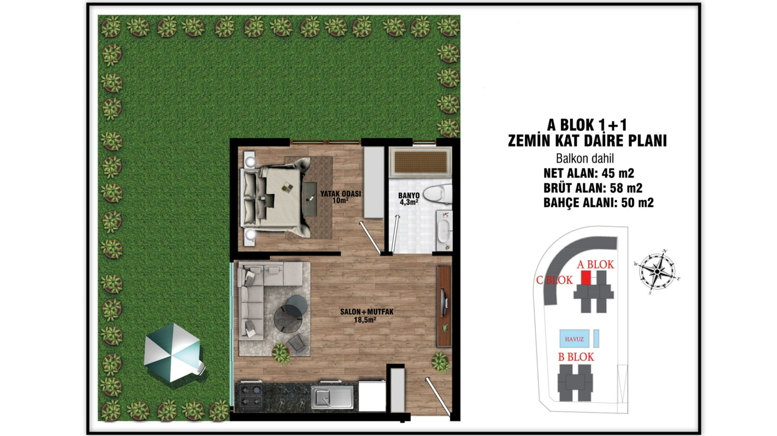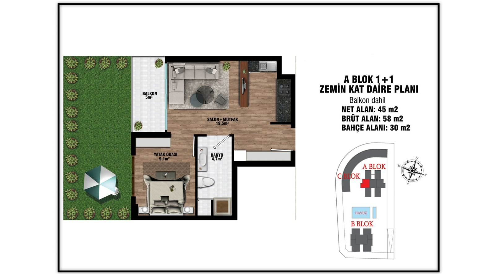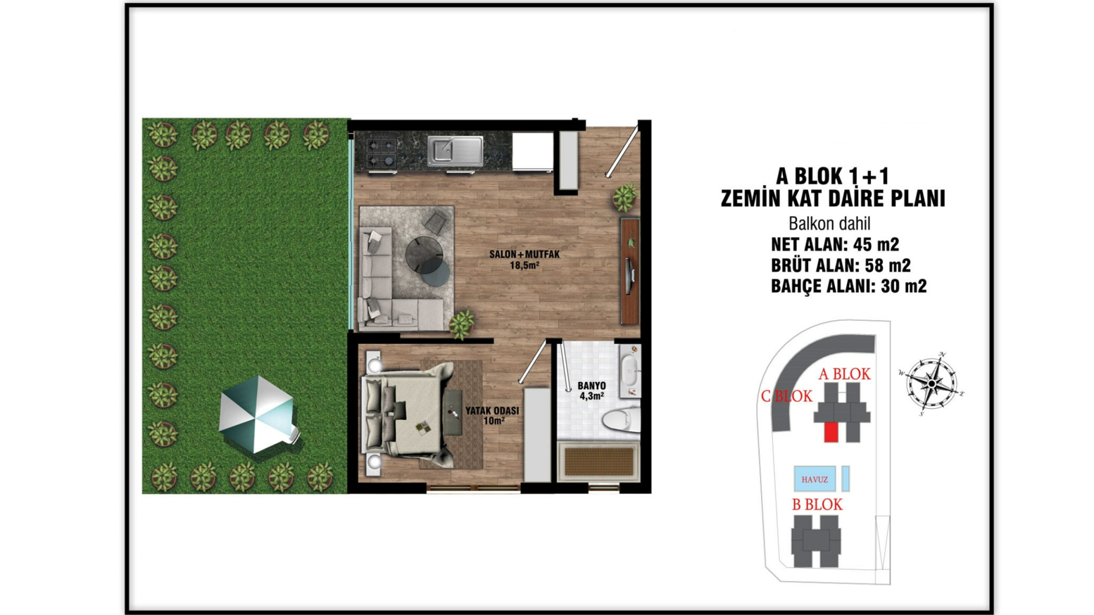 - 1 bedroom ground floor properties are 58 gross m² (45 net m²) and include a living room, an open-plan kitchen, a bathroom, and a garden (30 – 50 m²). (some include a terrace.)