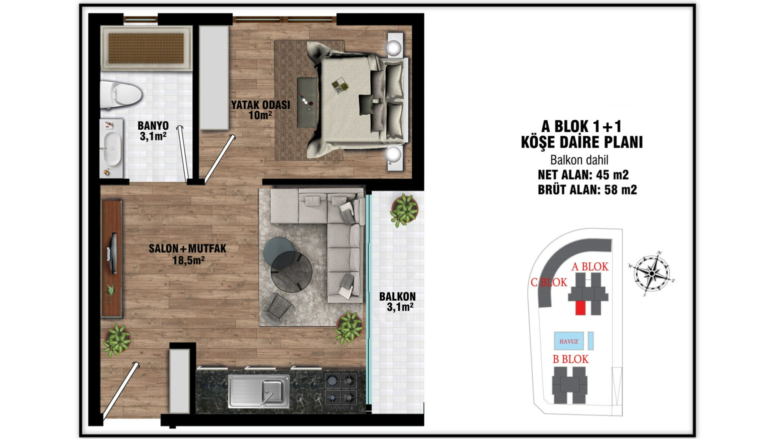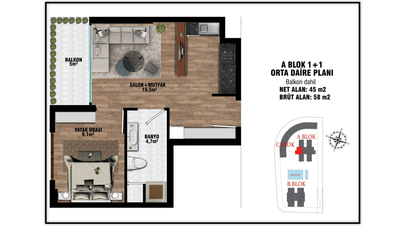 - 1 bedroom middle floor properties are 58 gross m² (45 net m²) and include a living room, an open-plan kitchen, a bathroom, and a balcony.