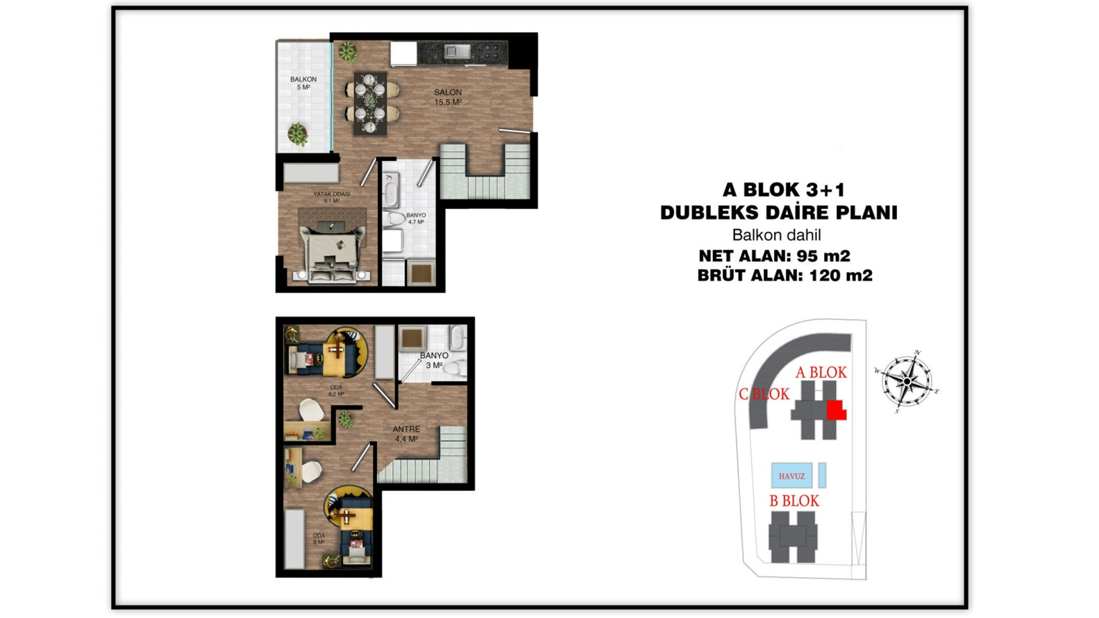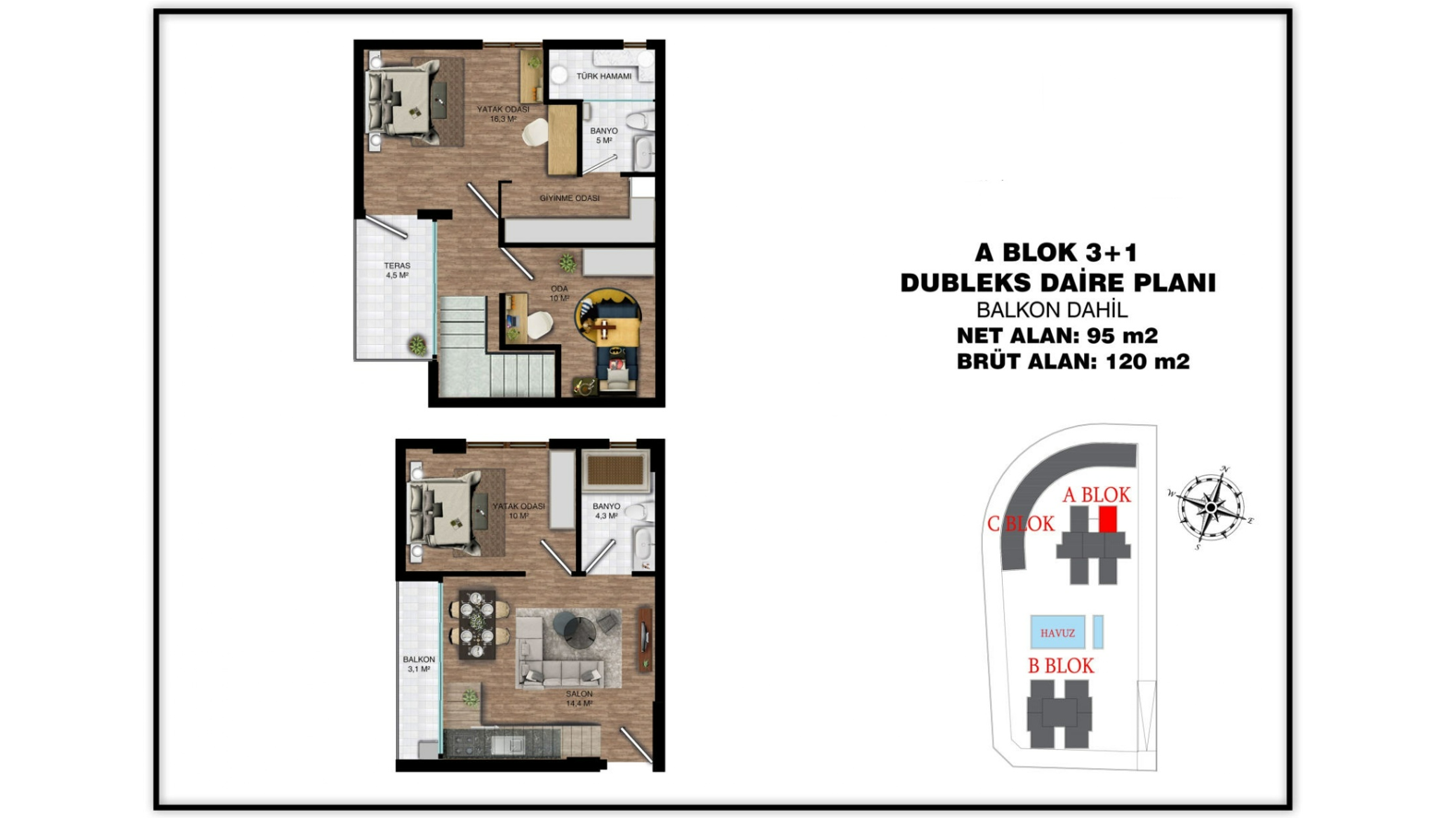 - 3 bedroom duplex properties are 120 gross m² (95 net m²) and include a living room, an open-plan kitchen, 2 bathrooms, and a balcony. (some include an additional dressing room and balcony).