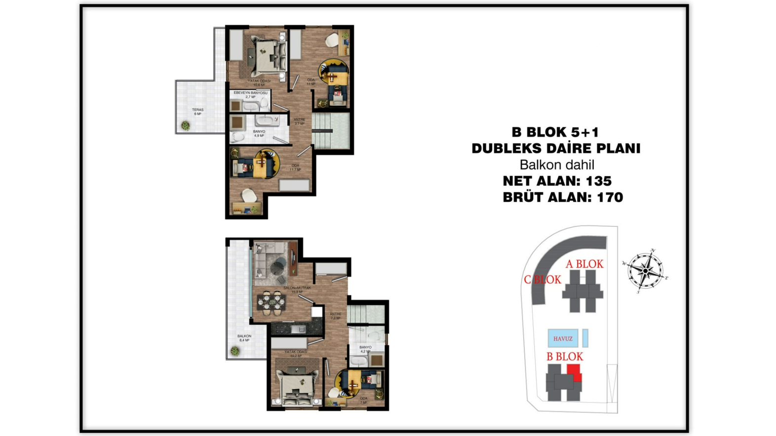 - 5 bedroom duplex properties are 170 gross m² (135 net m²) and include a living room, an open-plan kitchen, 2 bathrooms, an en-suite bathroom, and 2 balconies.