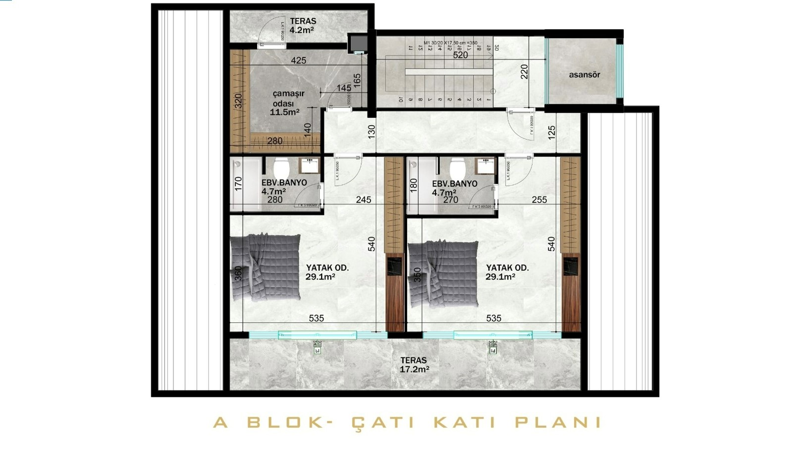 Luxurious villas in Tepe, Alanya are in a highly favorable location, being only 2 km to the city center, 2.2 km to the famous Cleopatra beach, and 40 km to Gazipasa International Airport.