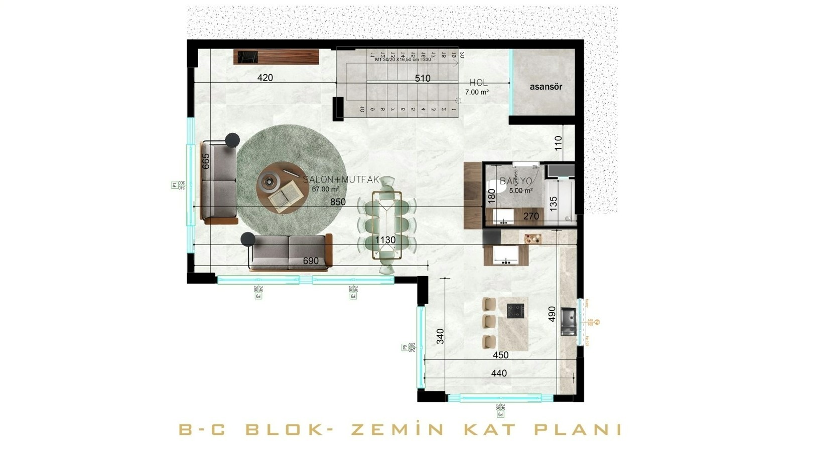 Exclusive villas in Alanya are fully equipped with top-quality interior features such as a smart home system, an elevator, a sea view jacuzzi, a fireplace, built-in kitchen & bathroom furniture, air conditioning, underfloor heating, electric shutters, central satellite system.