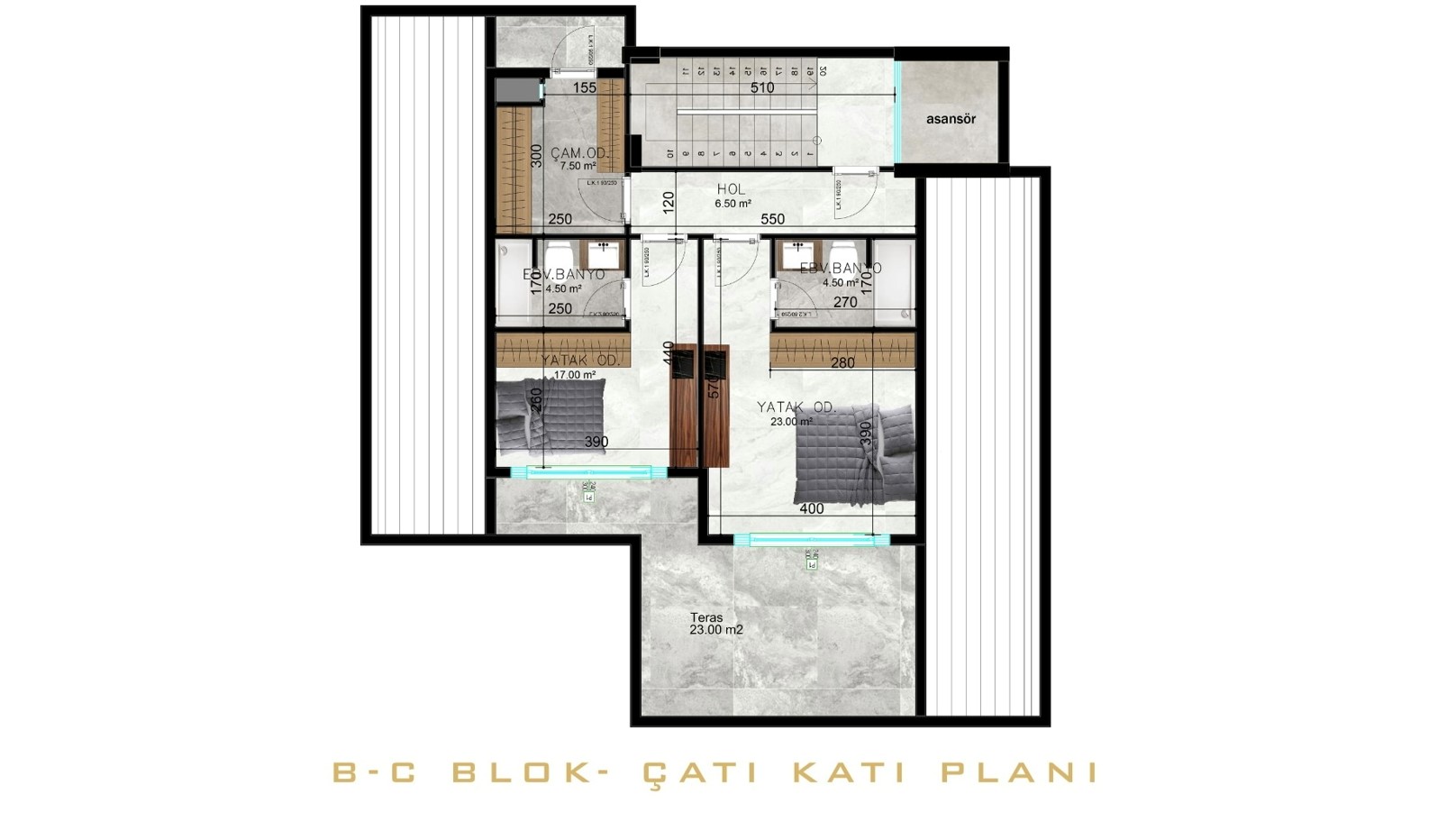 - Villas B and C are 346 gross m² (300 net m²) and include a living room, an open-plan kitchen, a bathroom, and an elevator on the ground floor. The next floor includes 2 bedrooms, 2 en-suite bathrooms, and a balcony. On the top floor, there are 2 bedrooms, 2 en-suite bathrooms, a laundry room, and 2 terraces.