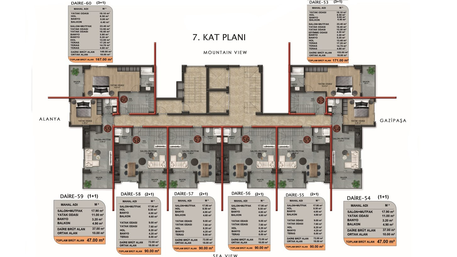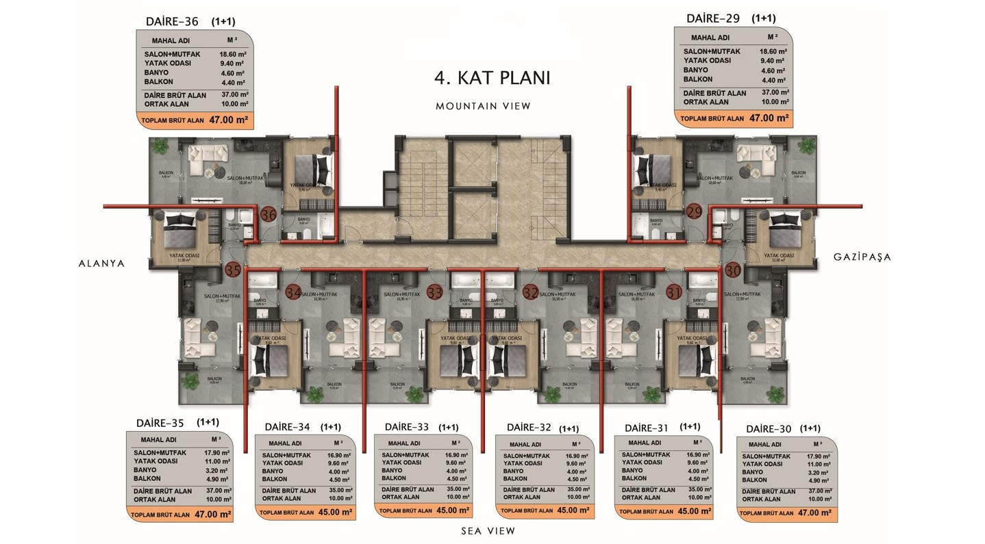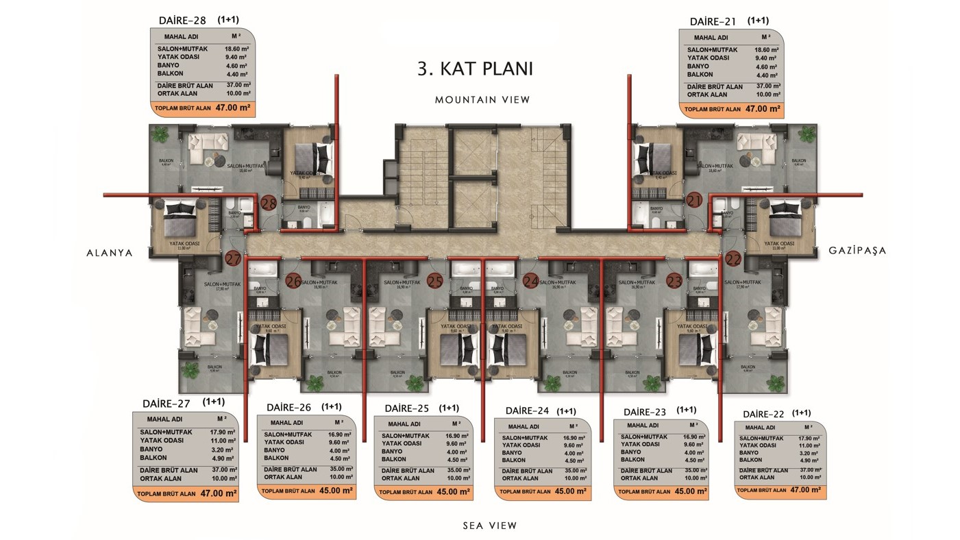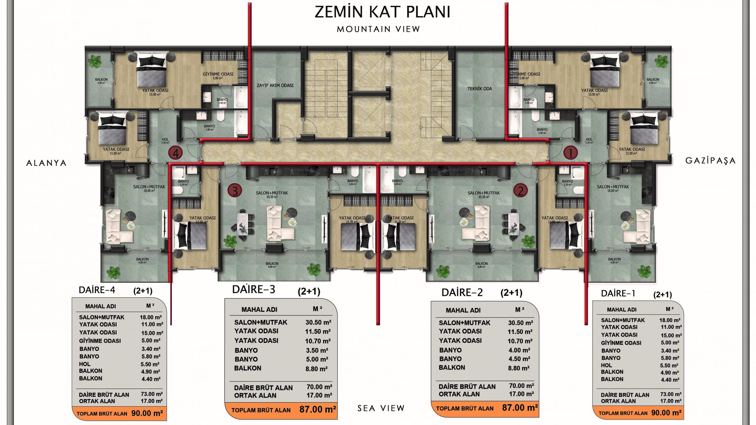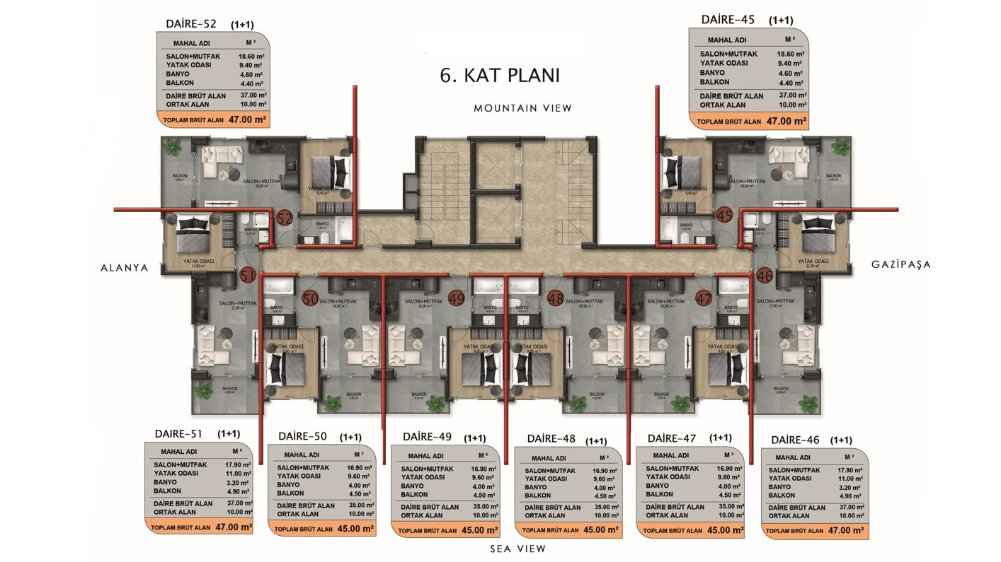 Luxurious flats in Gazipaşa, Antalya, are just a few steps to the nearest market, pharmacy, veterinarian, cafe, bus stop, 2 km to the beach, 17 km to Gazipaşa International Airport, and 24 km to Alanya center.
