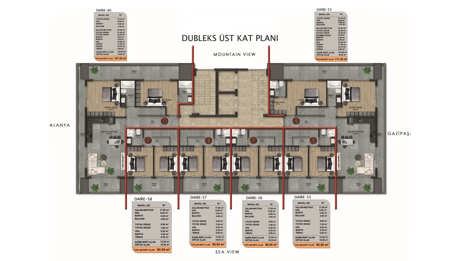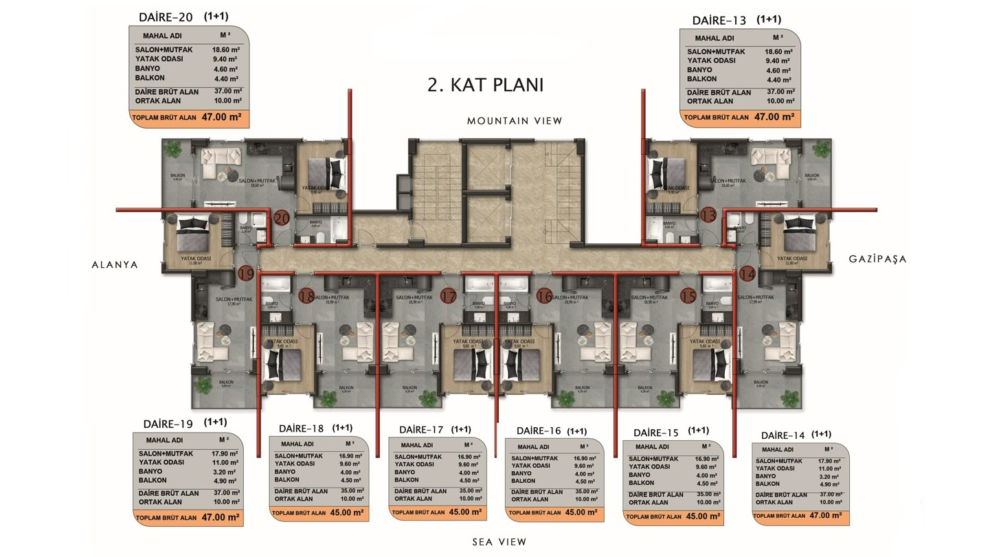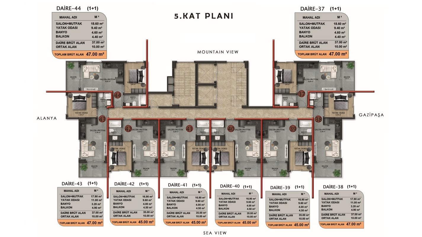 Built on a land area of 2,500 m², the luxurious residential complex is situated in a great location that offers both sea and mountain views. The complex incorporates a 5-star hotel concept that offers its residents exceptional services and facilities such as an outdoor swimming pool, children’s pool, indoor pool, jacuzzi, fitness center, Turkish bath, steam room, massage room, resting room, lobby, reception, cafeteria, well-designed garden, sitting areas, barbeque area, car parking area, bike parking area, 24/7 security & surveillance, and a private shuttle service to the beach.