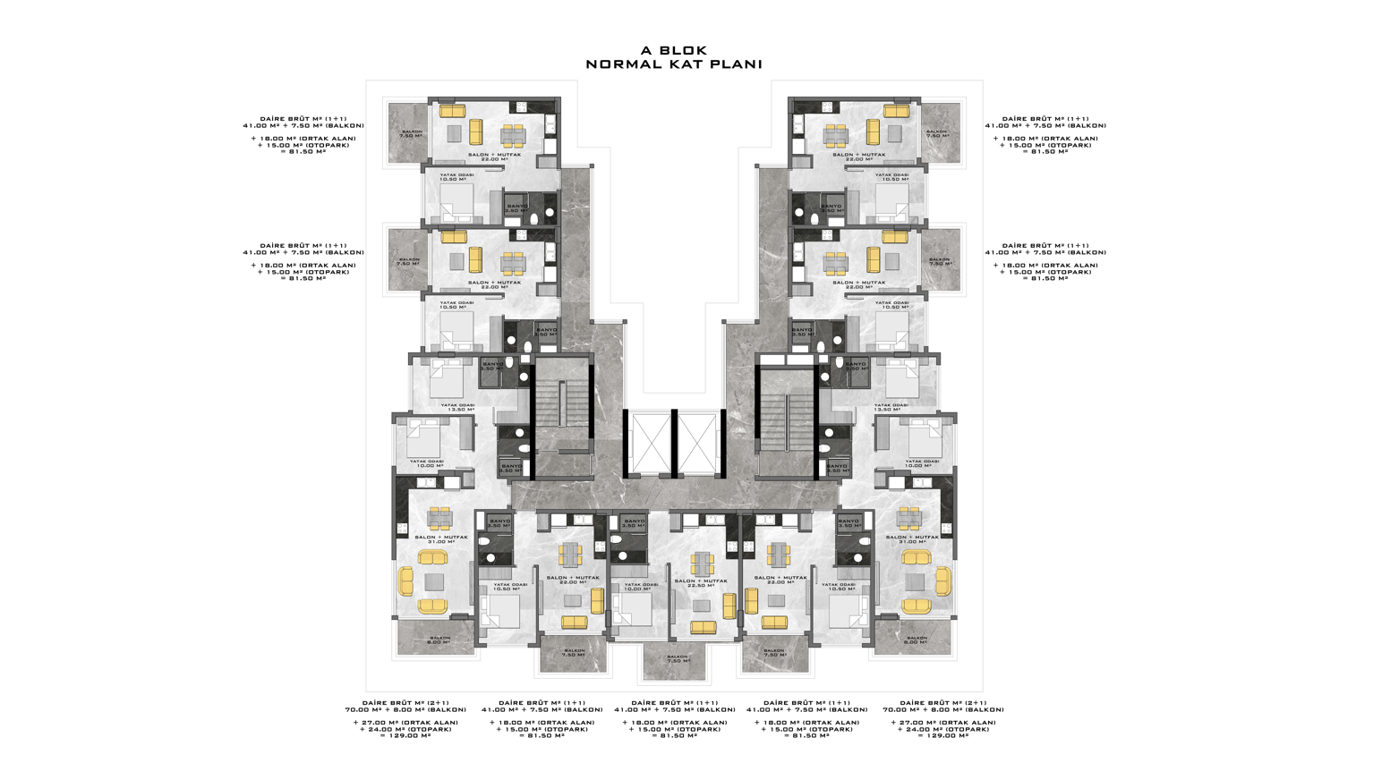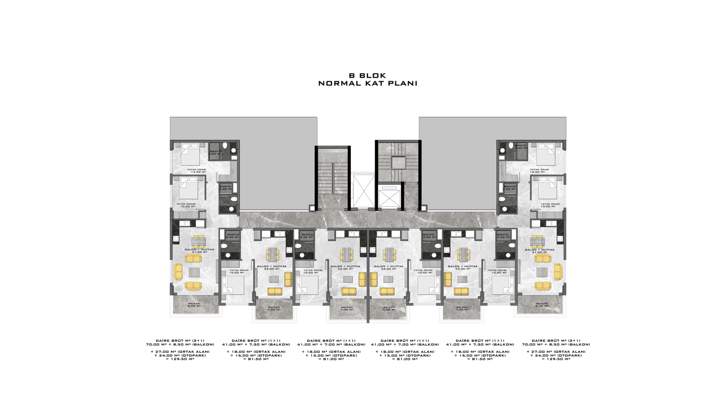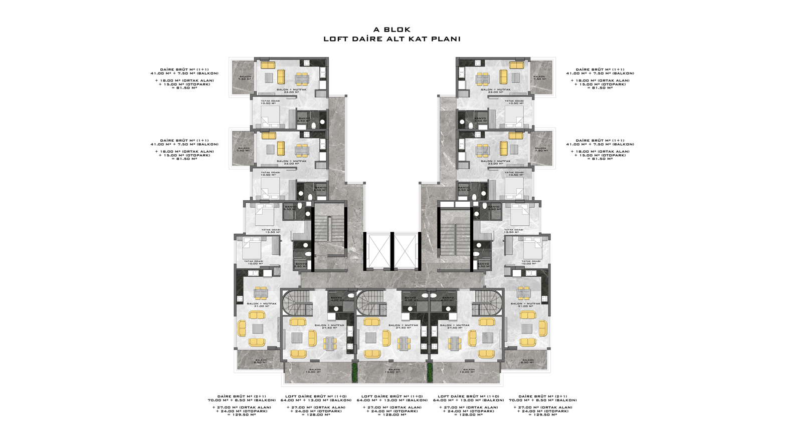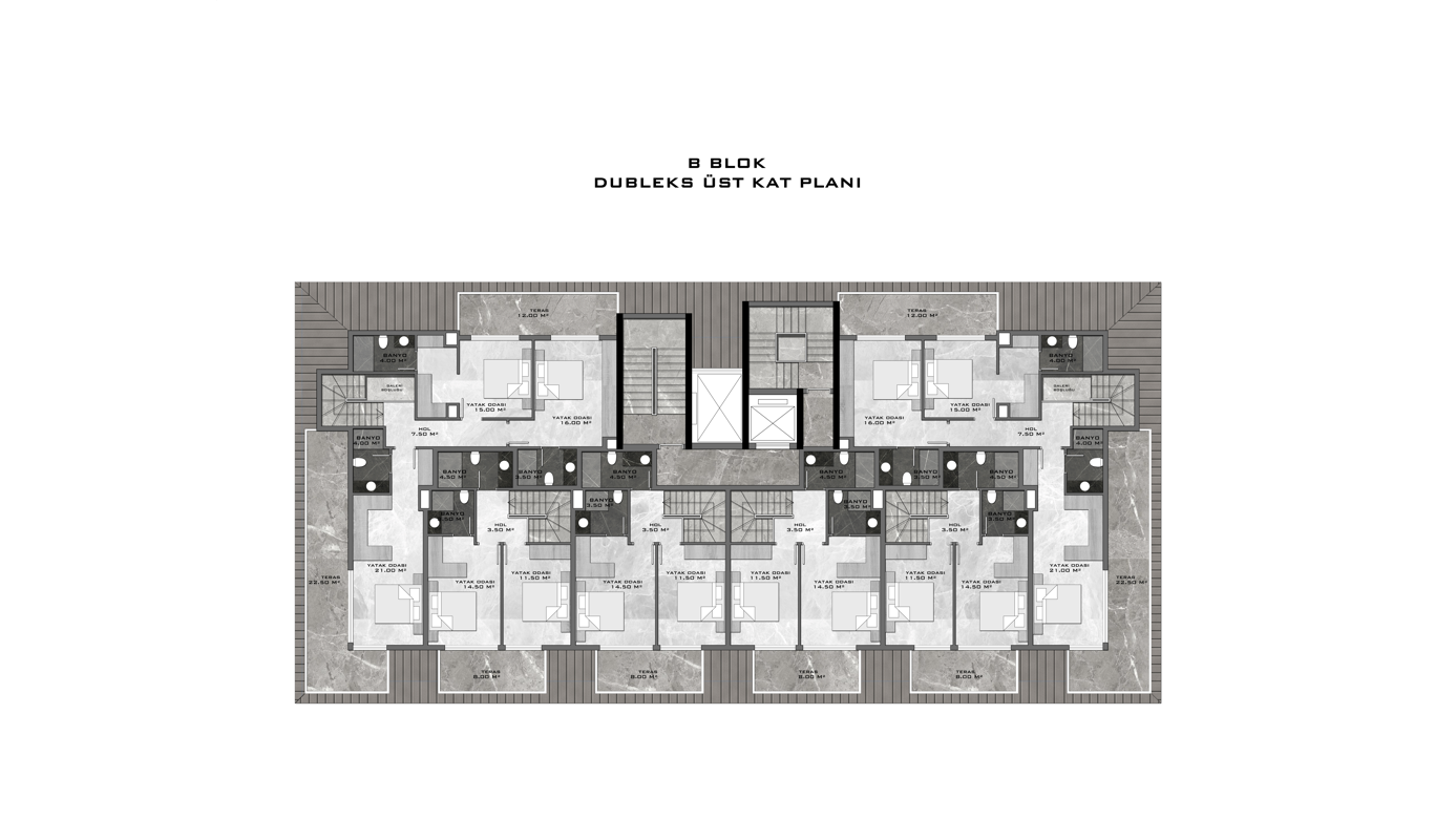 - 2 yatak odalı dubleks daireler, bir oturma odası, açık plan mutfak, 2 banyo, bir balkon ve bir teras ile 102 – 141 m²’dir.