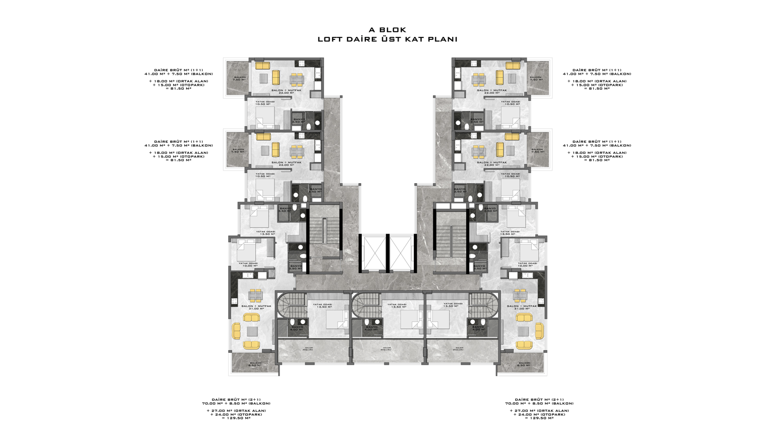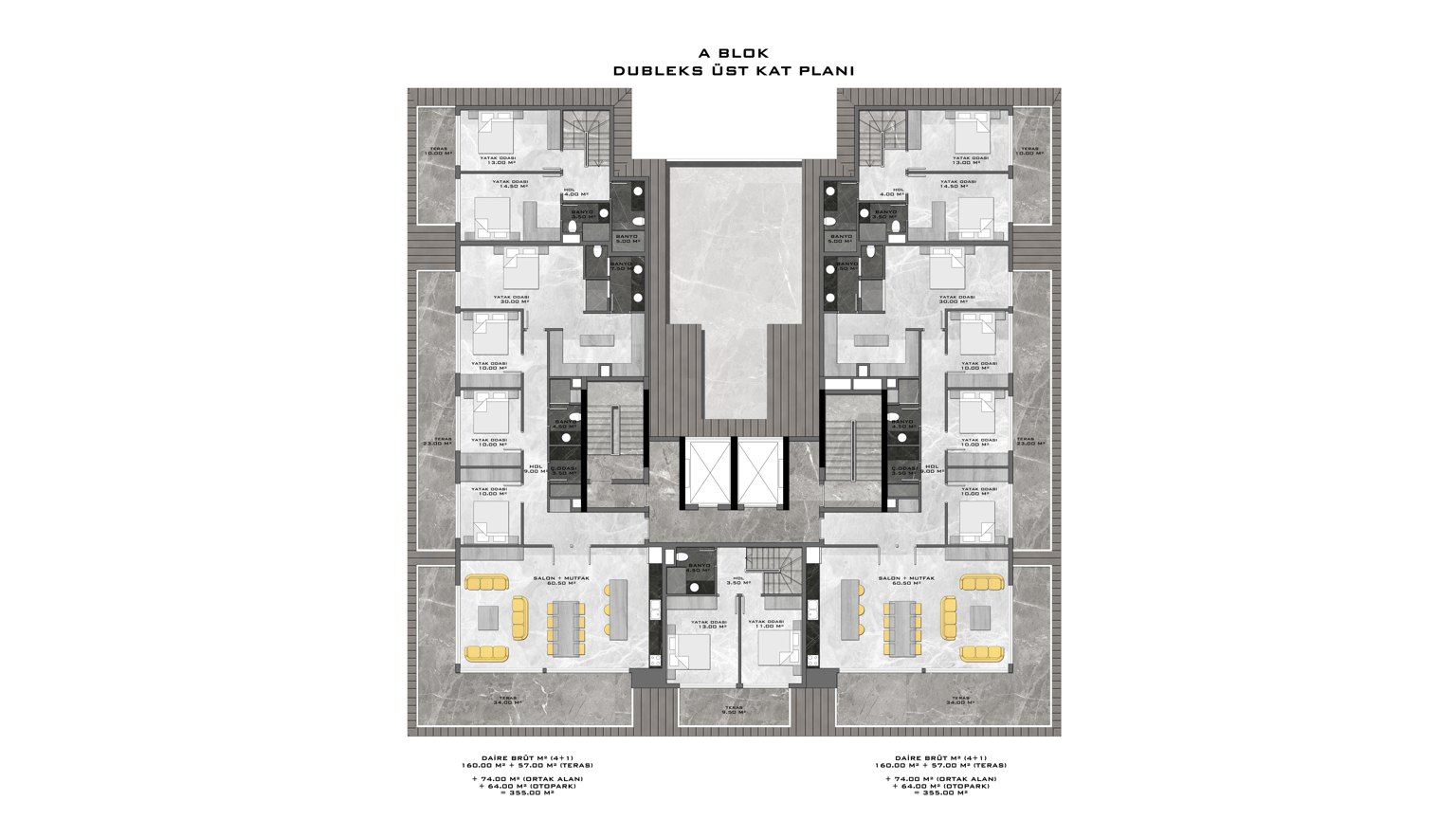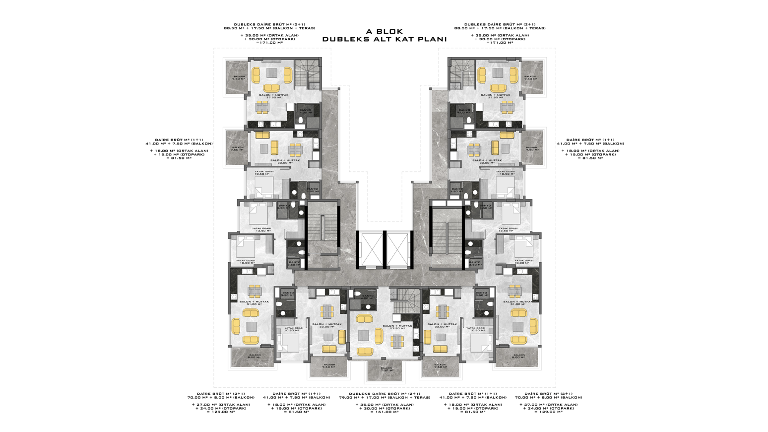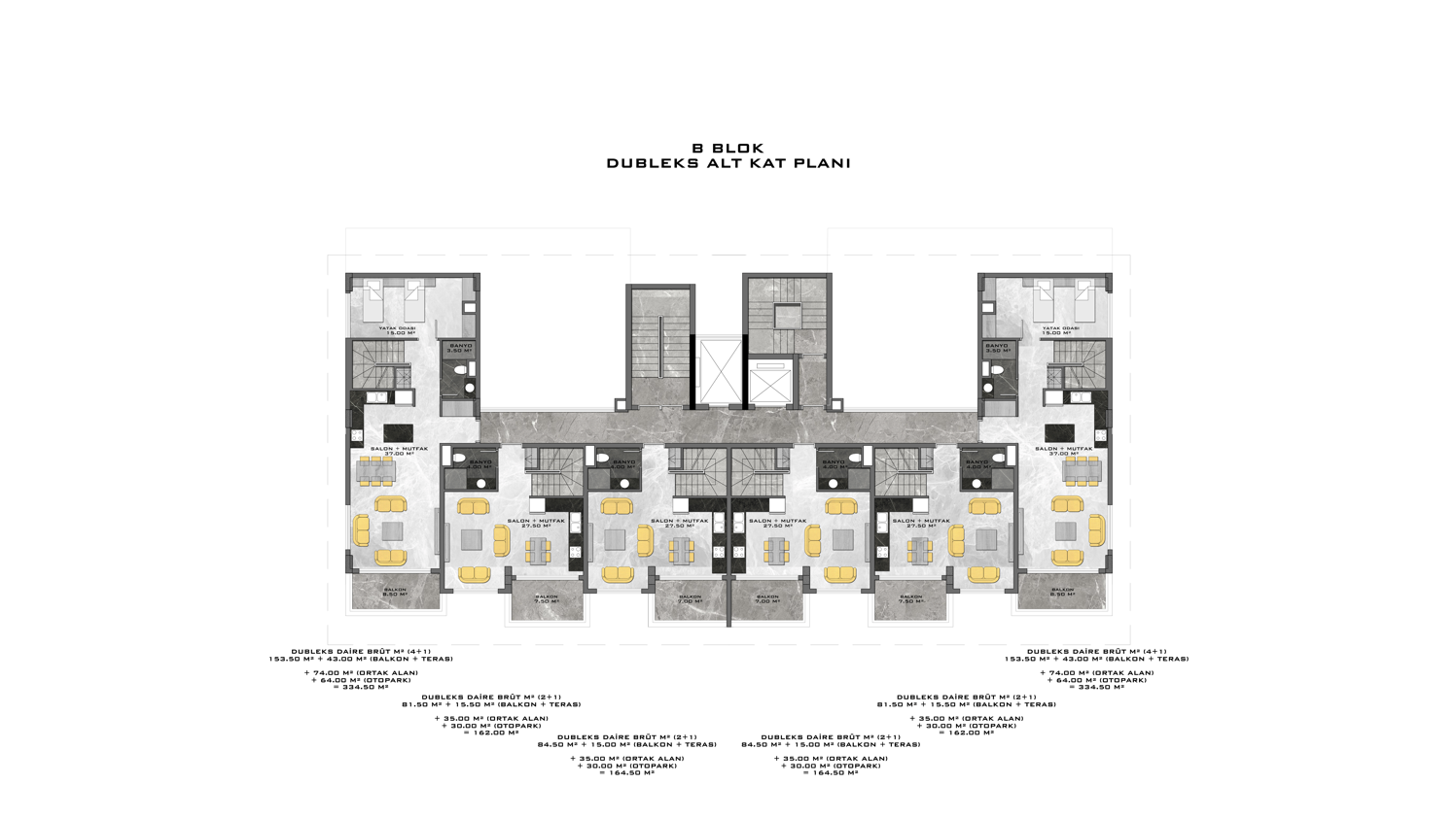 - 4 yatak odalı dubleks daireler, bir oturma odası, açık plan mutfak, 2 banyo, bir balkon ve bir teras ile 271 m²’dir.