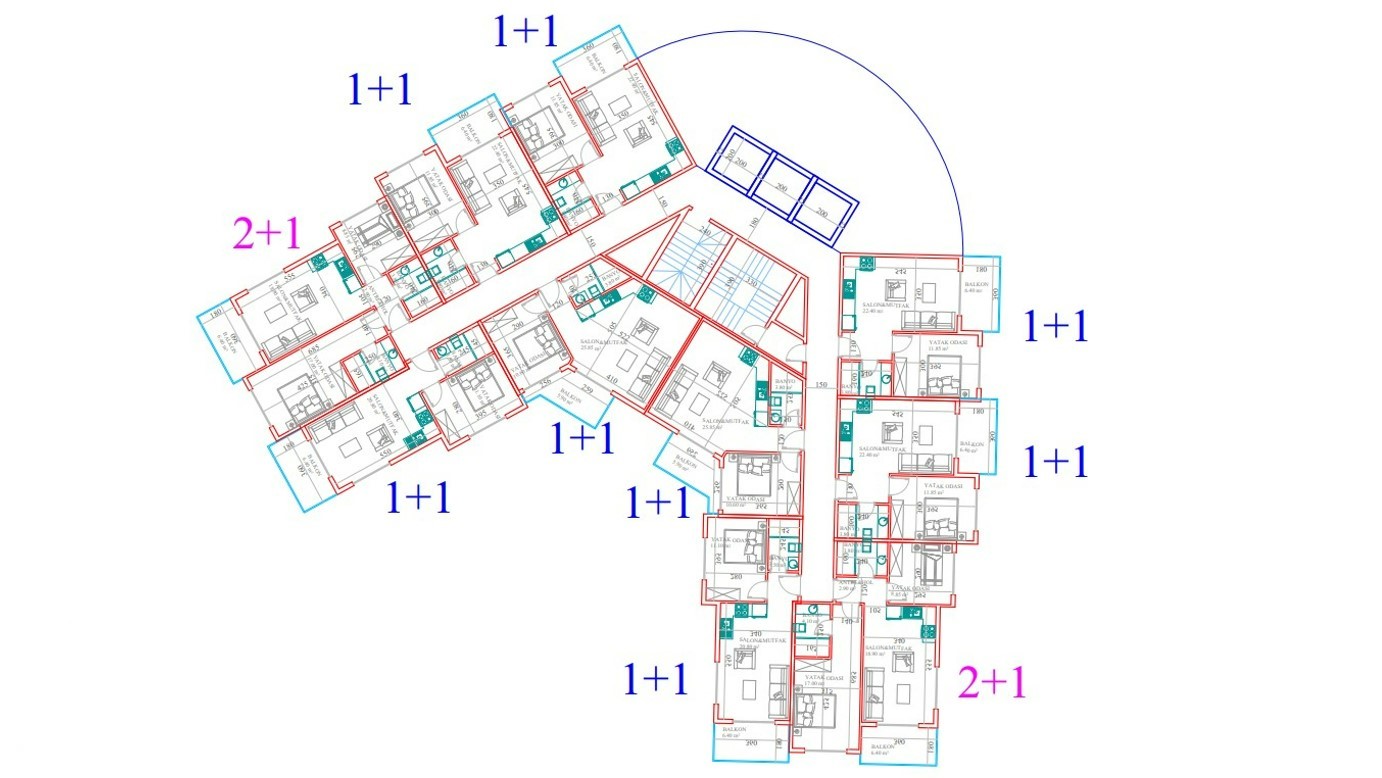 - 1 yatak odalı daireler bir oturma odası, bir açık plan mutfak, bir banyo ve bir balkon ile birlikte 50 m²’dir.
