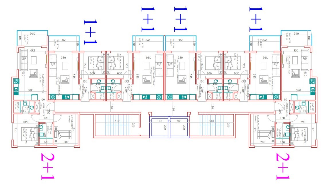 - 2 yatak odalı daireler bir oturma odası, bir açık plan mutfak, bir banyo, bir ebeveyn banyo ve bir balkon ile birlikte 70 m²’dir.
